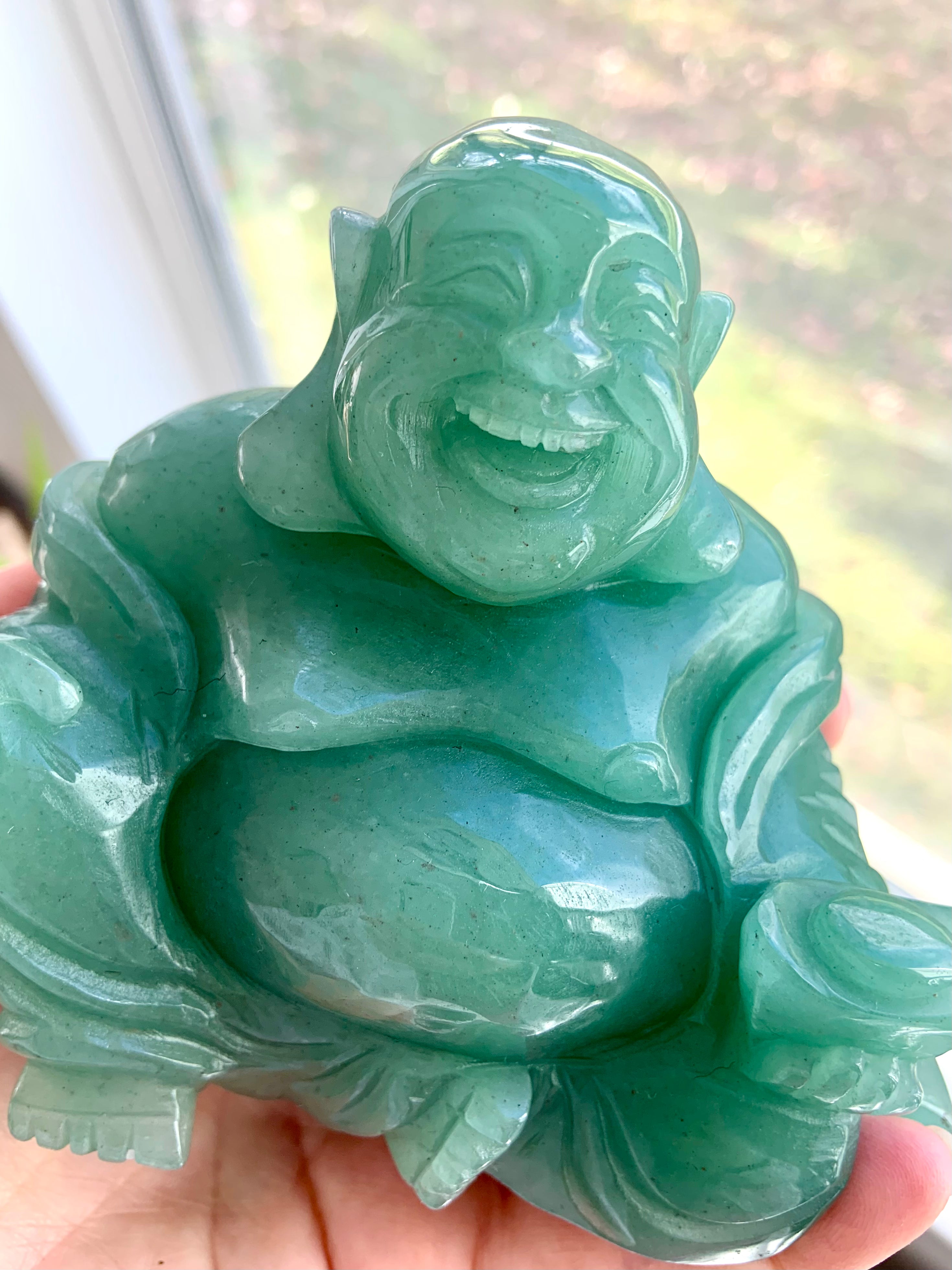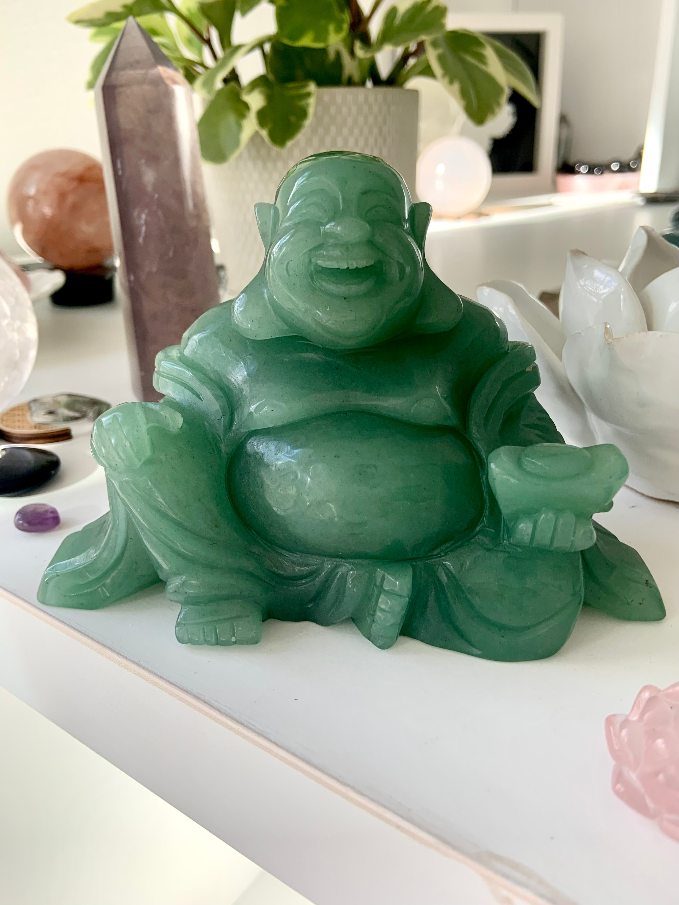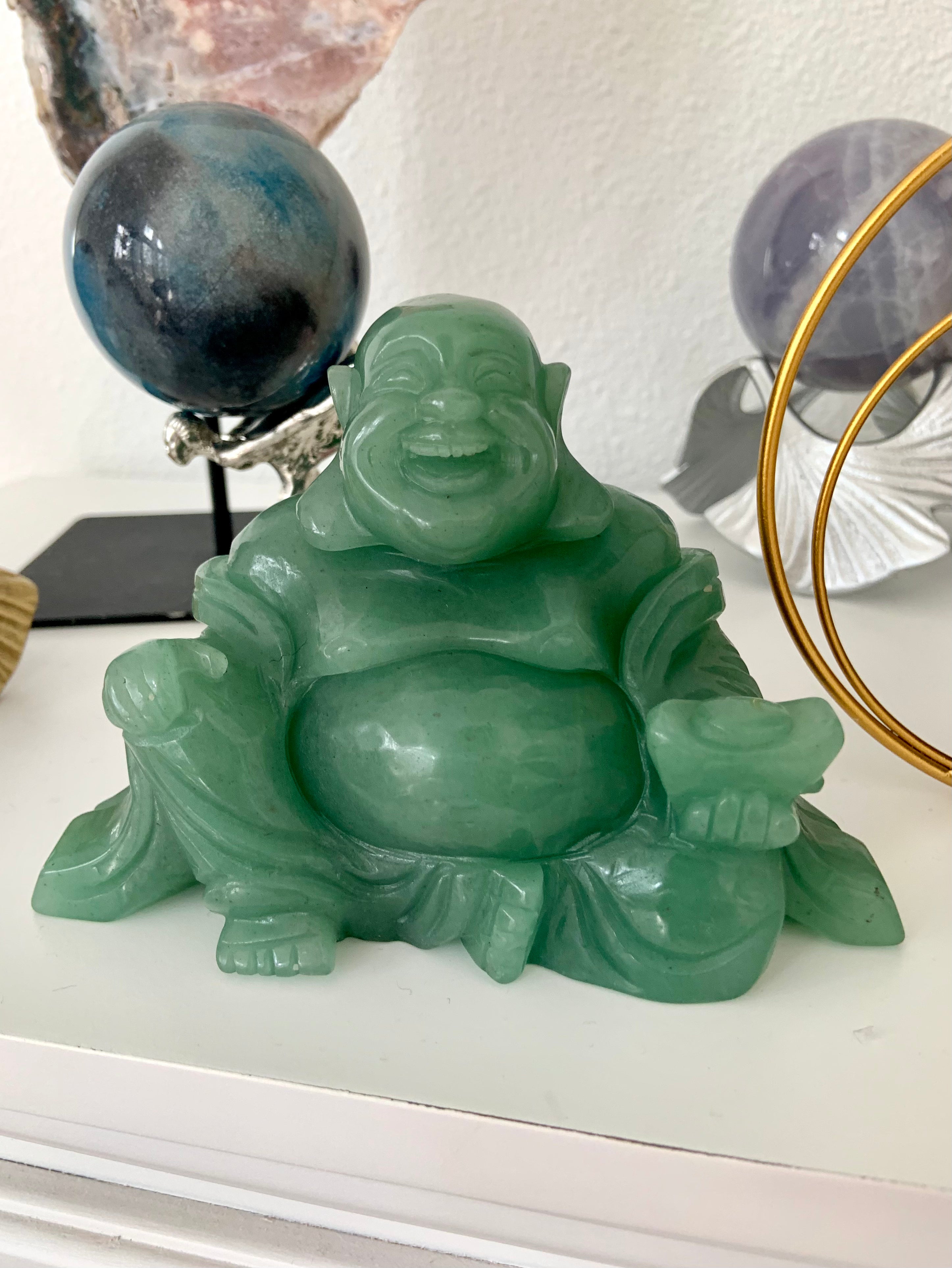 A Green Aventurine Happy Buddha brings joy, good luck + prosperity into your home. Place your Happy Buddha facing the door to greet you + your visitors with his welcoming, joyful energy.