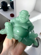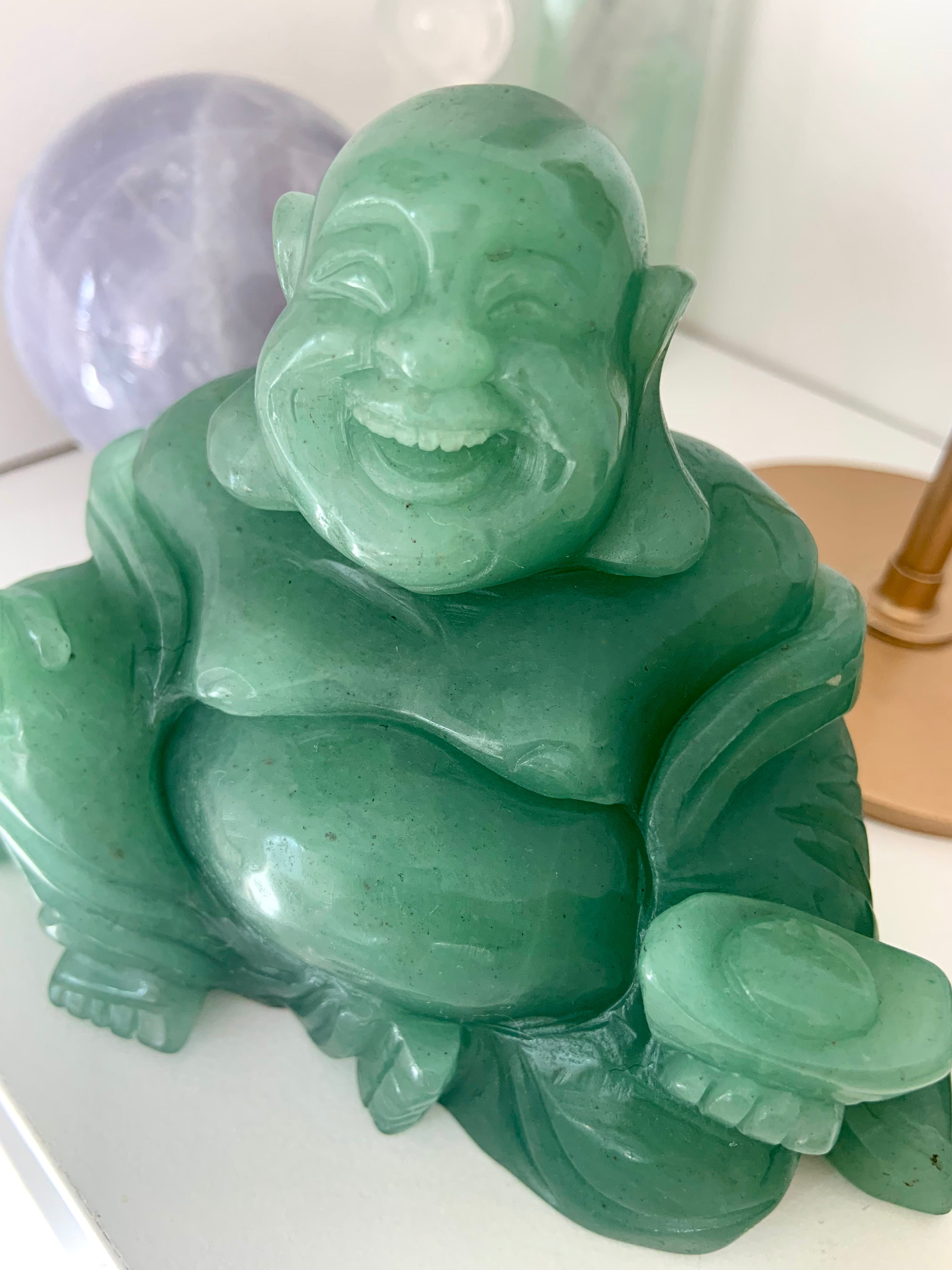 This large crystal Buddha Statue is hand carved from a beautiful green crystal called Aventurine, a crystal that resonates with the energies of abundance + good fortune. A Green Aventurine Happy Buddha carving brings all the Zen vibes to your home, office, treatment room or meditation space + makes a great gift.