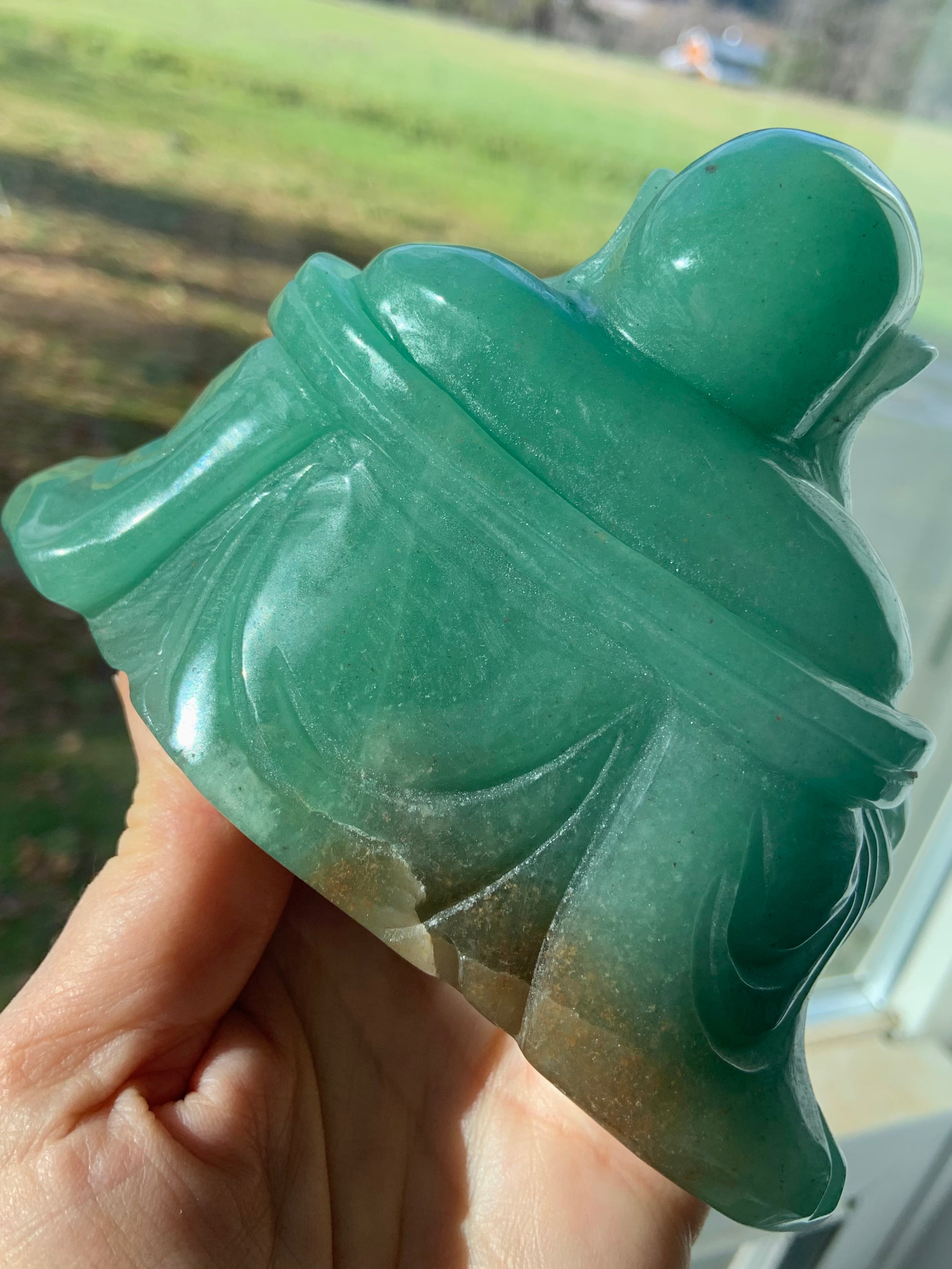This one of a kind green crystal Buddha statue is a made from high quality stone with the coveted Aventurescence sparkle. I took $50 off normal retail because there is a red aventurine inclusion on the back + a natural line within the stone shown in the last few pics. This is a lighter shade of green with lovely translucence + a little sparkle in the stone, a stunning statement piece to elevate your sacred space. The sparkle didn't translate in the photos, but it's visible in direct sunlight.