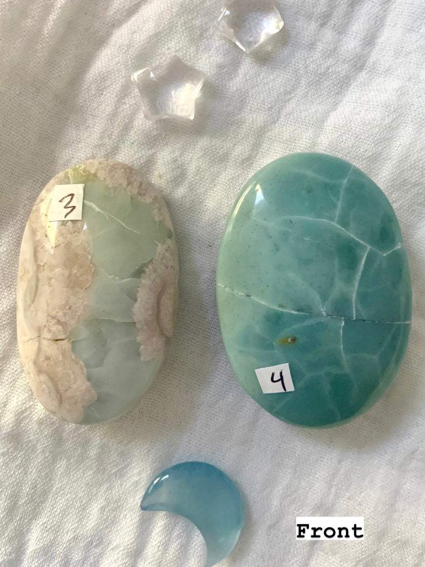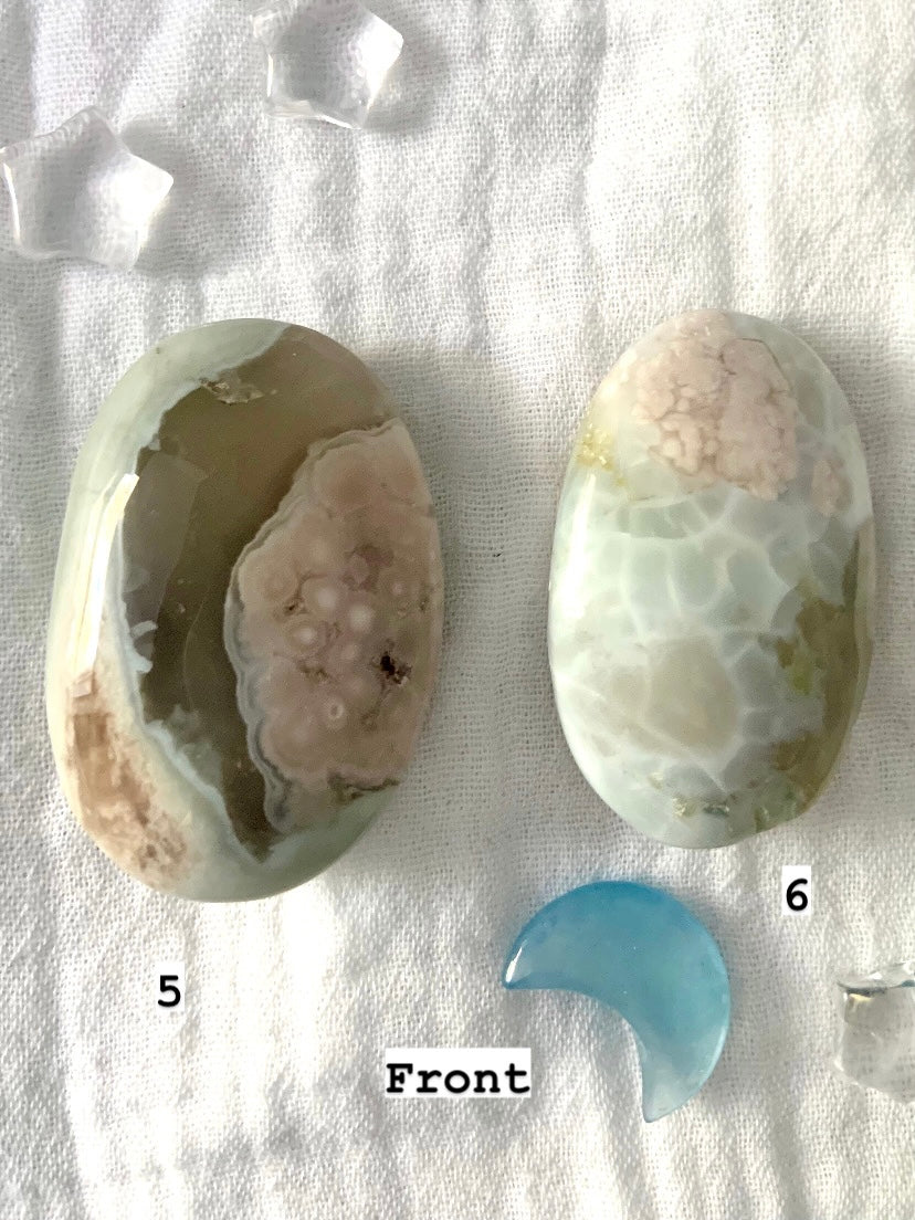 You will receive the exact crystal palmstone you select from the pics/dropdown menu. Each piece varies in size as shown + described above as well as natural variances in pattern, color, clarity, opacity + translucence. These polished agates look different on all sides + in different lighting.