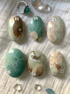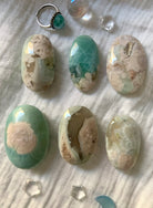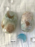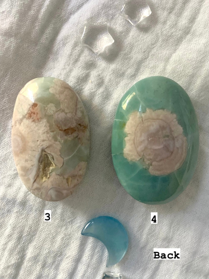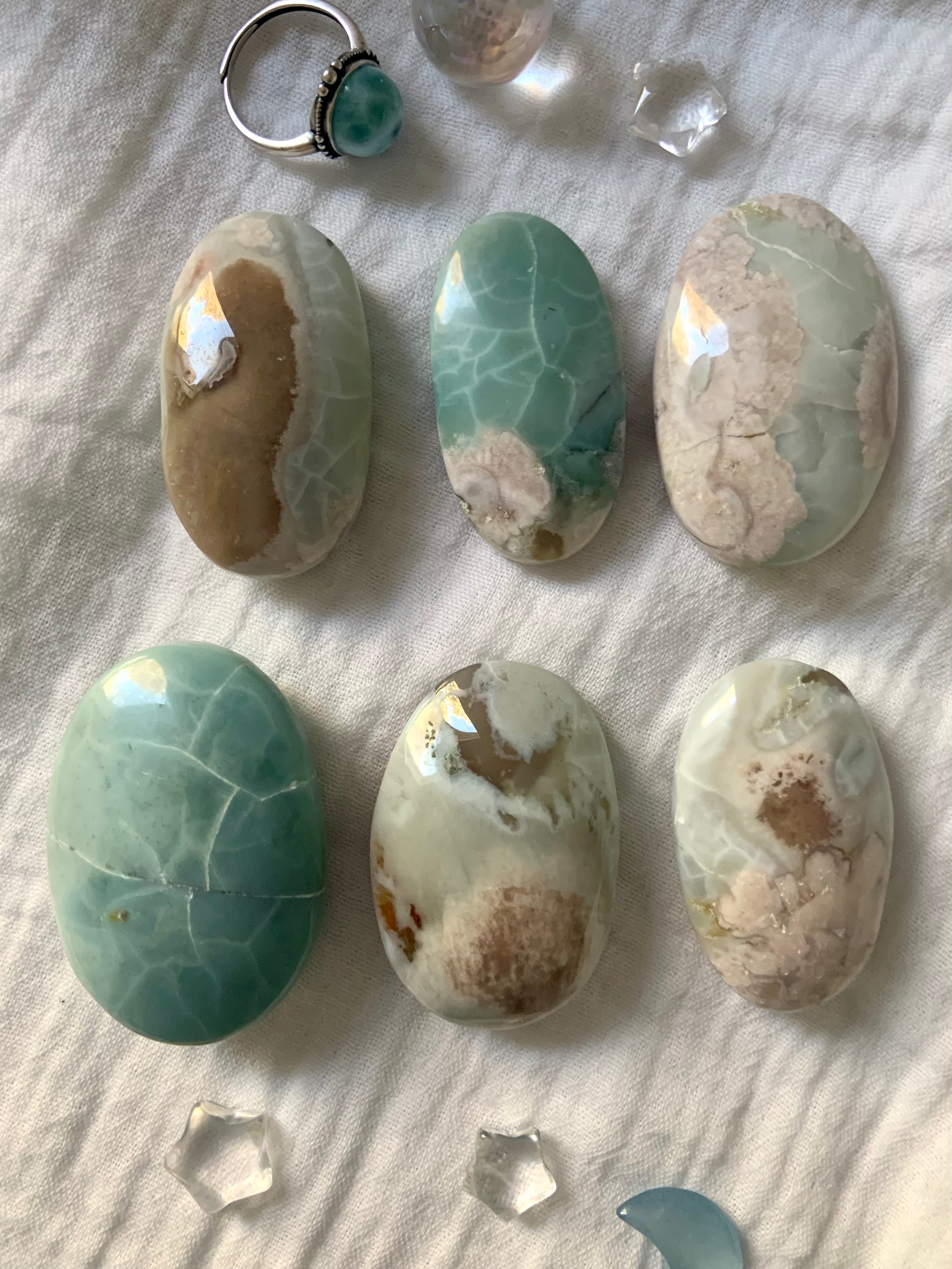 These rare + coveted Blue-Green Flower Agate palmstones are so dreamy + beautiful. From the saturated Tiffany blue to creamy mint green, the colors in these flower agates are so soothing + dreamy contrasted with the pale pink cherry blossoms + bubbly patterns in the stones.