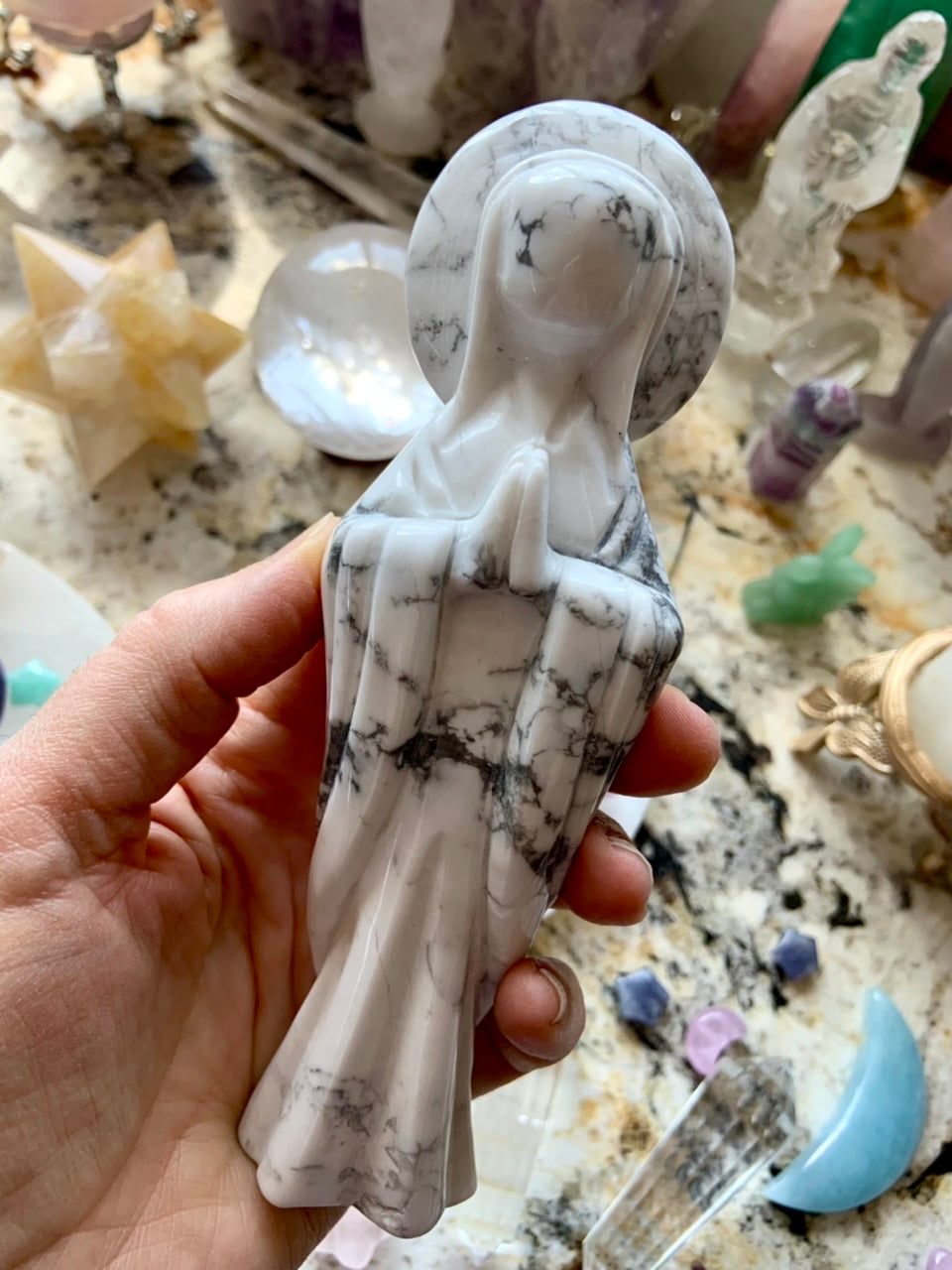 This elegant white Howlite Crystal Carving of Mother Mary emanates the energies of peace + divine, unconditional love. Her hands are in prayer position over her heart + she has a beautiful stone halo around her head.