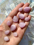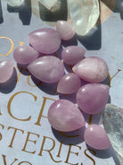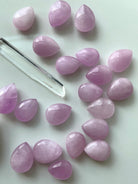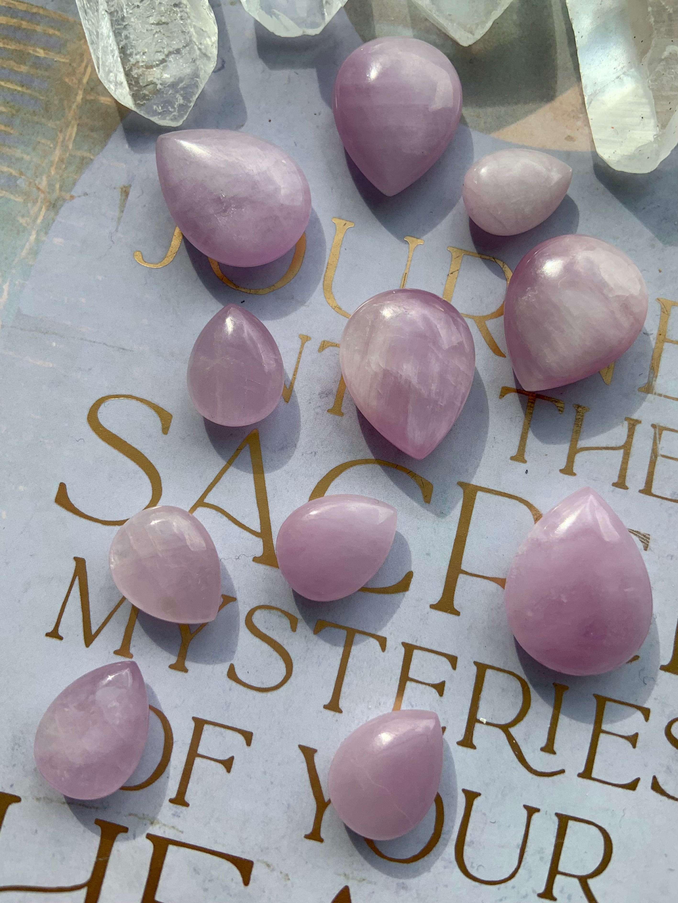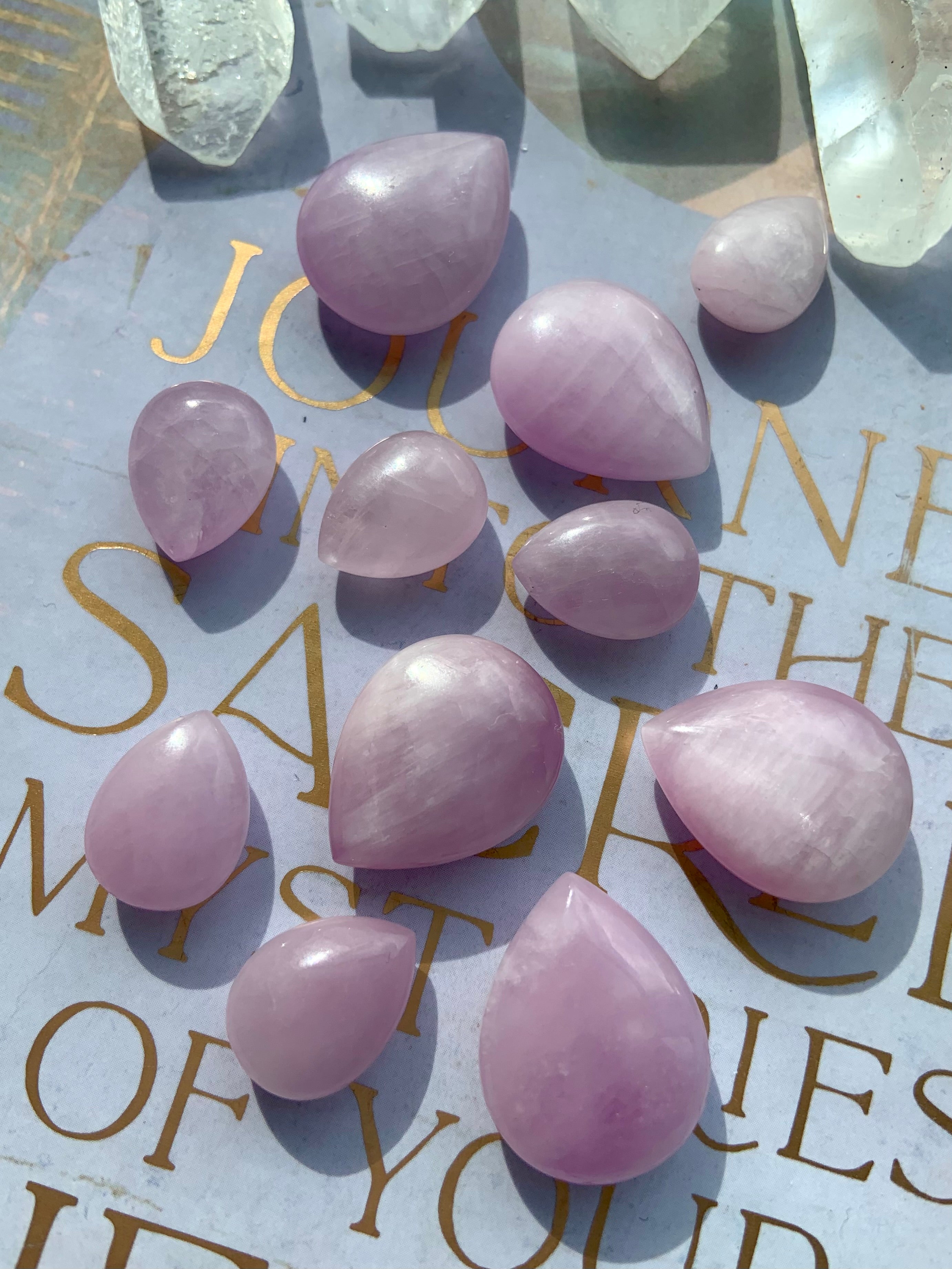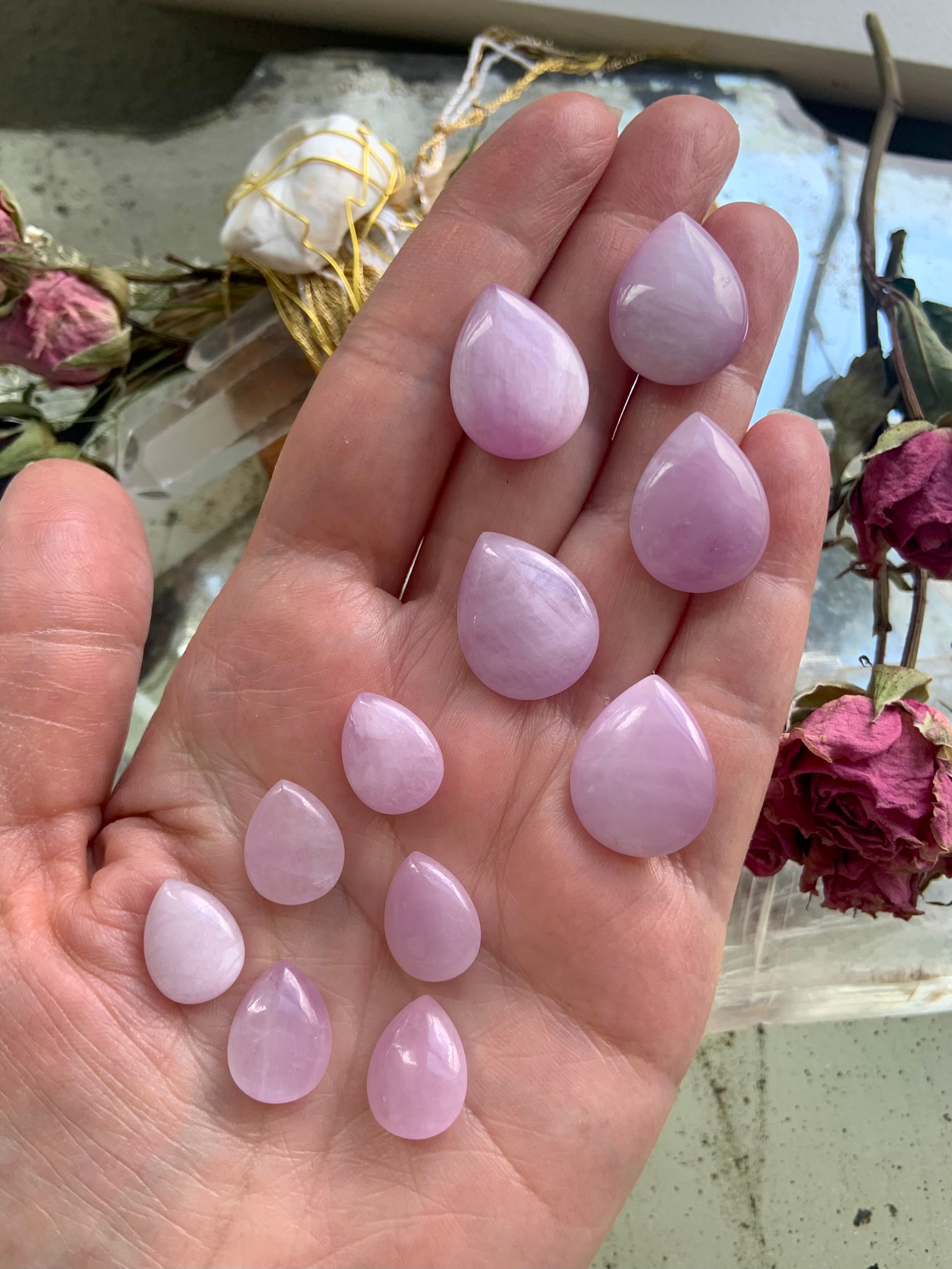 These Kunzite Crystal Teardrops are shimmery, polished mini shapes that would be lovely to use in your jewelry designs, wire-wrapped, as a sweet gift, or in your crystal grid creations. They're little + a very sweet, soft pink Kunzite with a delicate, velvety shimmer. Please check the size details below as they do look larger in the photos.