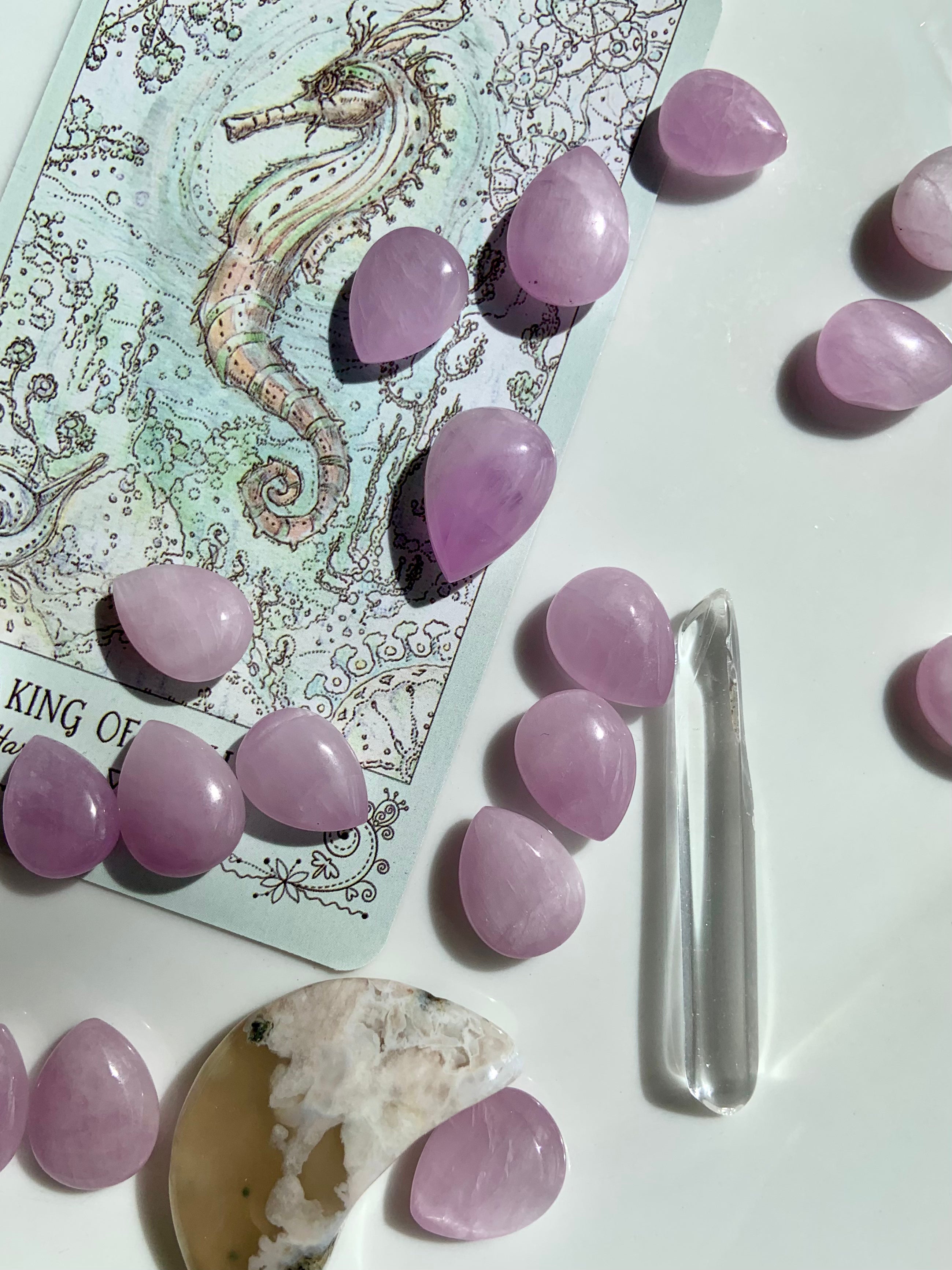 Kunzite is a deeply healing spiritual stone that spreads a loving vibration to every corner of life. It's energy permeates like water, juicy, cleansing + heavy in a good way, kinda like a cuddly bear hug.