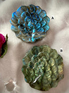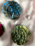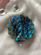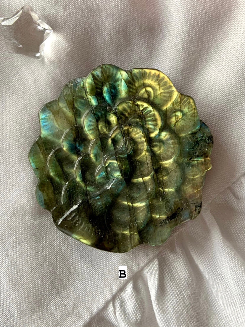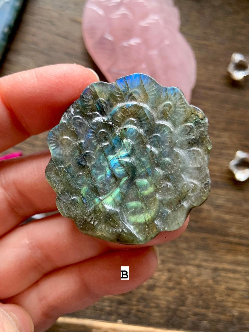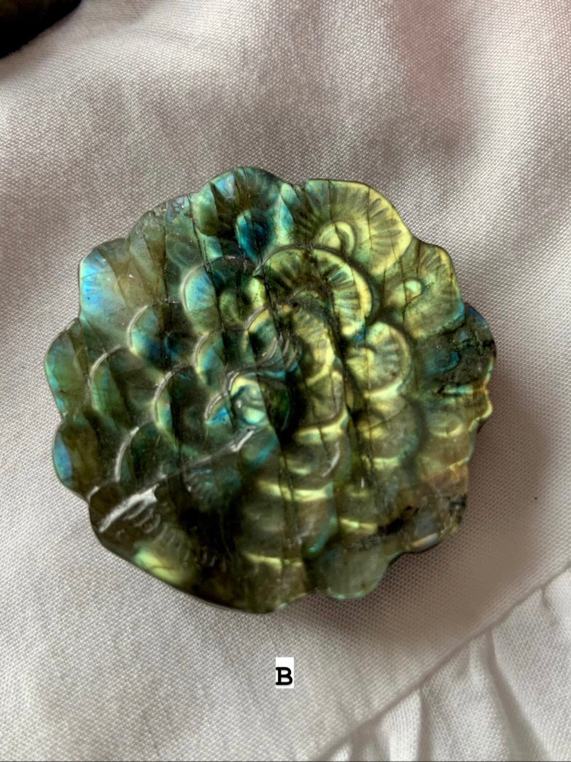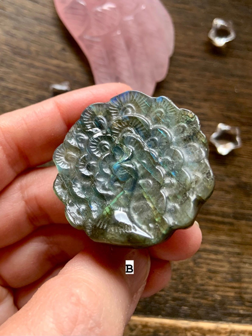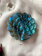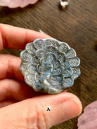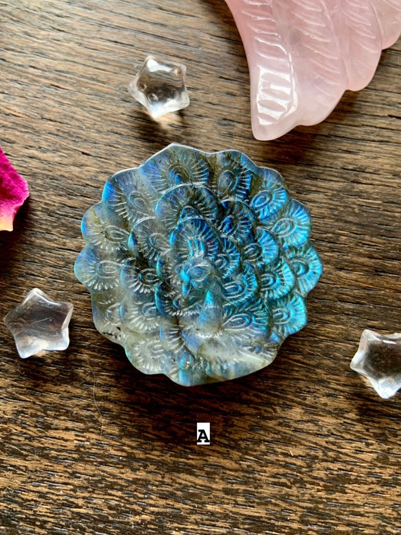 These labradorite peacock carvings shimmer with blue, green and/or golden hues just like a peacock feather! Hand carved from flashy labradorite with lovely details, these crystal peacocks would make a beautiful centerpiece for your crystal grid designs + be a thoughtful, treasured gift for any crystal collector or bird lover.