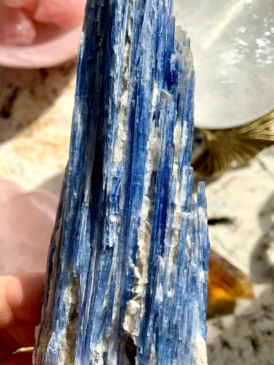 Due to the raw nature, columnar growth pattern, elongated crystal blades + mineral inclusions, these kyanite specimens can delicate, brittle + flaky.