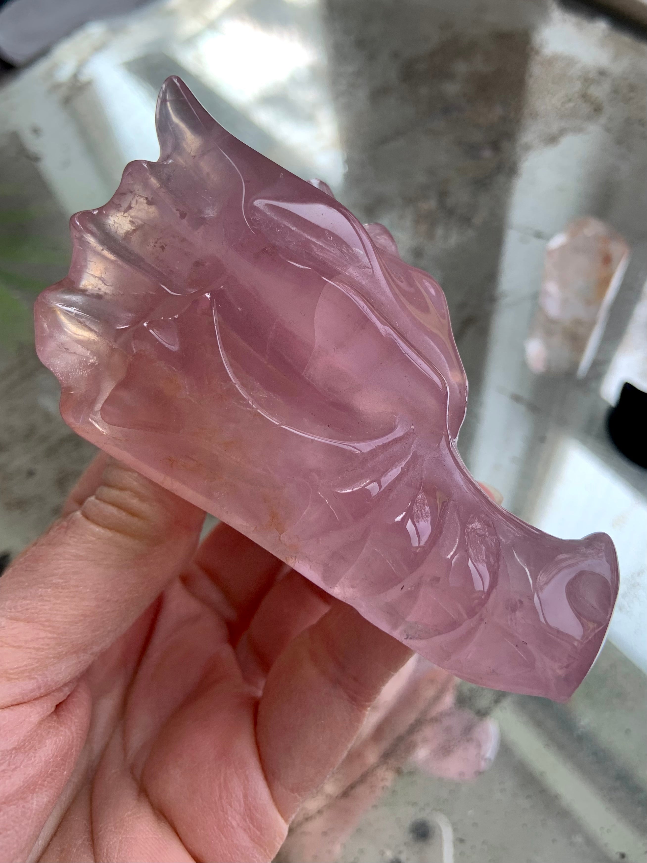 This beautifully carved crystal dragon is made of rare, translucent Lavender Rose Quartz with a ribbon of Golden Healer, a heart chakra stone stone that emanates the frequency of the Divine Feminine + unconditional love. This Purple Rose Quartz Dragon is a guardian stone with a fiercely protective, yet soft feminine energy.