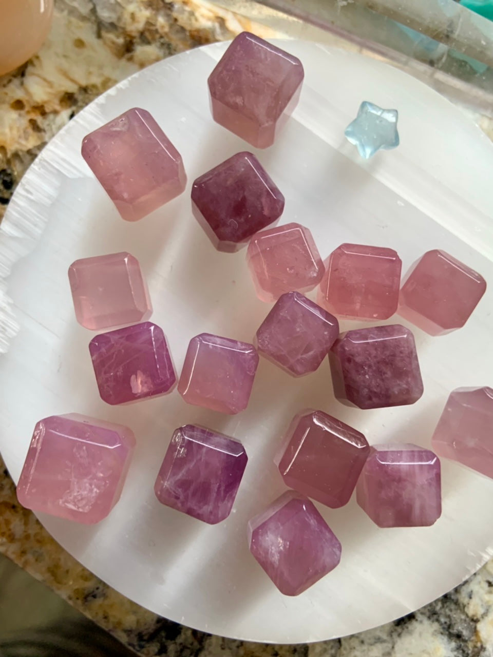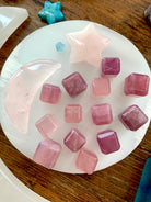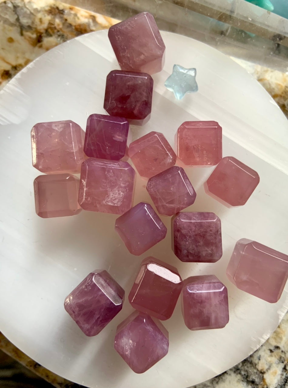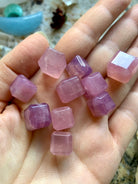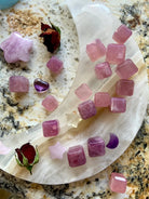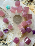 Each of these mini rose quartz crystal cube is unique + one of a kind. Some have milk quartz translucence, opaline girasol rose quartz properties rich purple rose quartz, and/or deep lavender blue rose quartz hues.