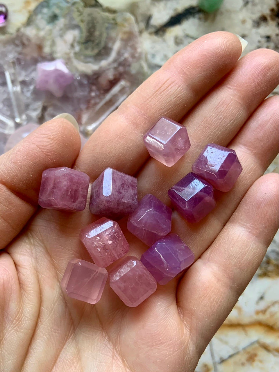 These tiny lavender rose quartz crystal cubes have a high quality polish + elegant beveled edges. They're all beautiful high gloss, smooth polished, gemmy + reflective crystal cube. Each piece is unique + there is significant variation that you can see in the pics. The colors range from pinkish lavender to pinkish purple to deep magenta or darker purple with varying levels of transparency as shown in the pics.