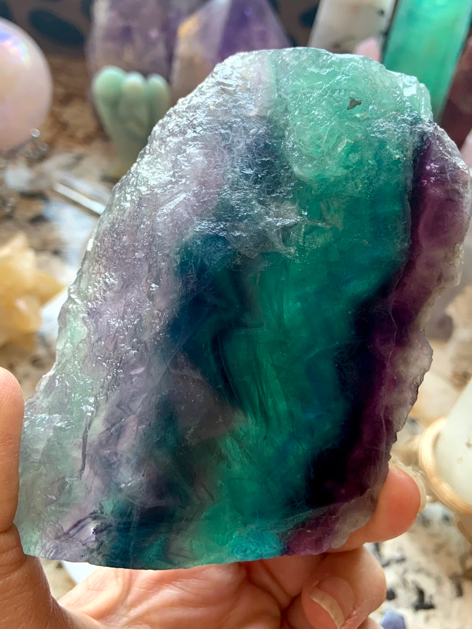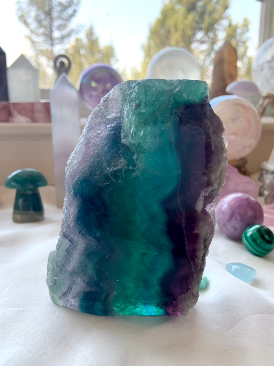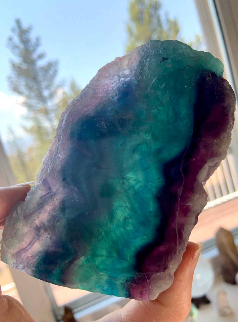 Fluorite has a grounding + harmonizing spiritual energy. Feel the grounding energy come through the bubbly raw natural stone edge + the glossy polished sides.