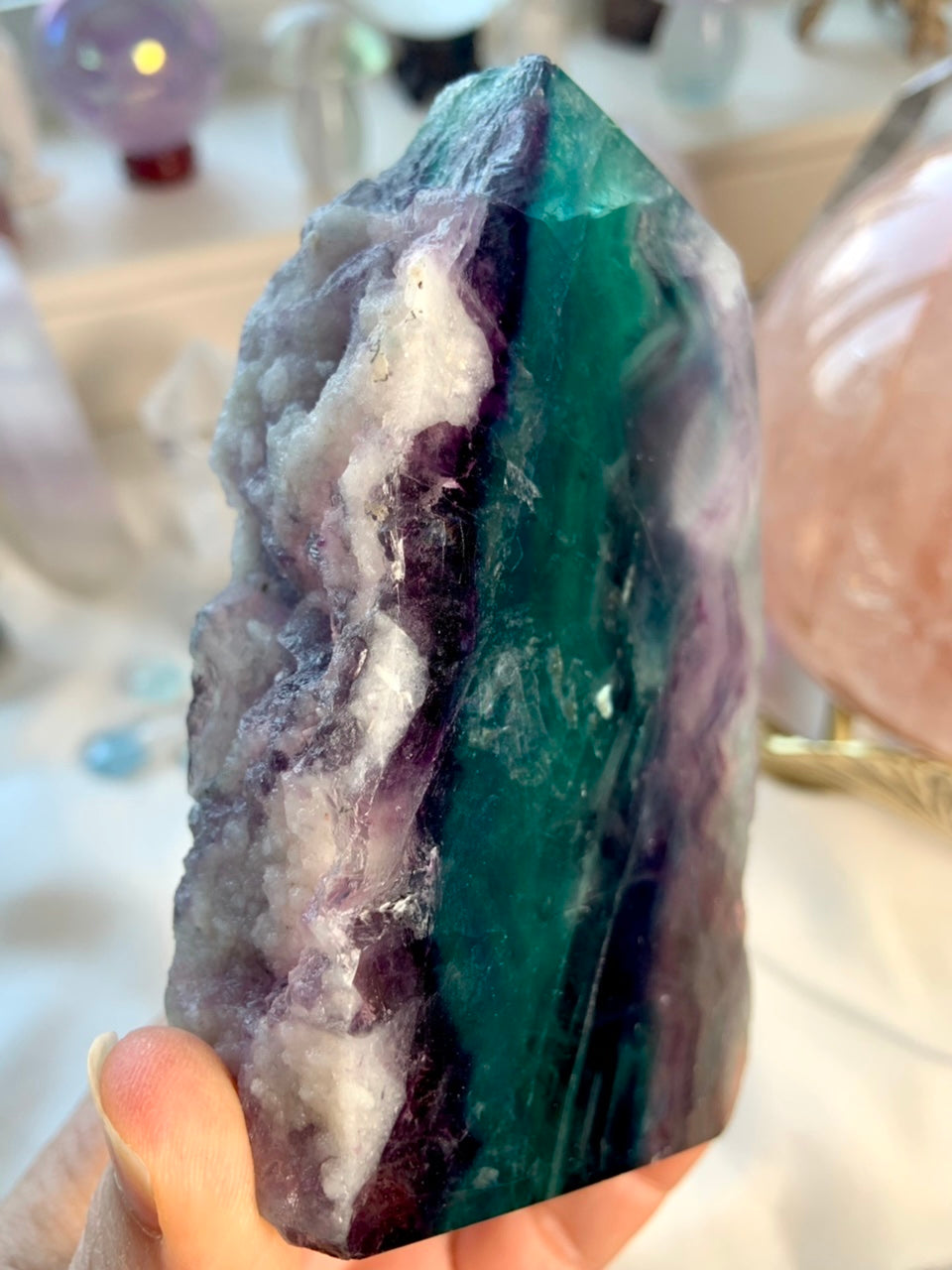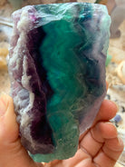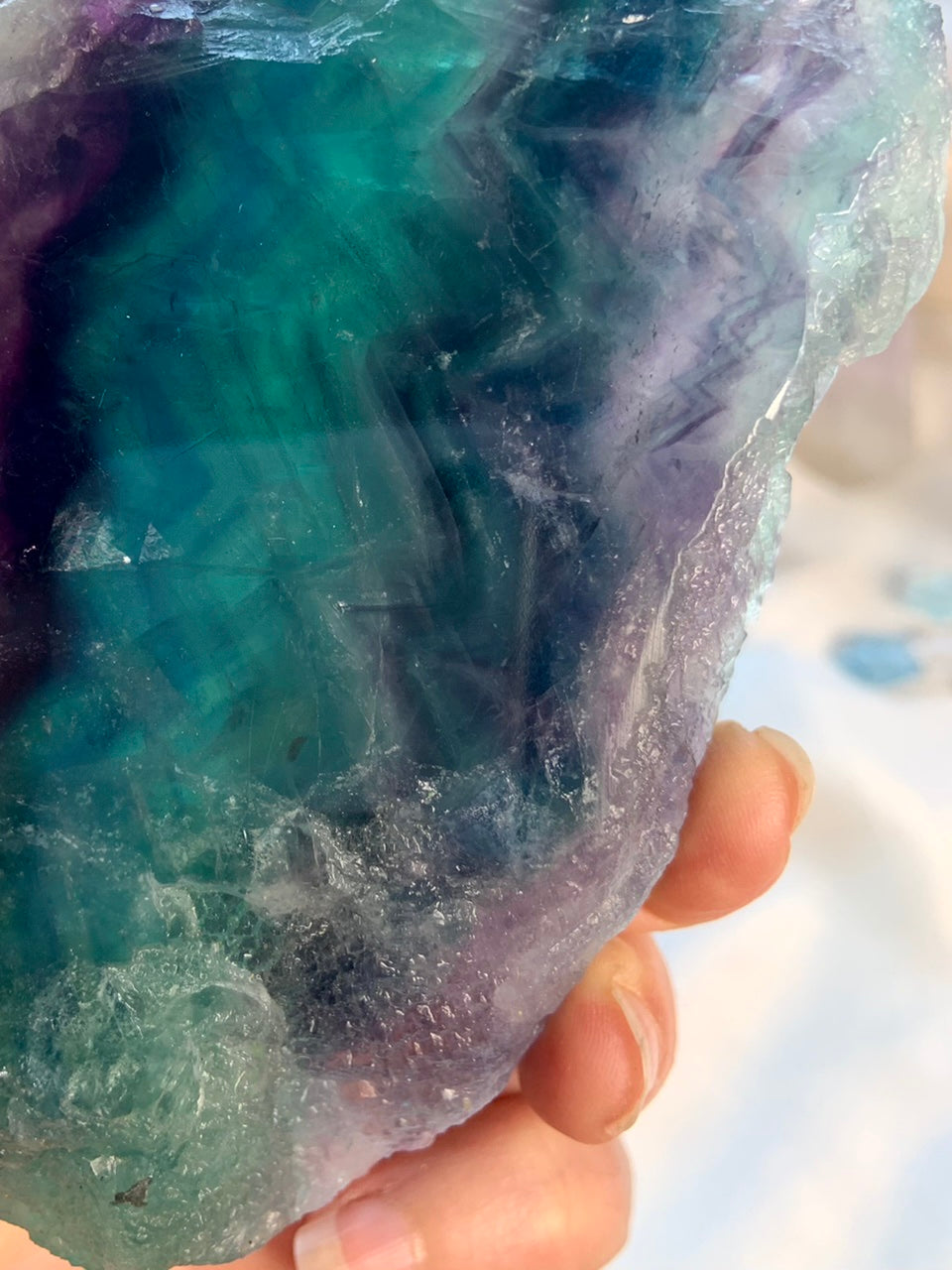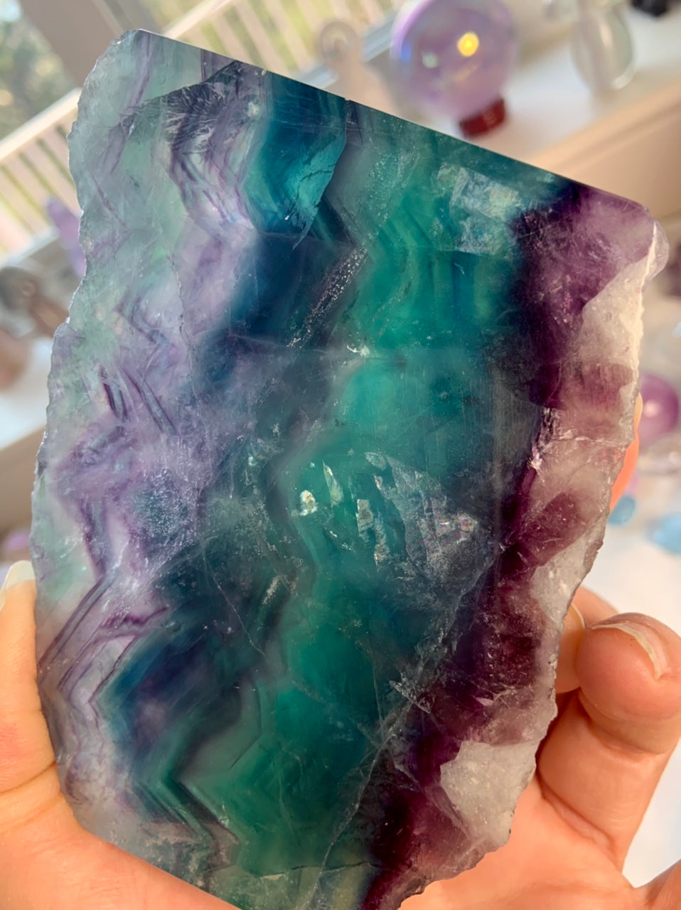 Fluorite has a grounding + harmonizing spiritual energy. Feel the grounding energy come through the bubbly raw natural stone edge + the glossy polished sides.