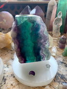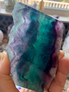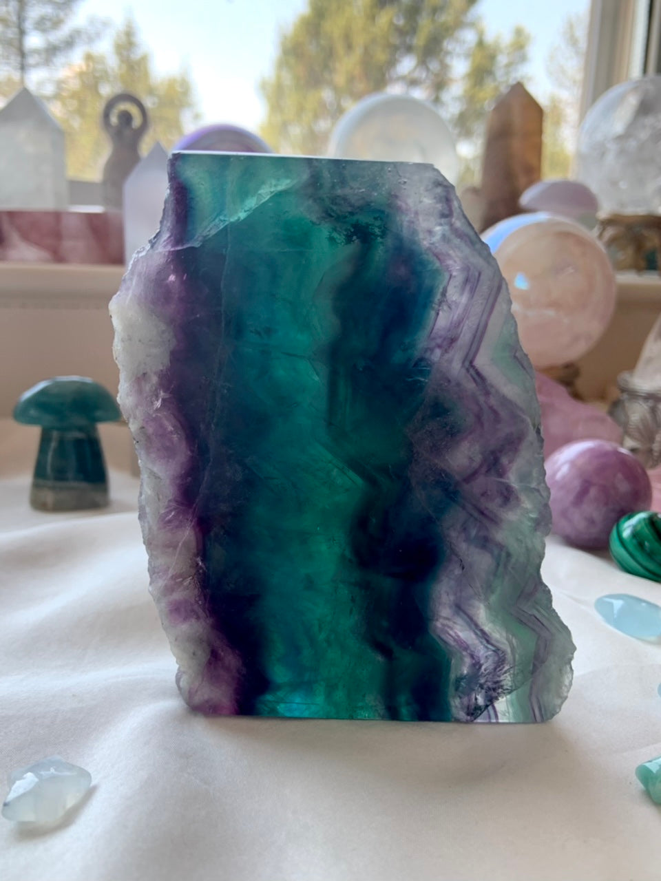 This self-standing fluorite slab can stand on the larger polished edge or lay flat. It has a stunning presence will make a gorgeous addition to your sacred space.