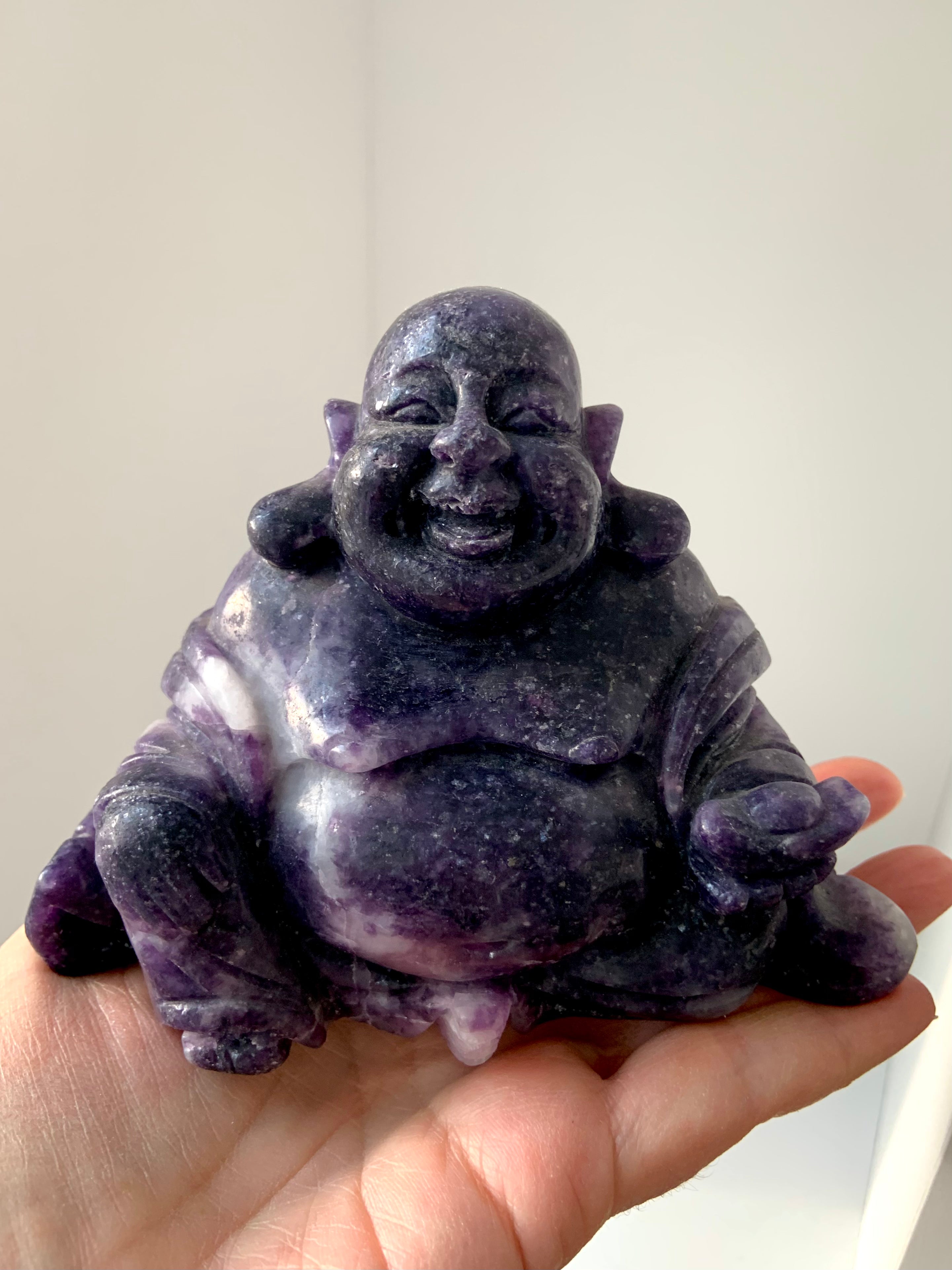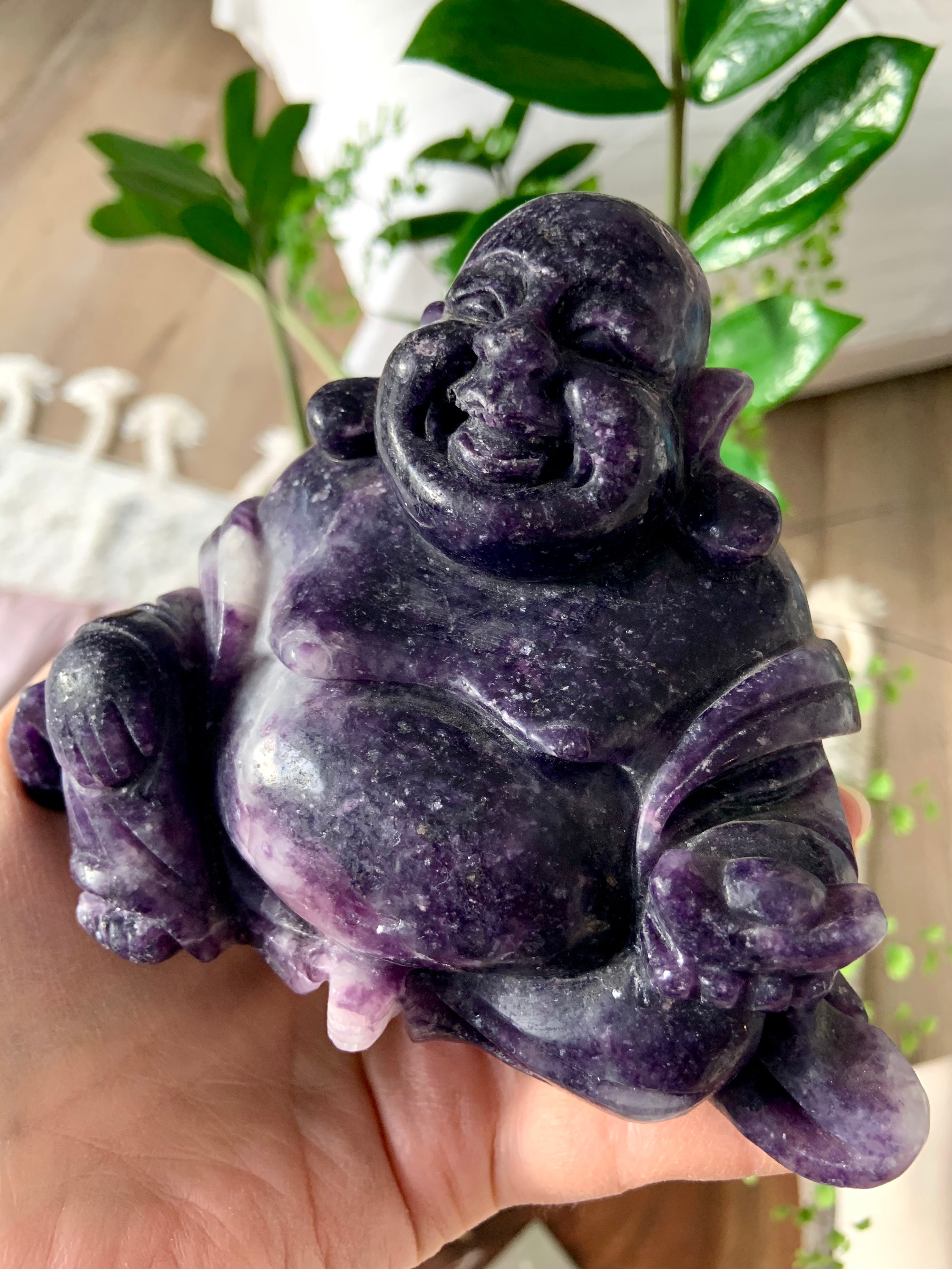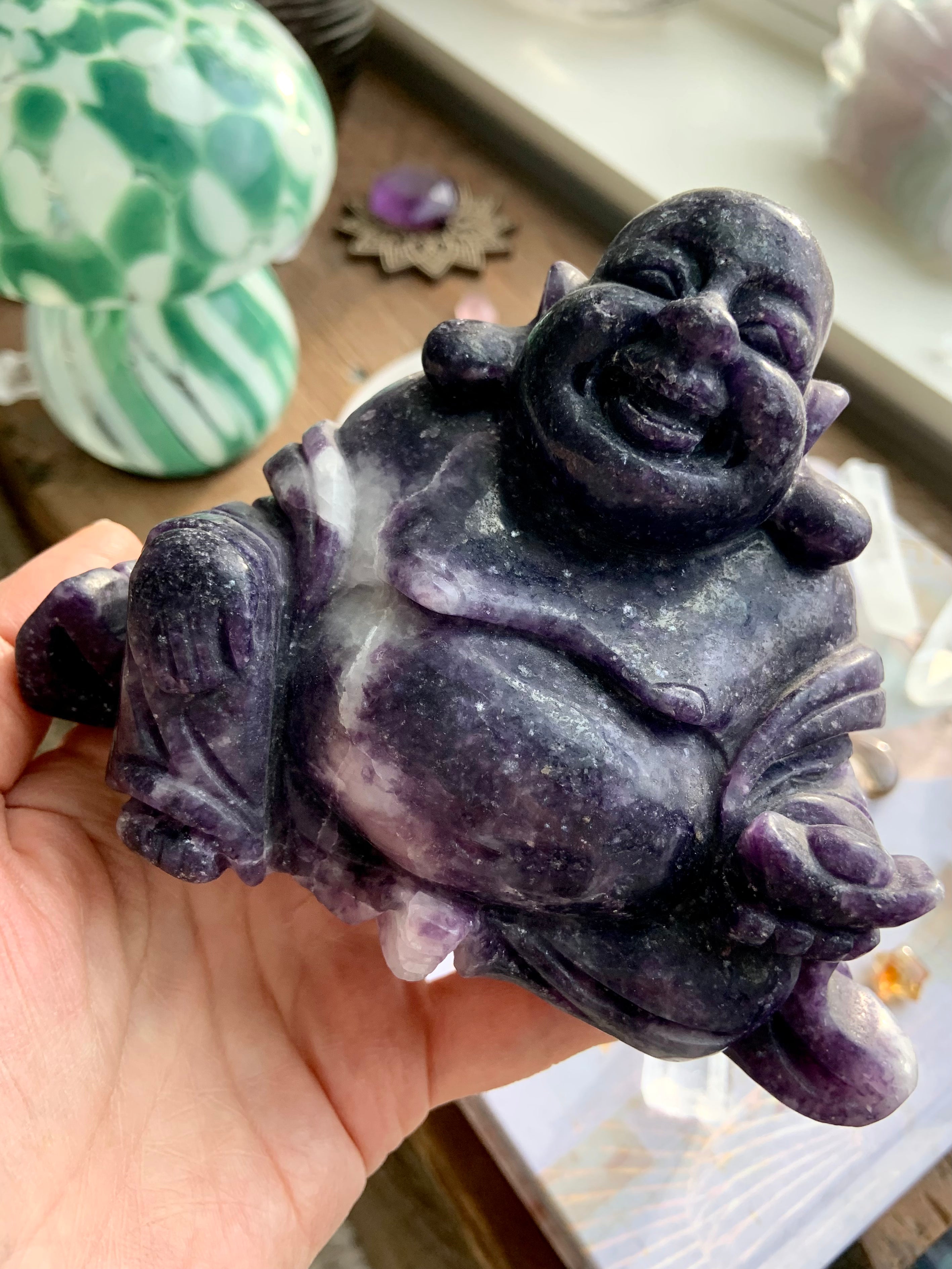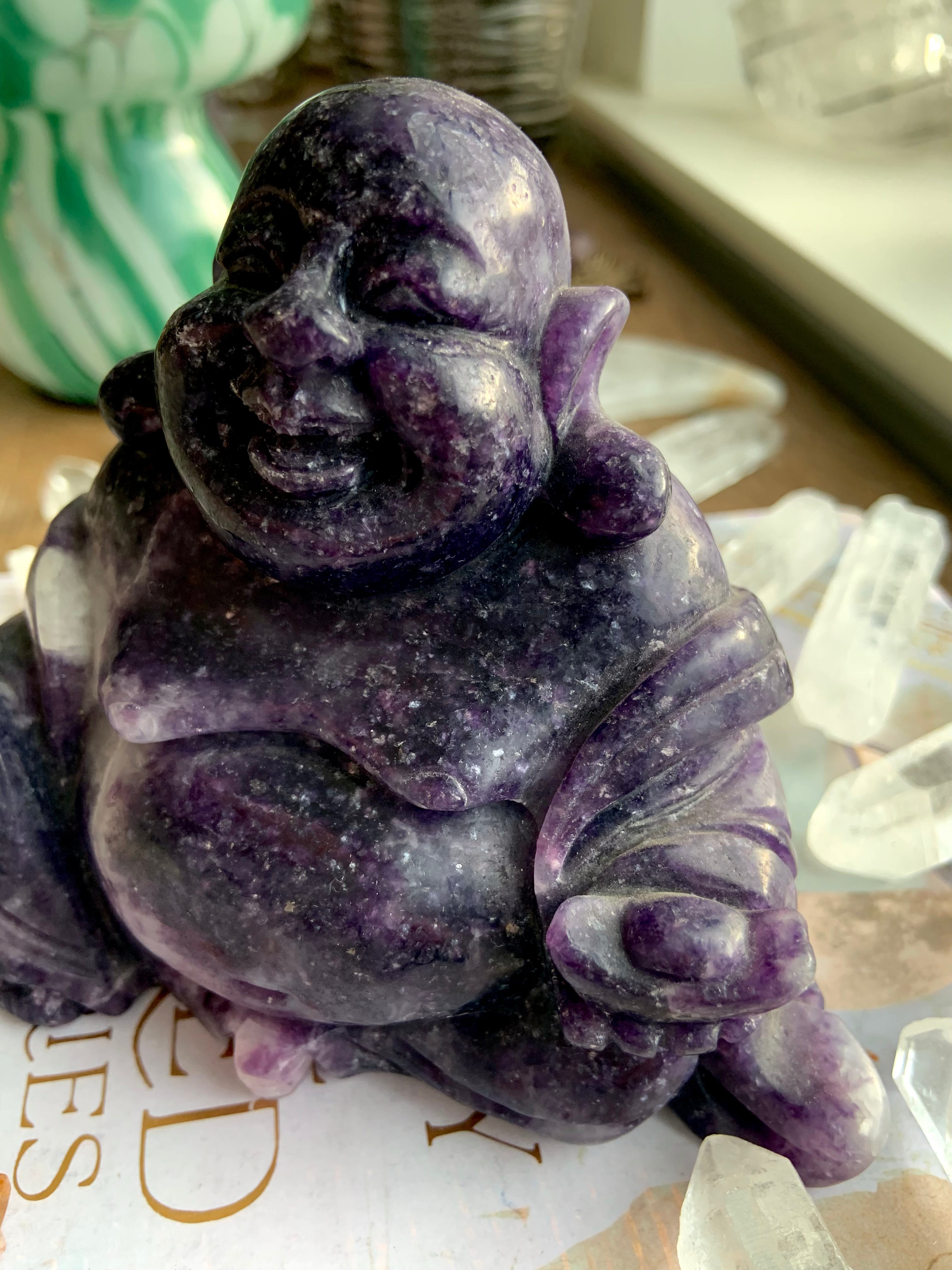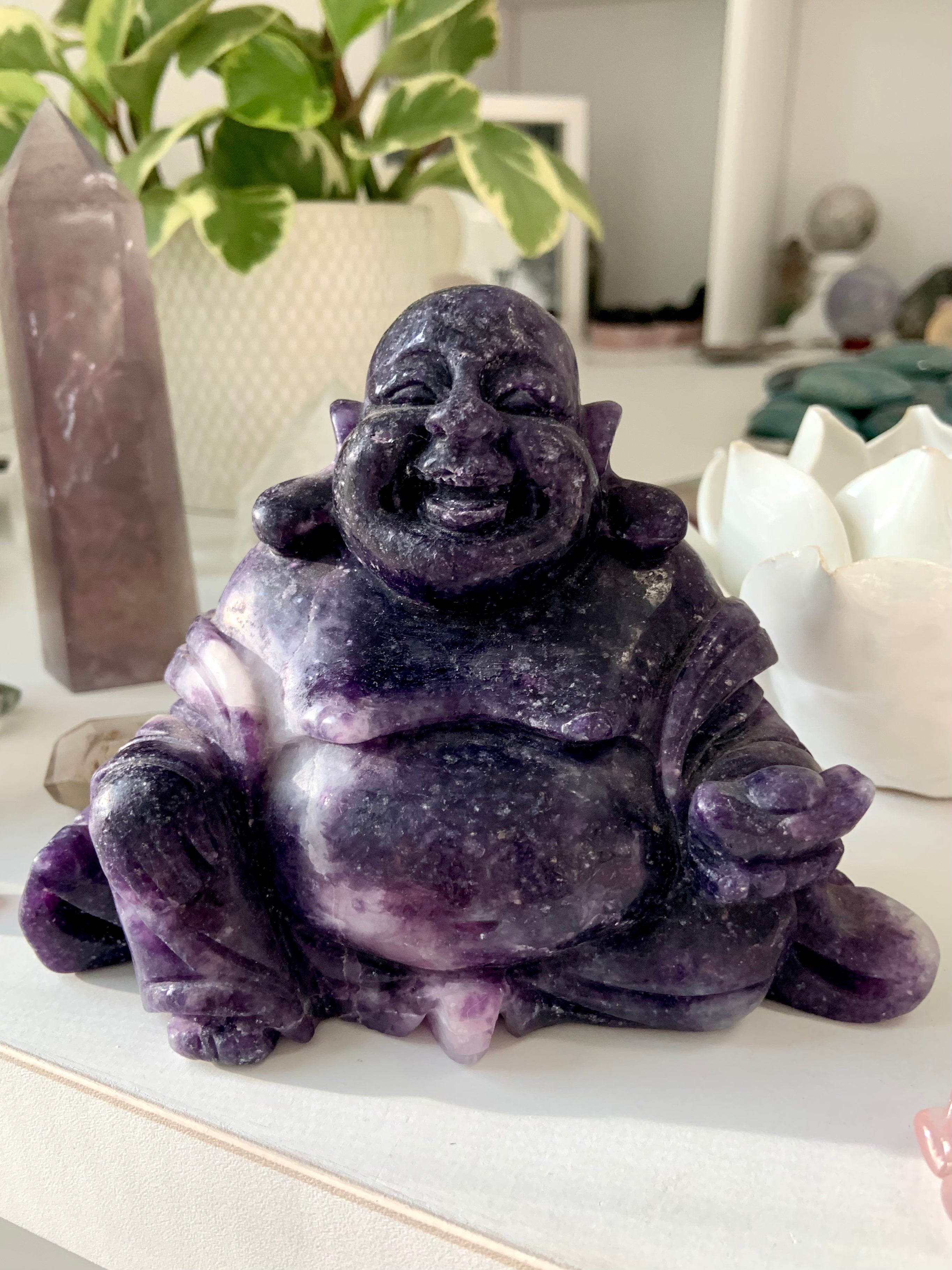 Place a Purple Lepidolite Buddha in your sacred space + feel the profound energetic shift as soothing, calming energy permeates like water. A Crystal Happy Buddha carving brings all the Zen vibes to your home, office, treatment room or meditation space + makes a great gift.