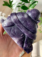 This crystal Buddha is a perfect bedroom crystal as Lepidolite emanates peaceful tranquility. This purple crystal has lots of shimming mica inclusions + emits a loving energy that can calm anxious thoughts, help with stress relief + create an environment for deeper more restful sleep.
