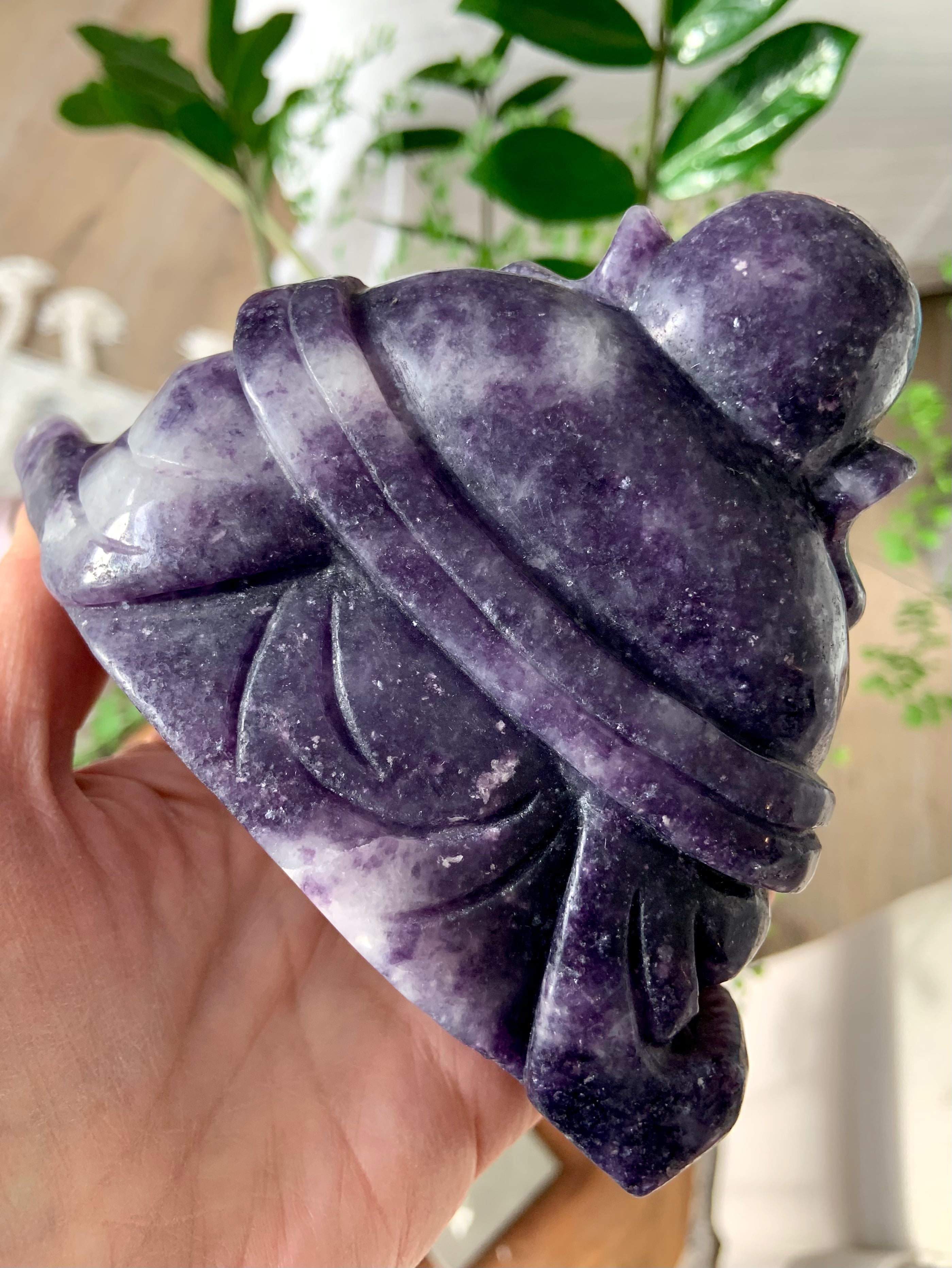 This natural lepidolite crystal has lots of flashy mica inclusions + pretty white veins running through the deep purple stone. The mica sparkle didn't translate well in the photos, but it's visible in the light. It is lovingly carved in the image of the Buddha.