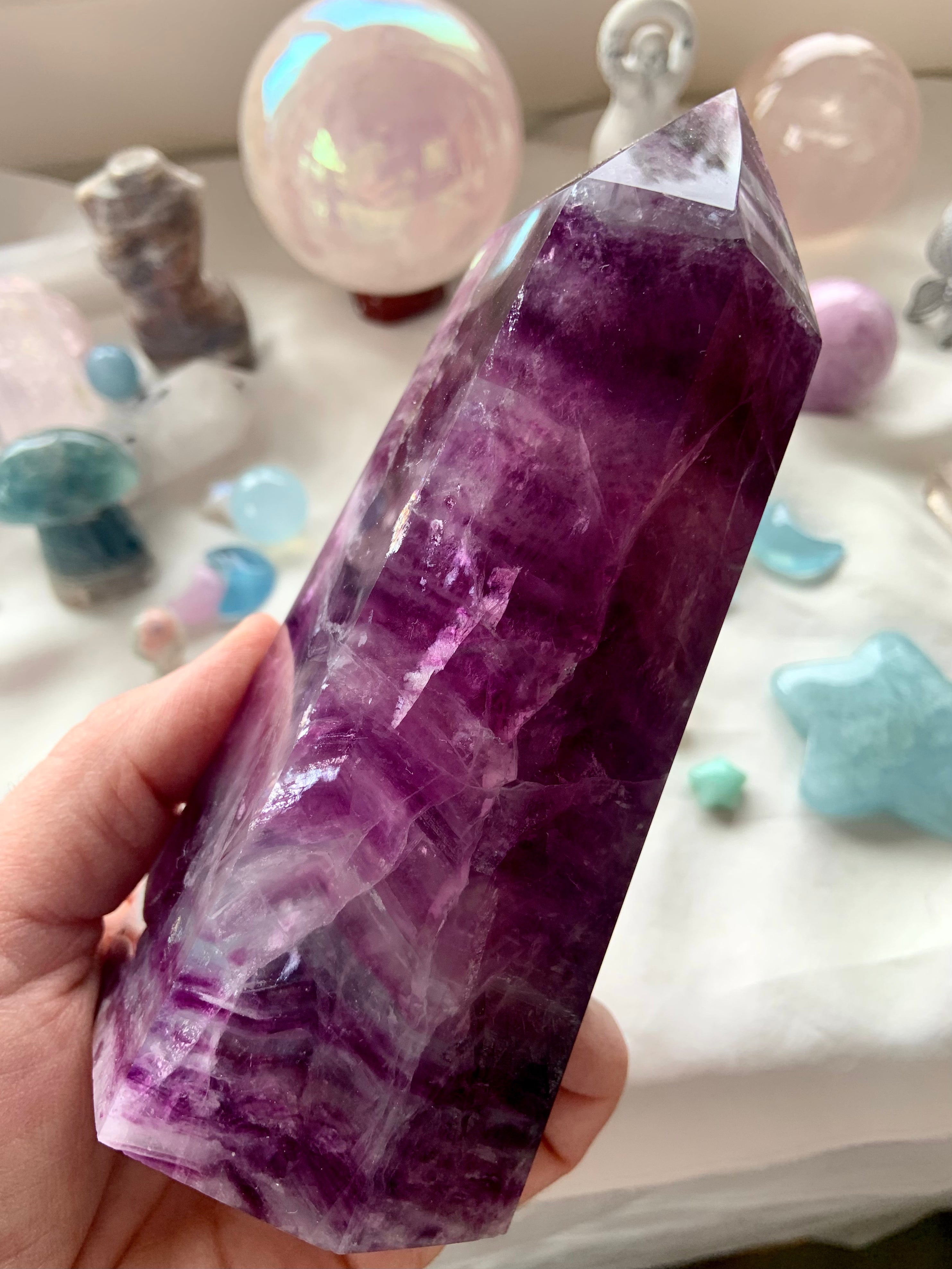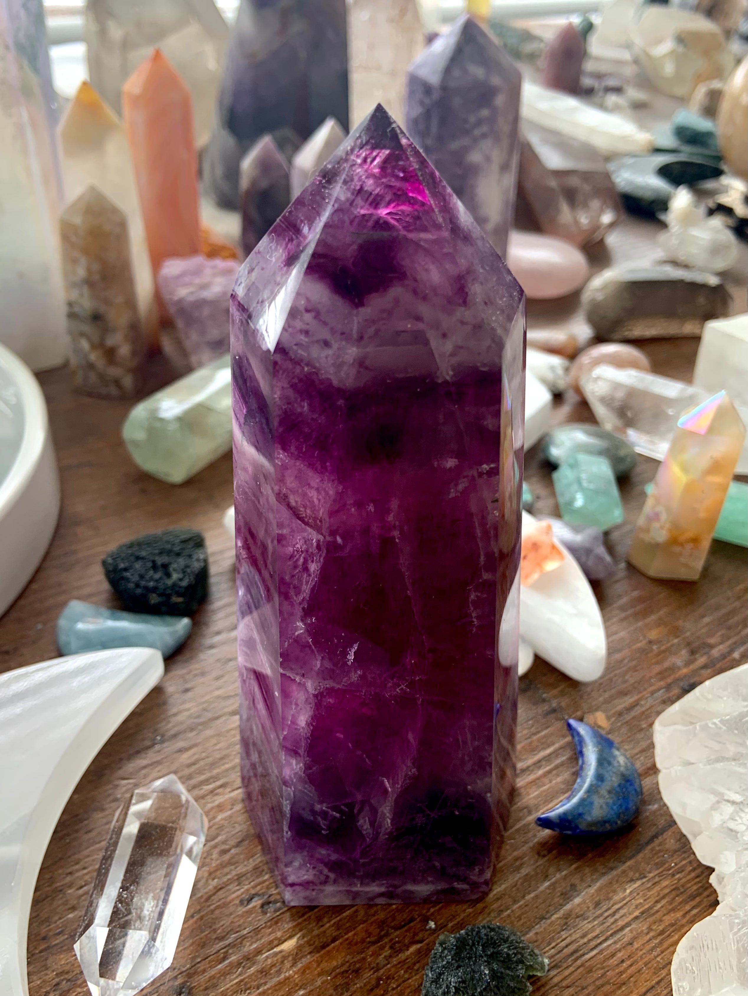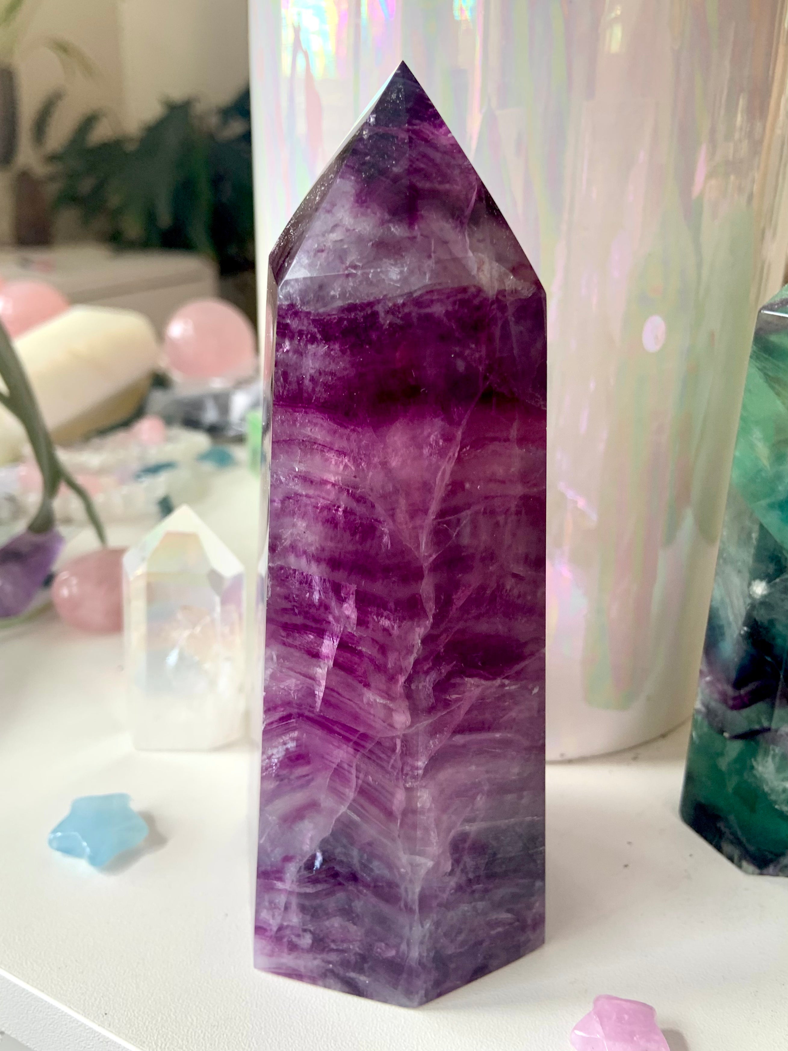 Bring this big, gorgeous Magenta Fluorite Tower into your sacred space + allow your heart to blossom. Magenta Fluorite is a heart chakra + third eye crystal, allowing one to become consciously aware of the hearts thoughts, desires + higher knowledge + awakening your intuition.