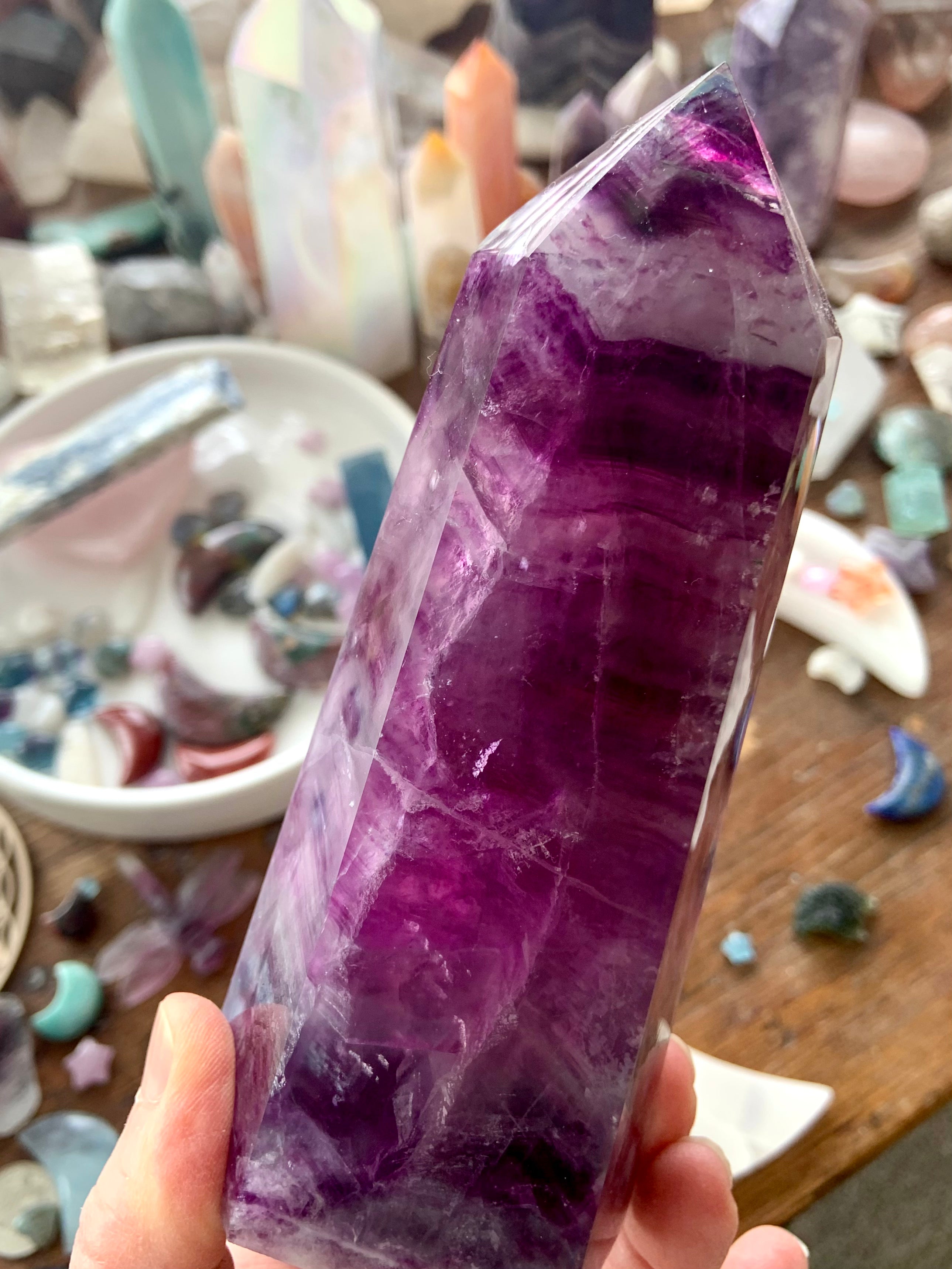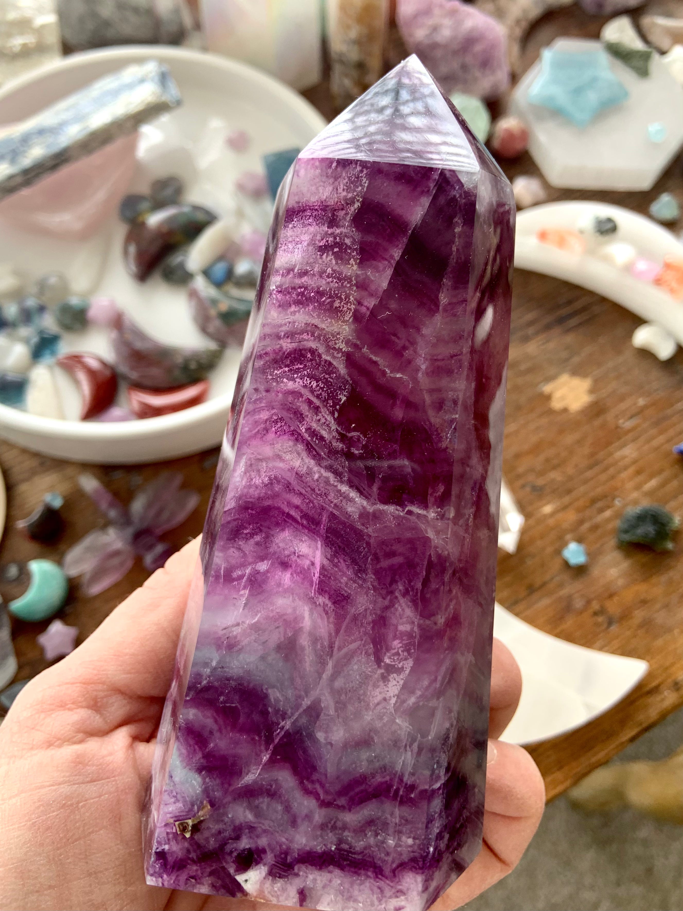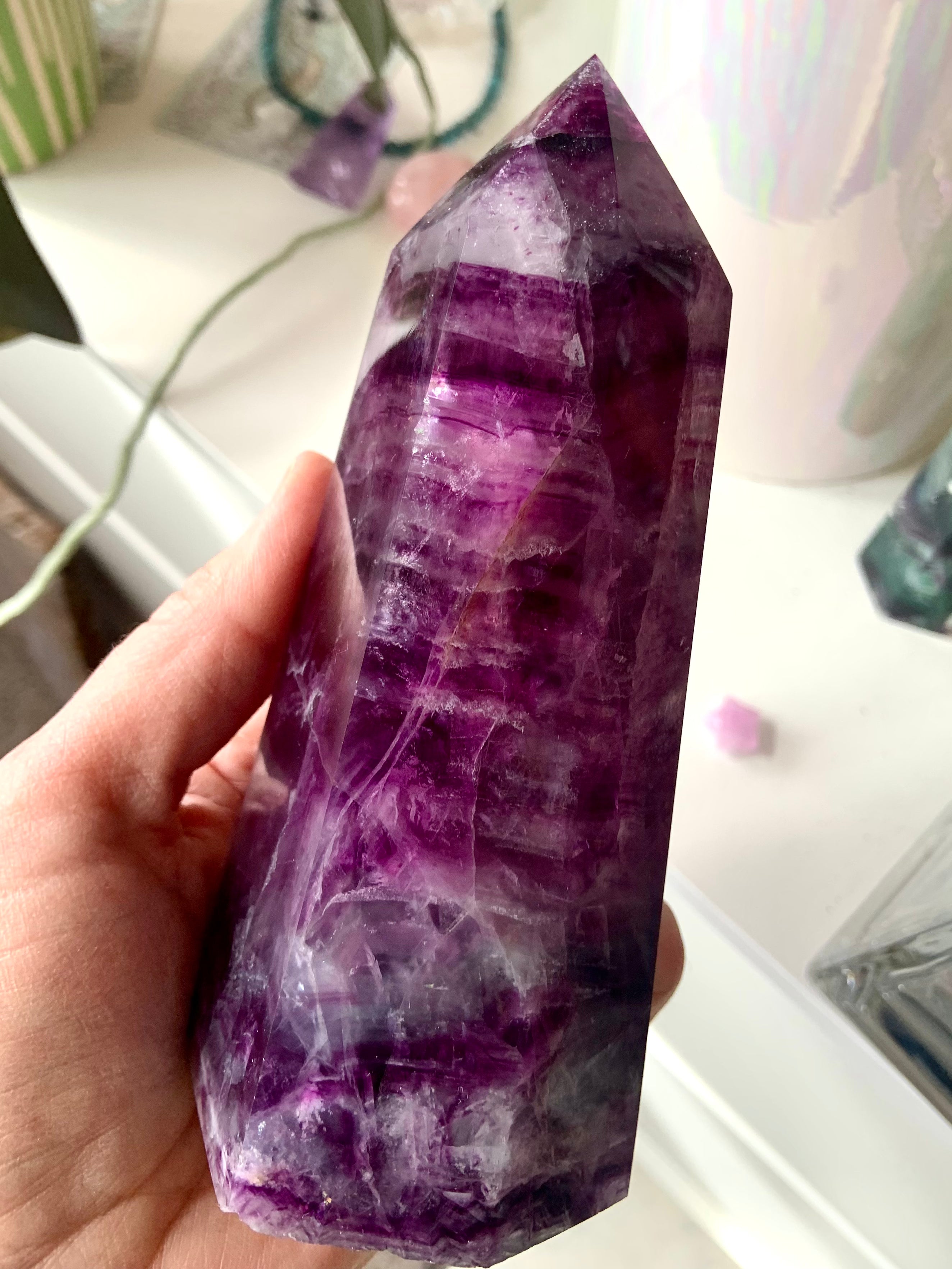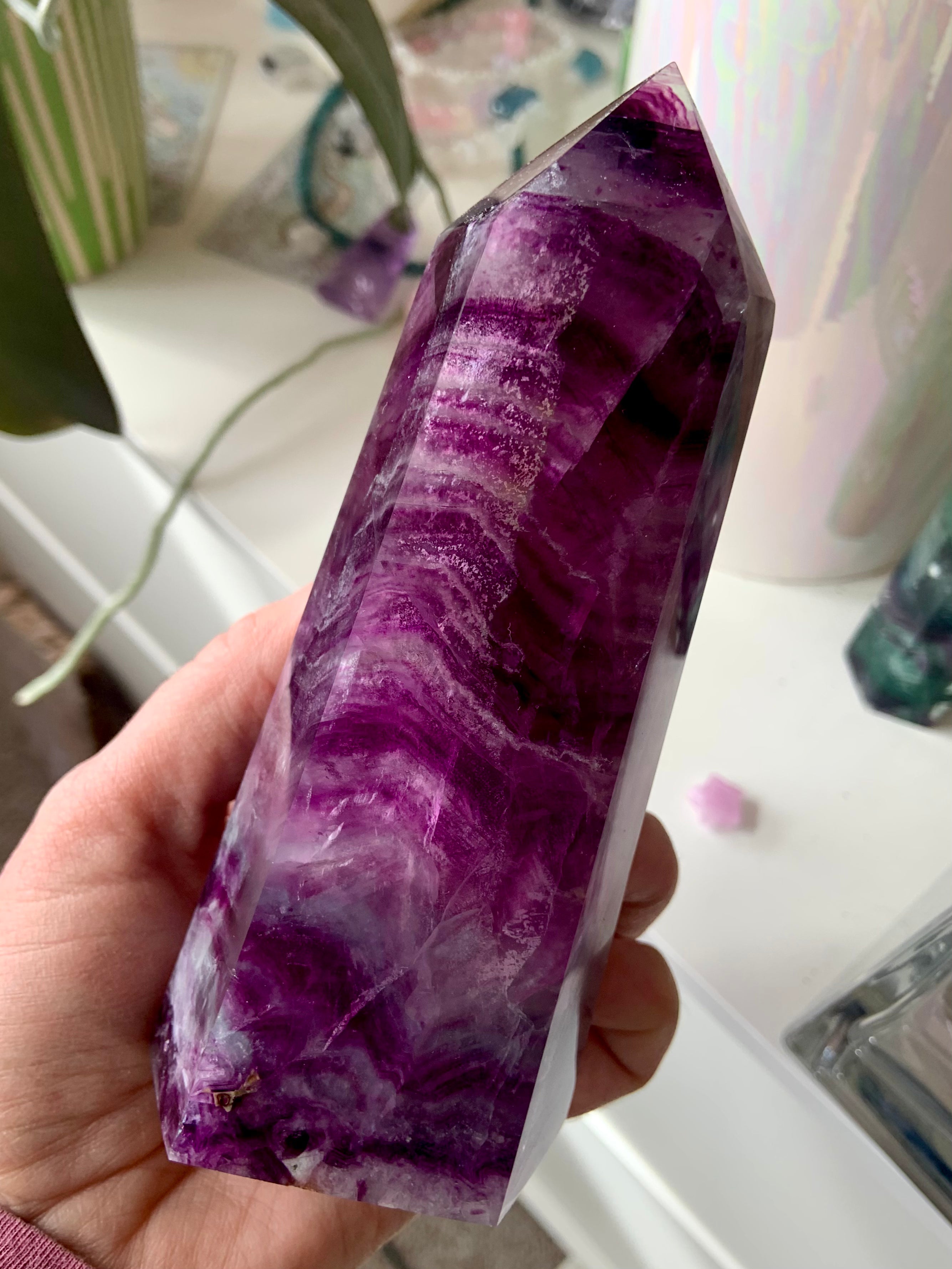 Bring this big, gorgeous Magenta Fluorite Tower into your sacred space + allow your heart to blossom. Magenta Fluorite is a heart chakra + third eye crystal, allowing one to become consciously aware of the hearts thoughts, desires + higher knowledge + awakening your intuition.