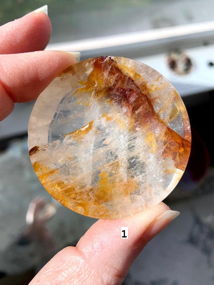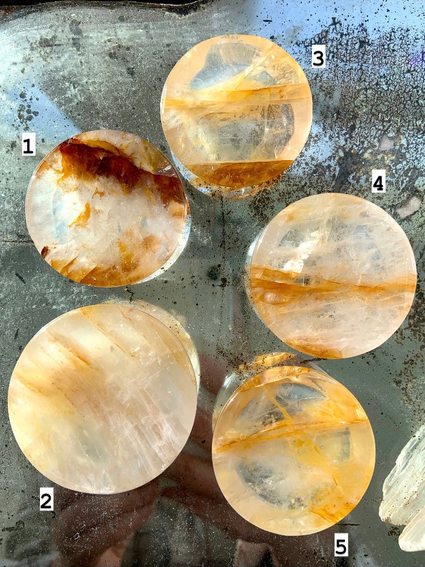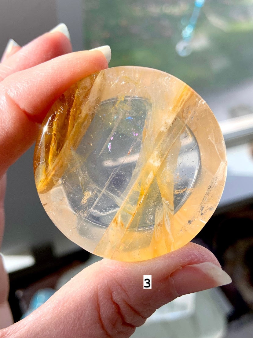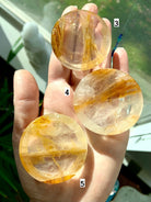 Choose your favorite one of a kind mini-sized Golden healer Crystal Bowl with some colorful golden iron inclusions, beautiful patterning in the stone. Hand-carved from high quality Yellow Hematoid Quartz aka Golden Healer Quartz, these little offering bowls have a shallow profile + can be used as a ring dish, a centerpiece in your crystal grids or even as a sphere holder.