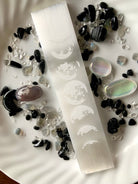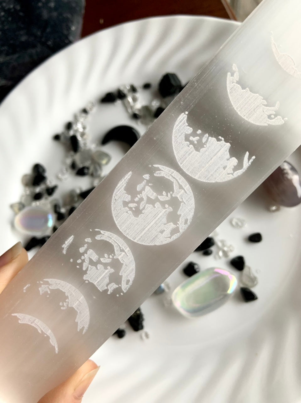 Selenite is the ultimate tool for cleansing + charging your other crystals, stones + jewelry. This high quality selenite ruler is laser etched with the waxing + waning moon phases to bring in harmonizing lunar energy + an extra level of peace, balance + harmony into your sacred space.