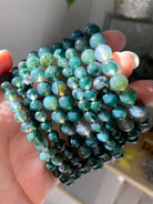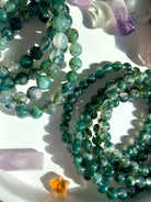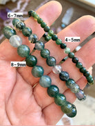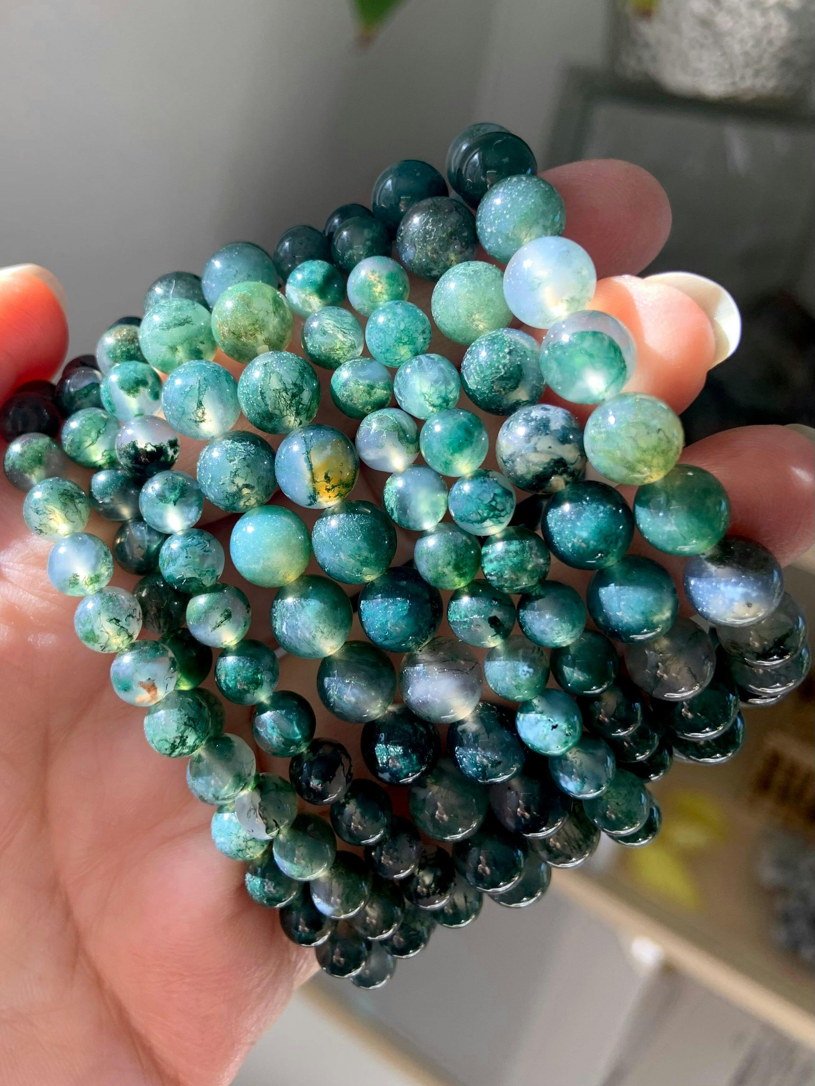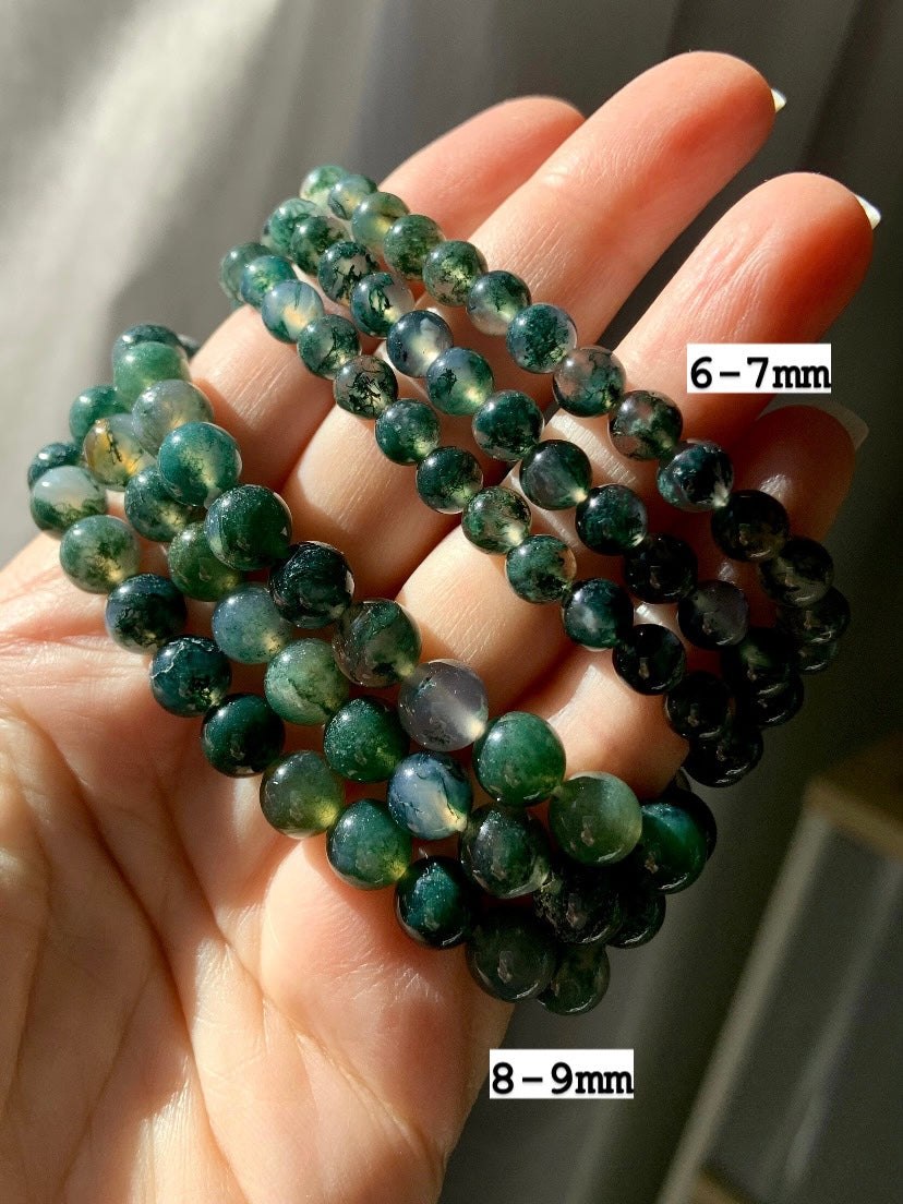 Wear your Moss Agate bracelet when you need a calming, tranquil energy that is balancing to the emotions. These lovely high quality, transparent Moss Agate beaded bracelets are offered in three bead sizes + look beautiful worn as a single or stacked as a set with other crystal bead bracelets.
