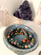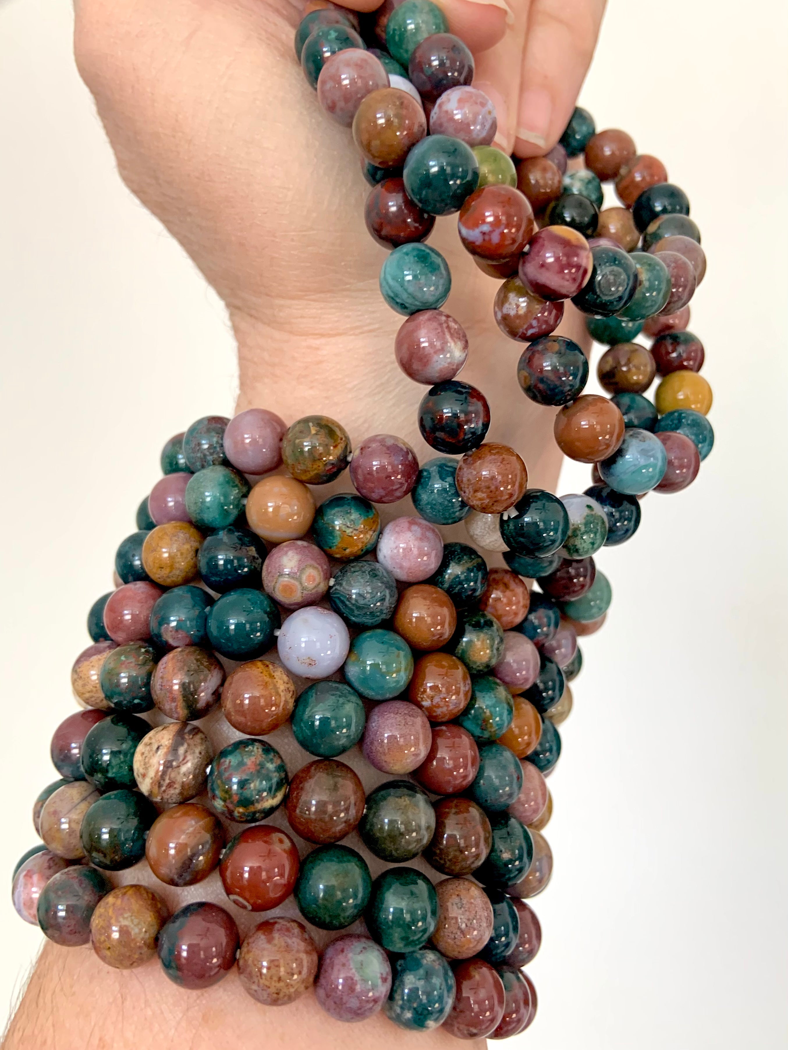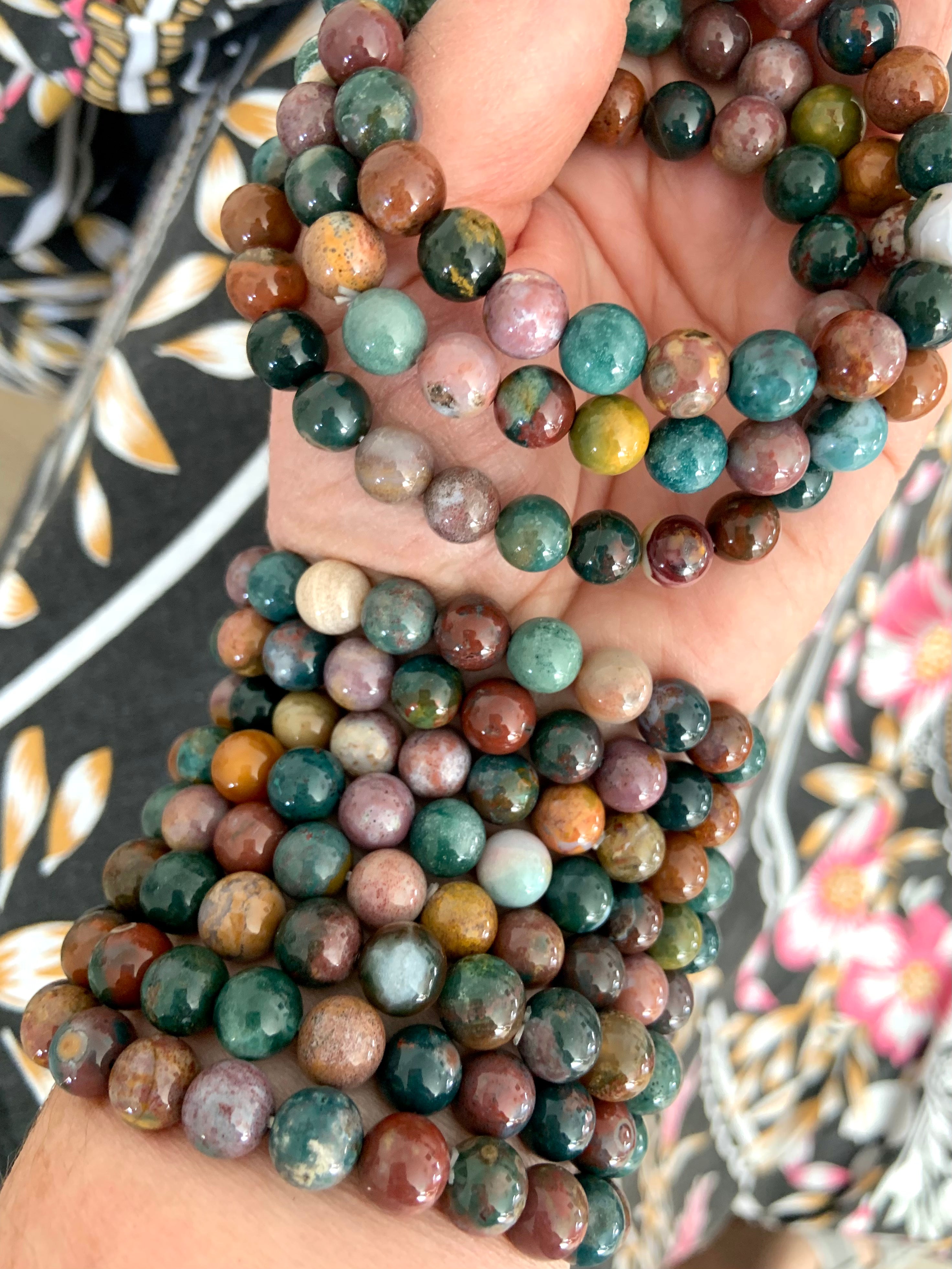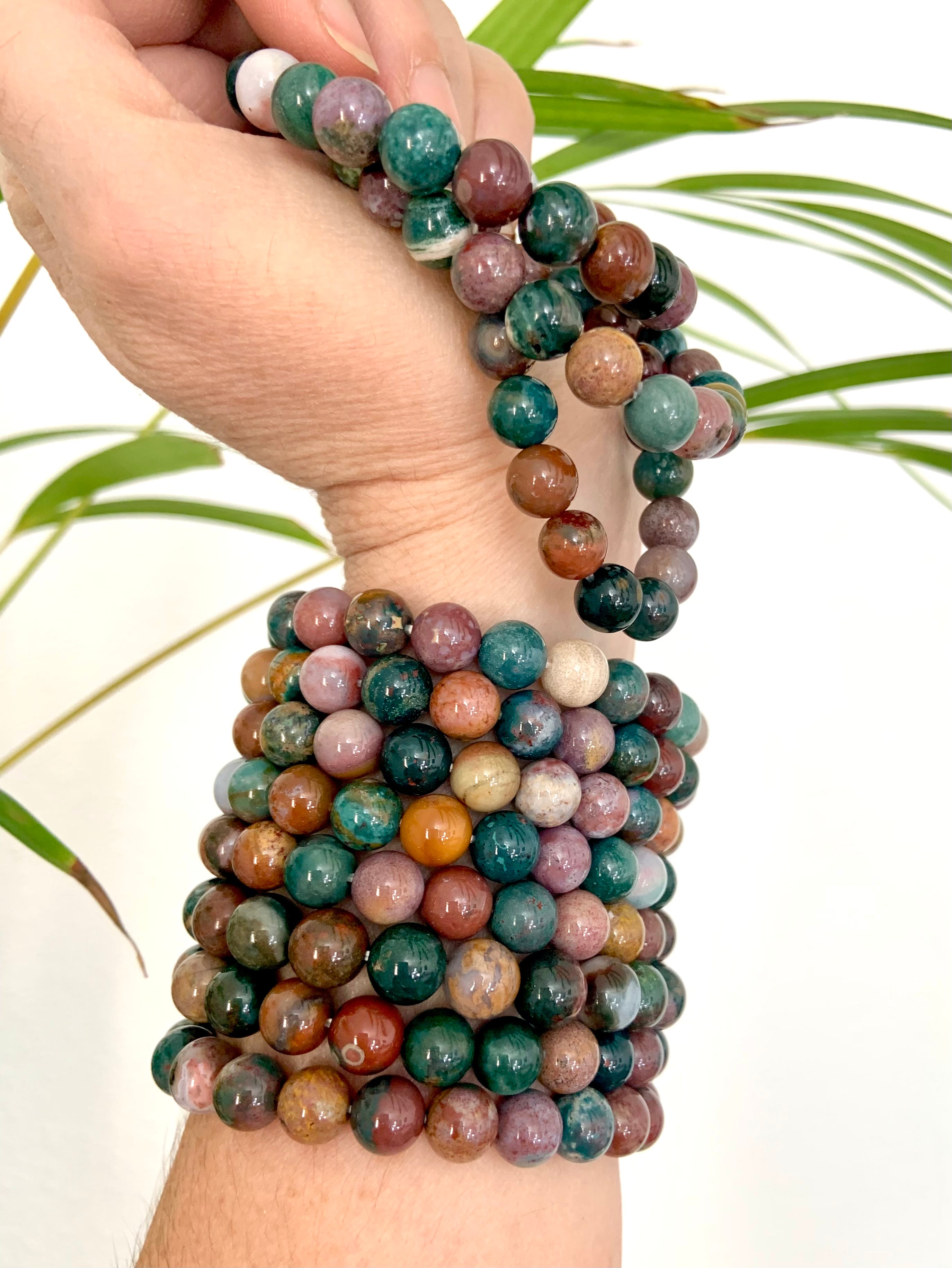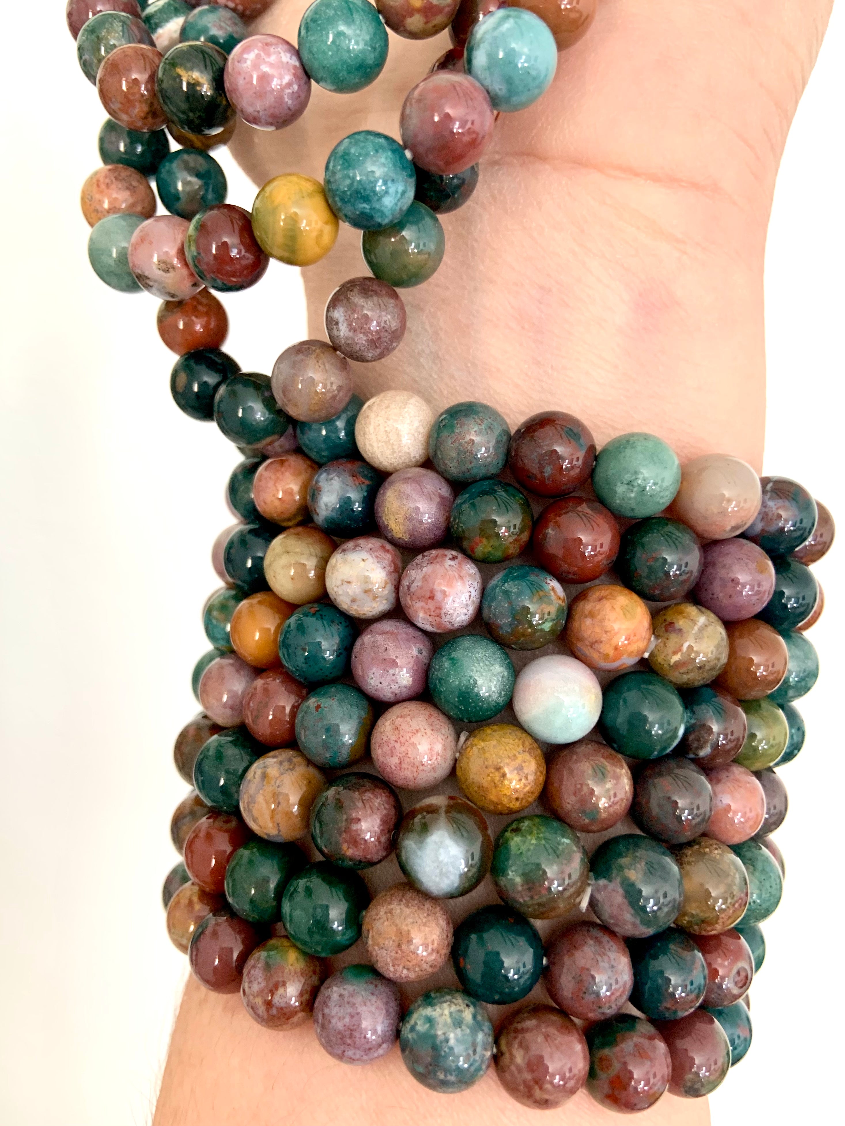 Wear your Ocean Jasper Bracelet when you need a little grounding. Wearing Ocean Jasper jewelry brings the calming, centering energy of Mama Gaia into your field + supports you with her deeply nurturing steady frequency. Wearing + meditating with Ocean Jasper can help you find your equilibrium, reminding you that all is well.