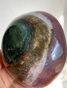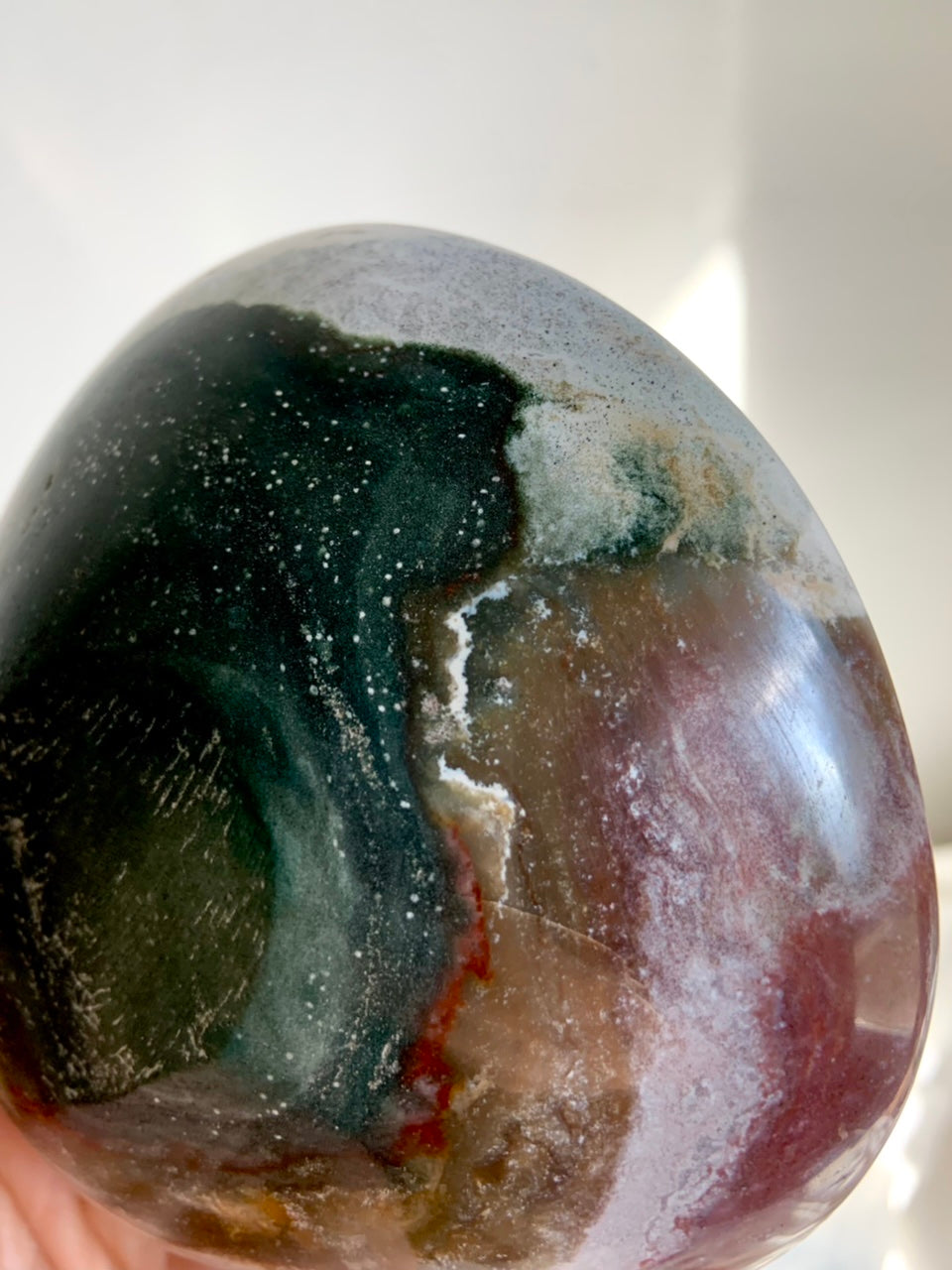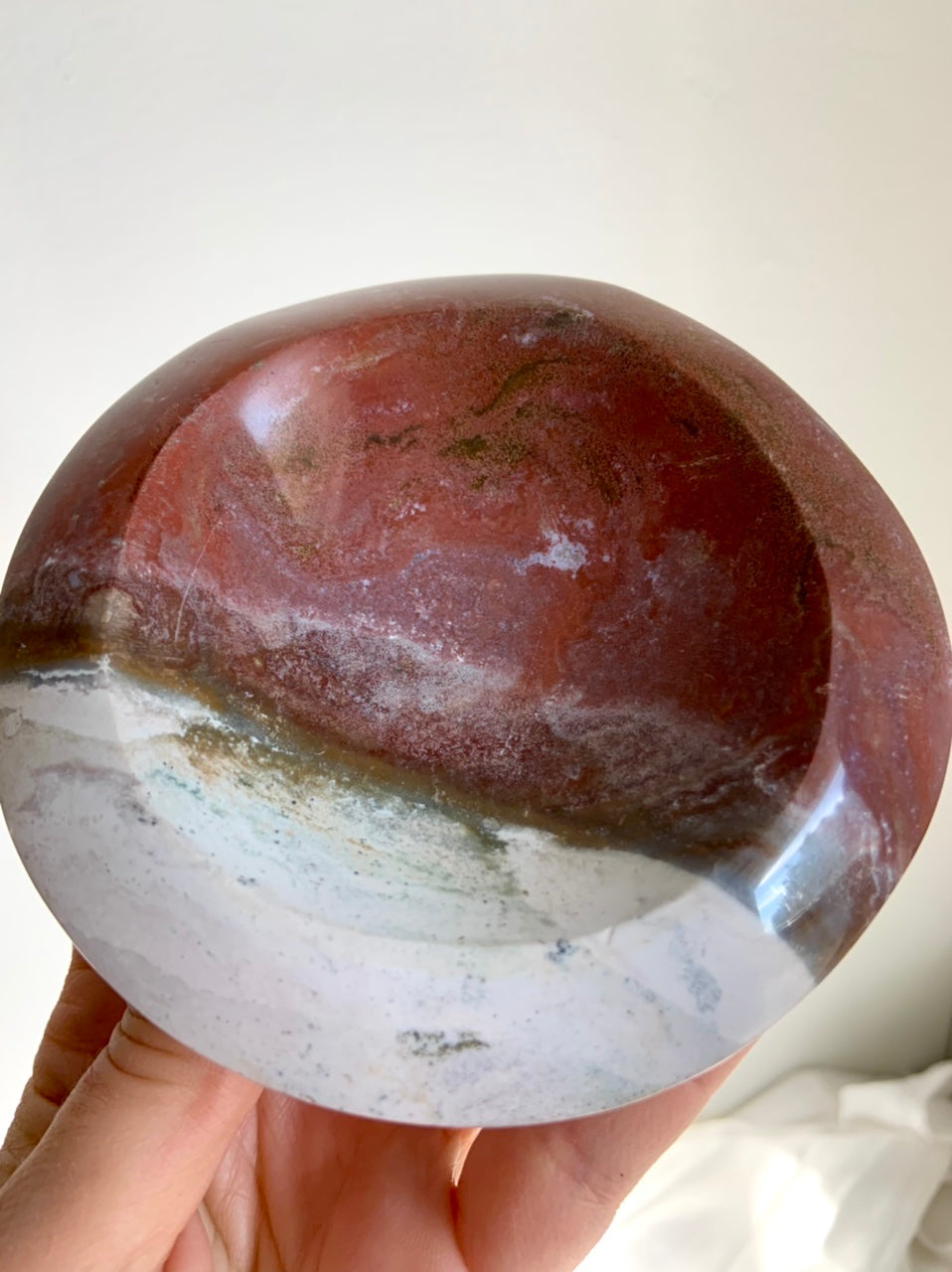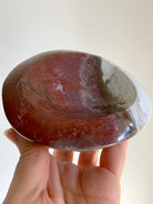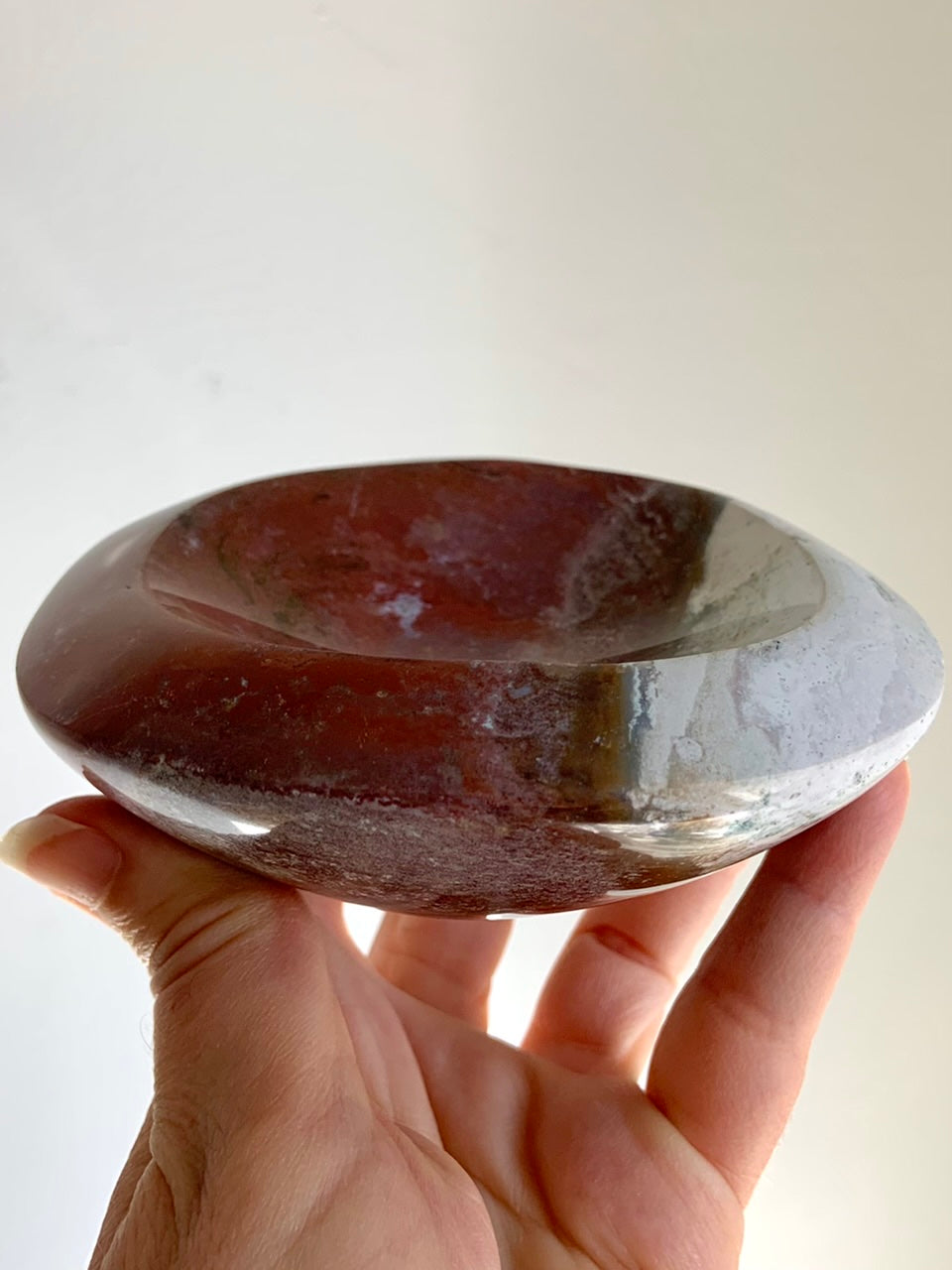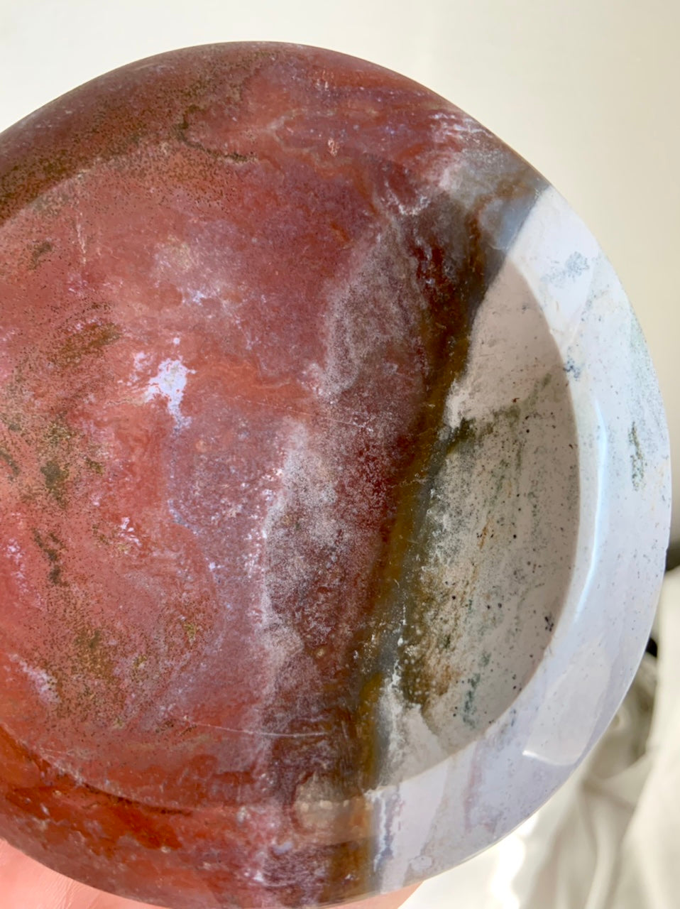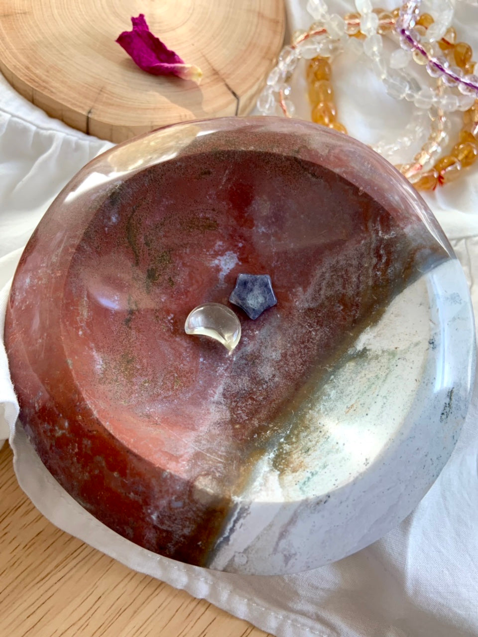 Decorate your sacred space with a beautiful, one of a kind Ocean Jasper Bowl. Ocean Jasper brings a calm, uplifting energy to the room. This multi-colored piece of OJ is hand-carved + polished into a stone vessel, a crystal bowl to hold your special things.