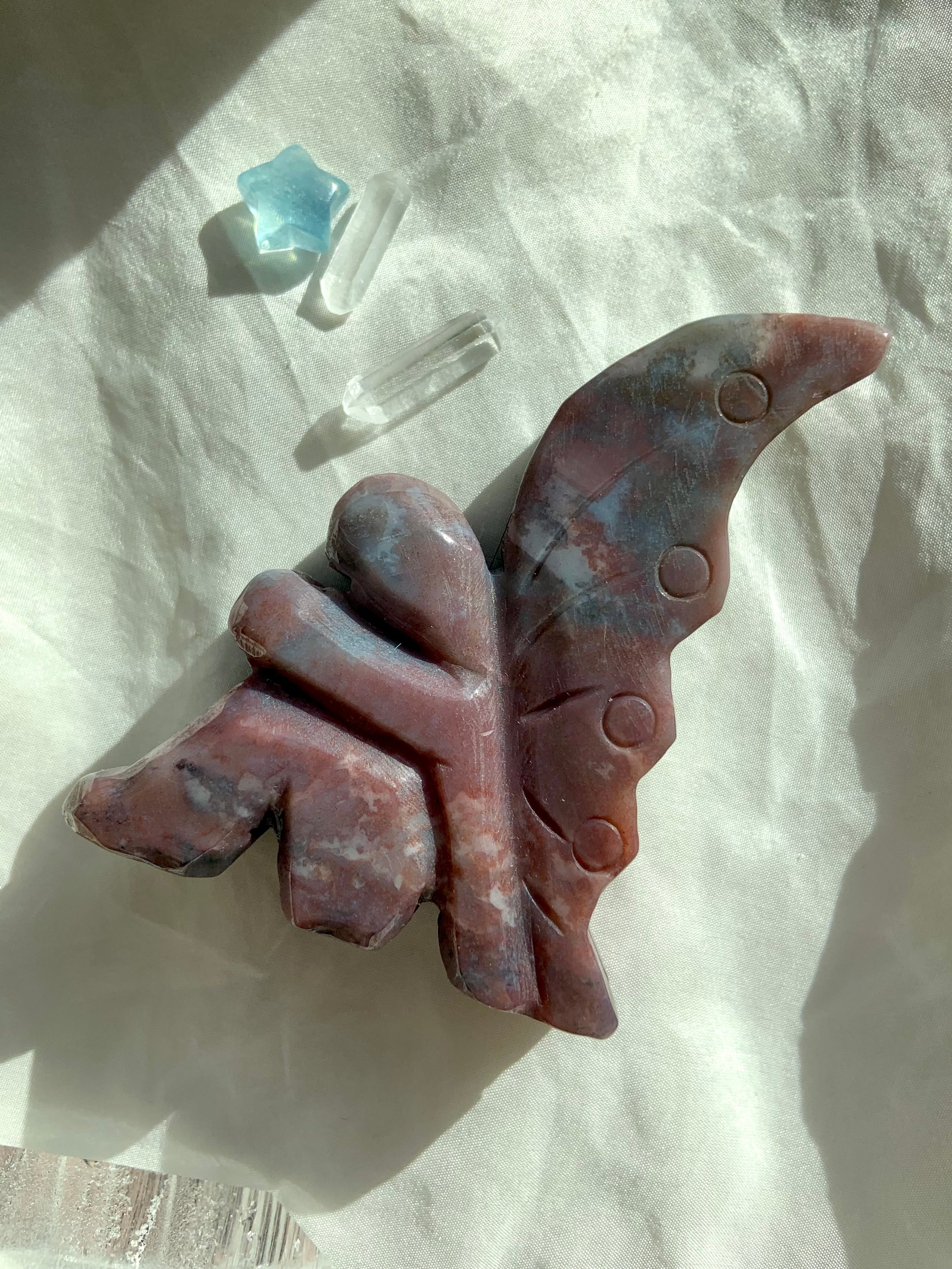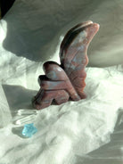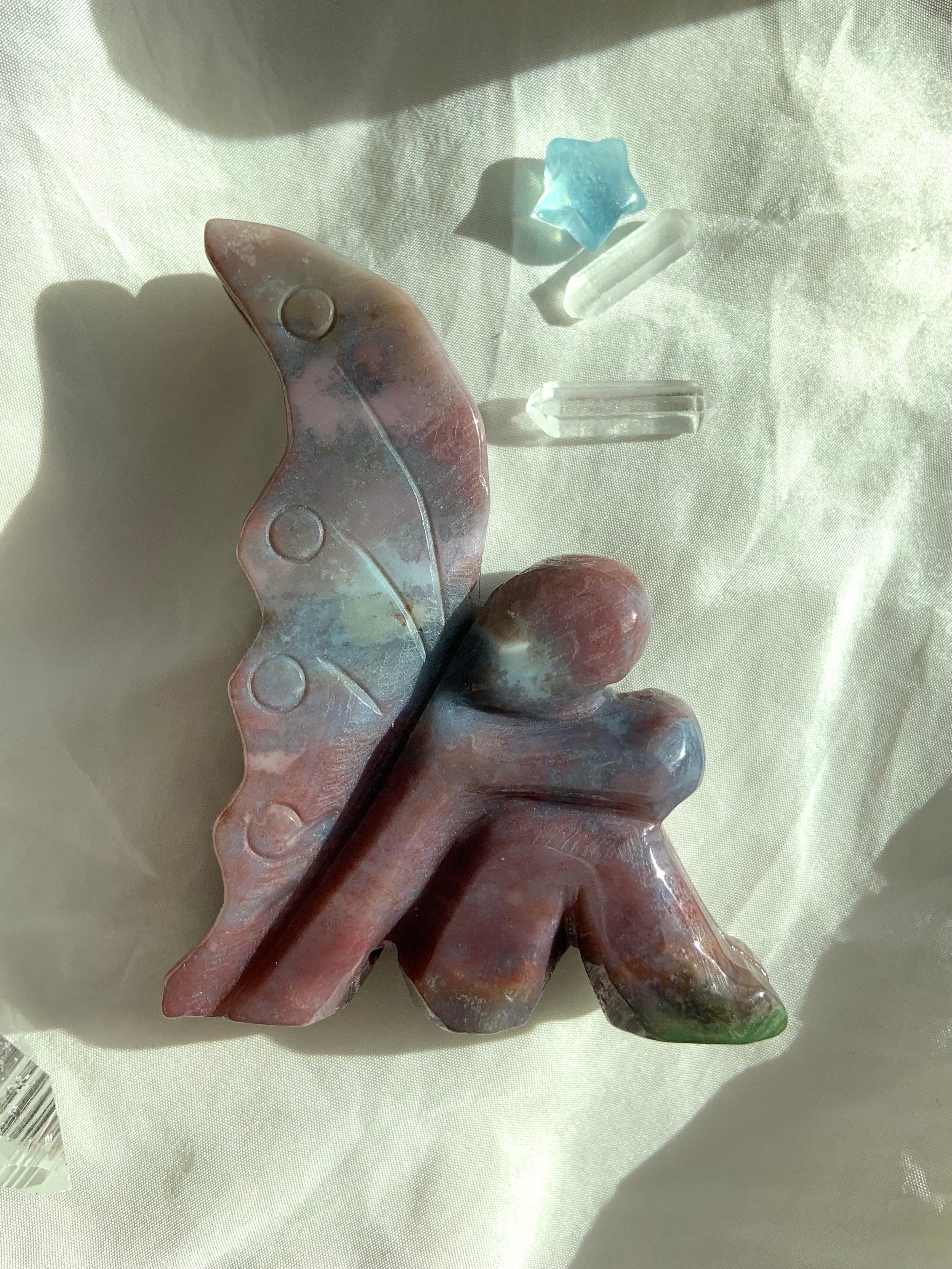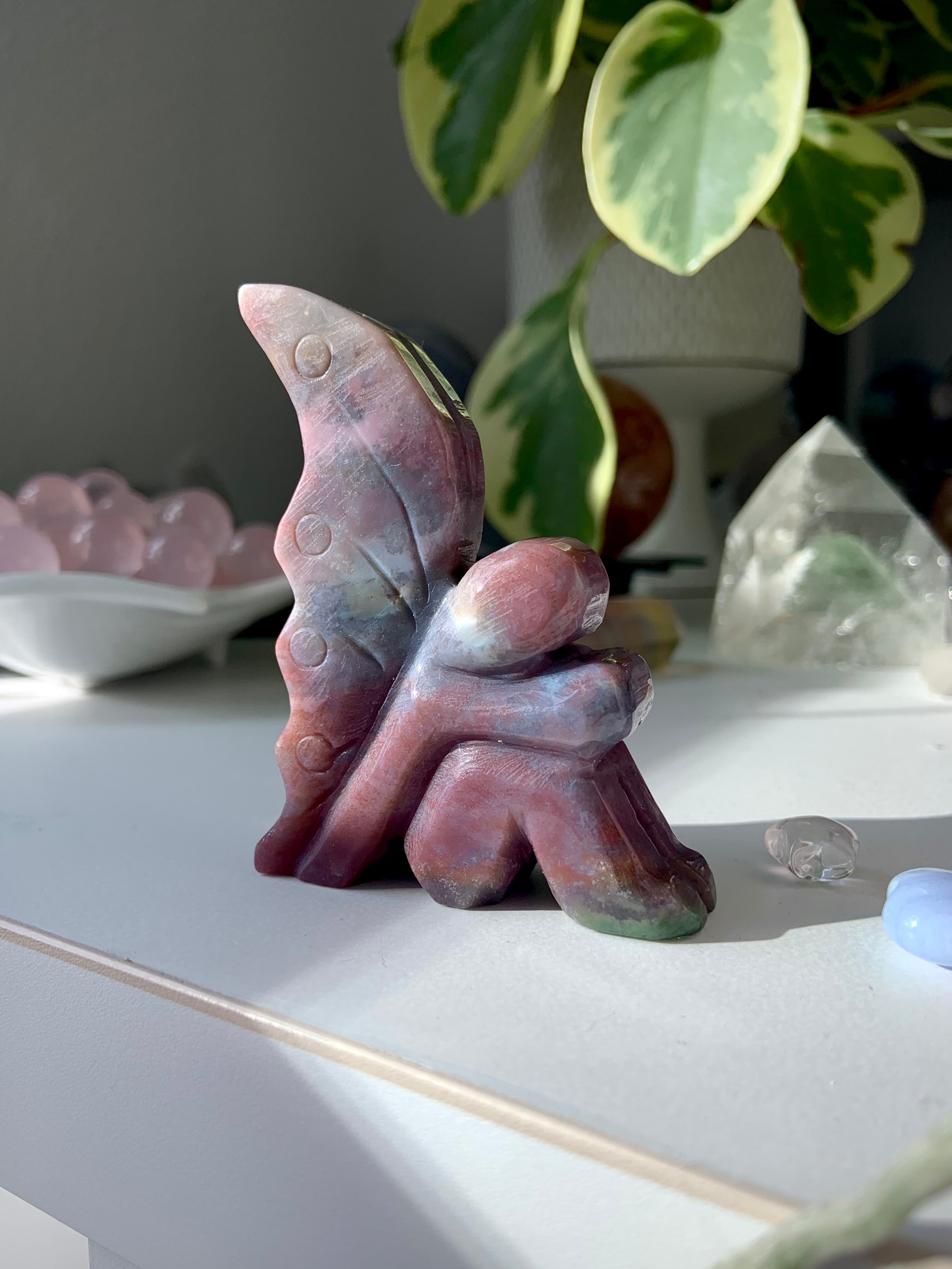 This Ocean Jasper Faerie Figurine is a one of a kind nature spirit with pastel pink, purple, blue + patterns in the stone with beautifully carved wings. The feminine pastel colors + lovely fairy figurine make this a special piece for your crystal collection + woodland fairy decor.