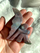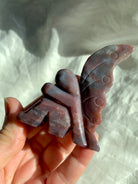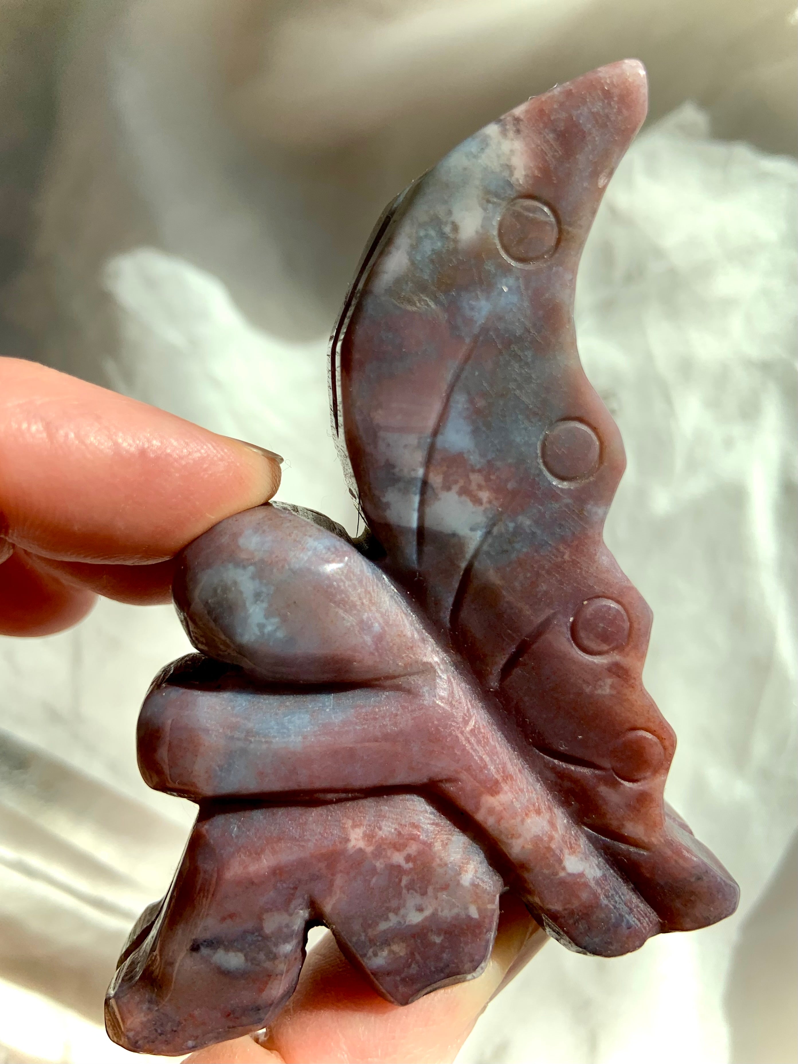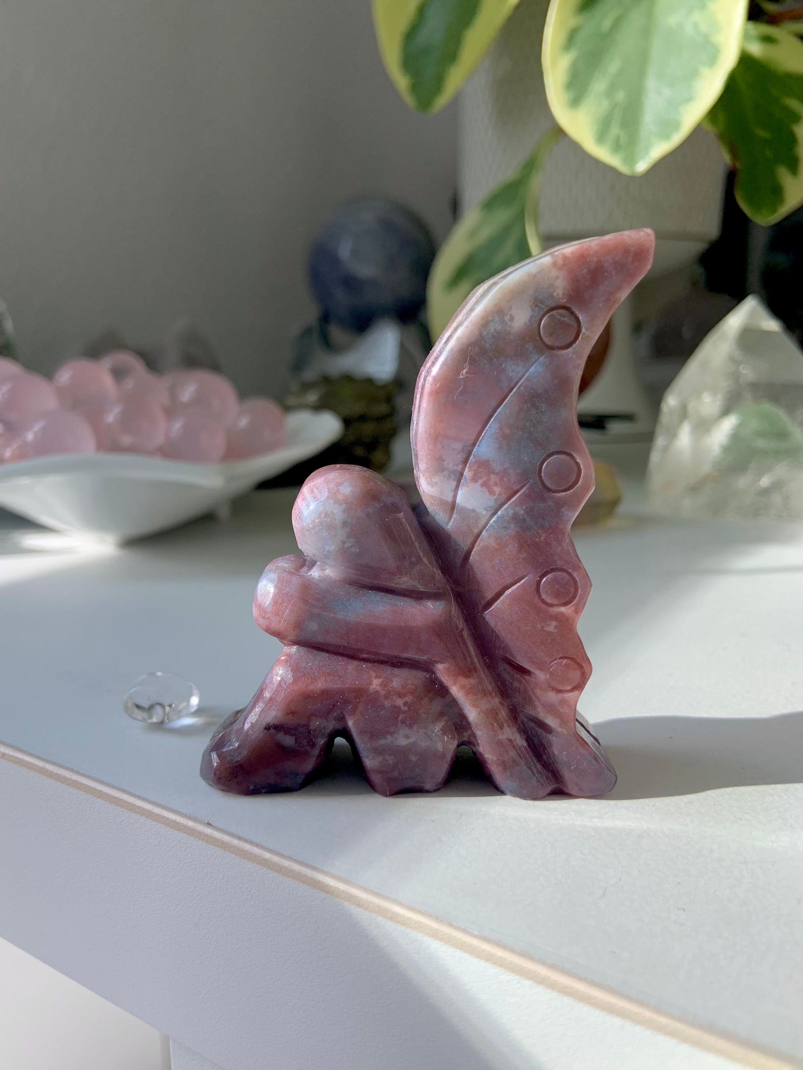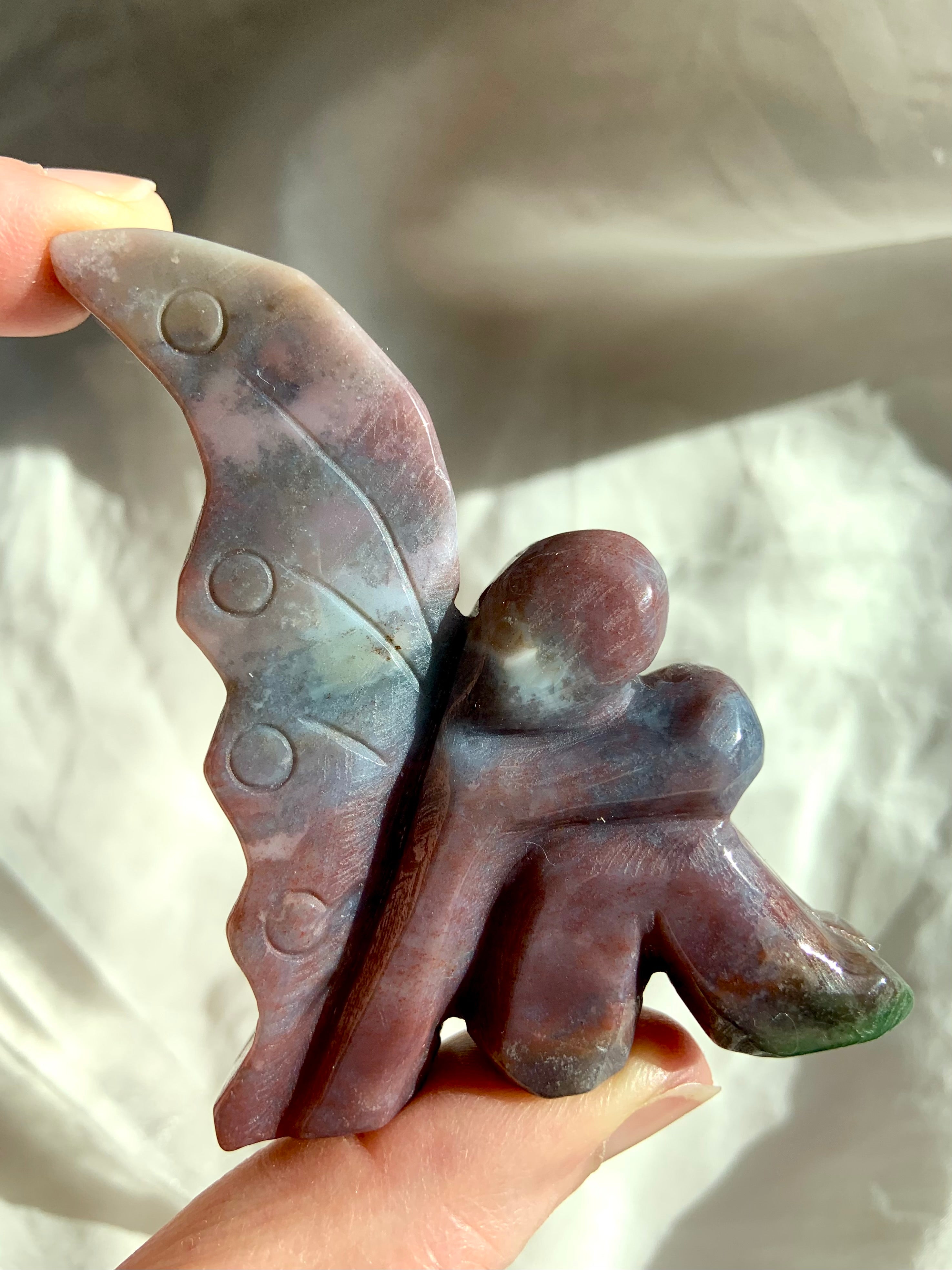 This Ocean Jasper Faerie Figurine is a one of a kind nature spirit with pastel pink, purple, blue + patterns in the stone with beautifully carved wings. The feminine pastel colors + lovely fairy figurine make this a special piece for your crystal collection + woodland fairy decor.