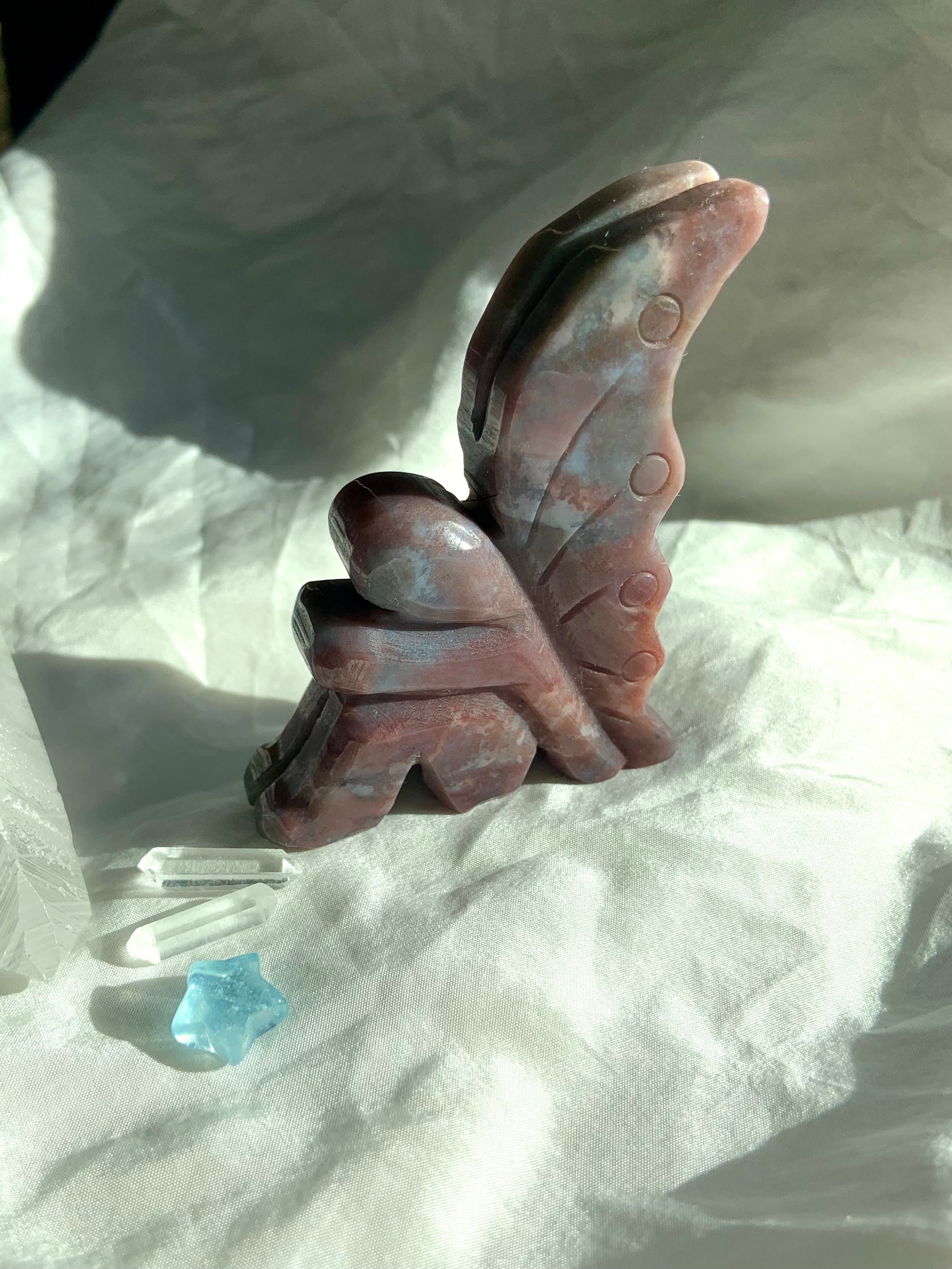 This one of a kind Ocean Jasper Stone Fairy is a unique combination of the Earth's minerals borne of primordial volcanoes + the Sea. Ocean Jasper works with your Heart Chakra + has both Fire + Water elemental energy with a touch of Earthy, grounding energy as well.