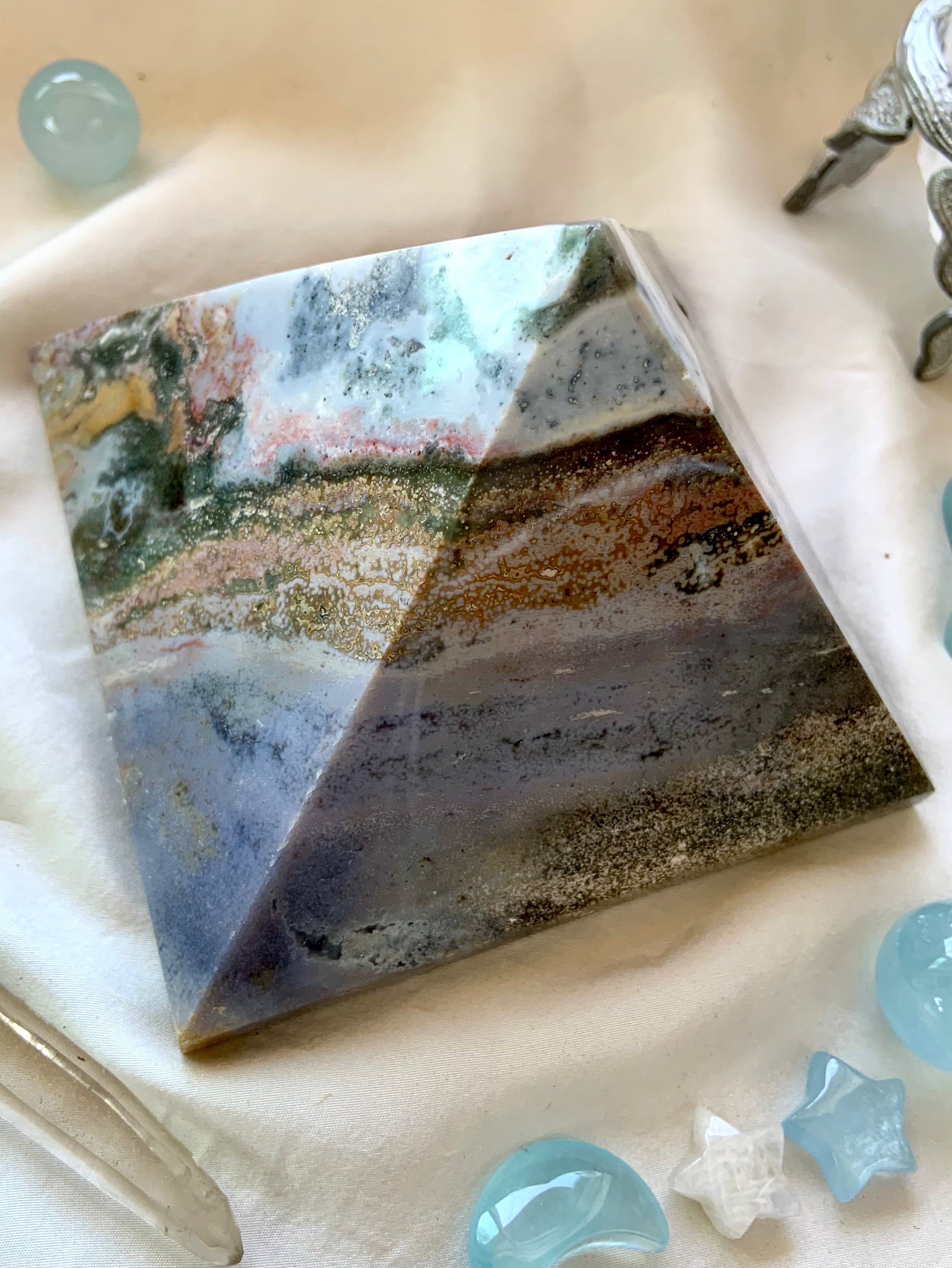 This Ocean Jasper Pyramid will assist you in working with the unseen energies of the etheric realms + facilitate a deeper awareness of those mythical, magical places beyond the veil.