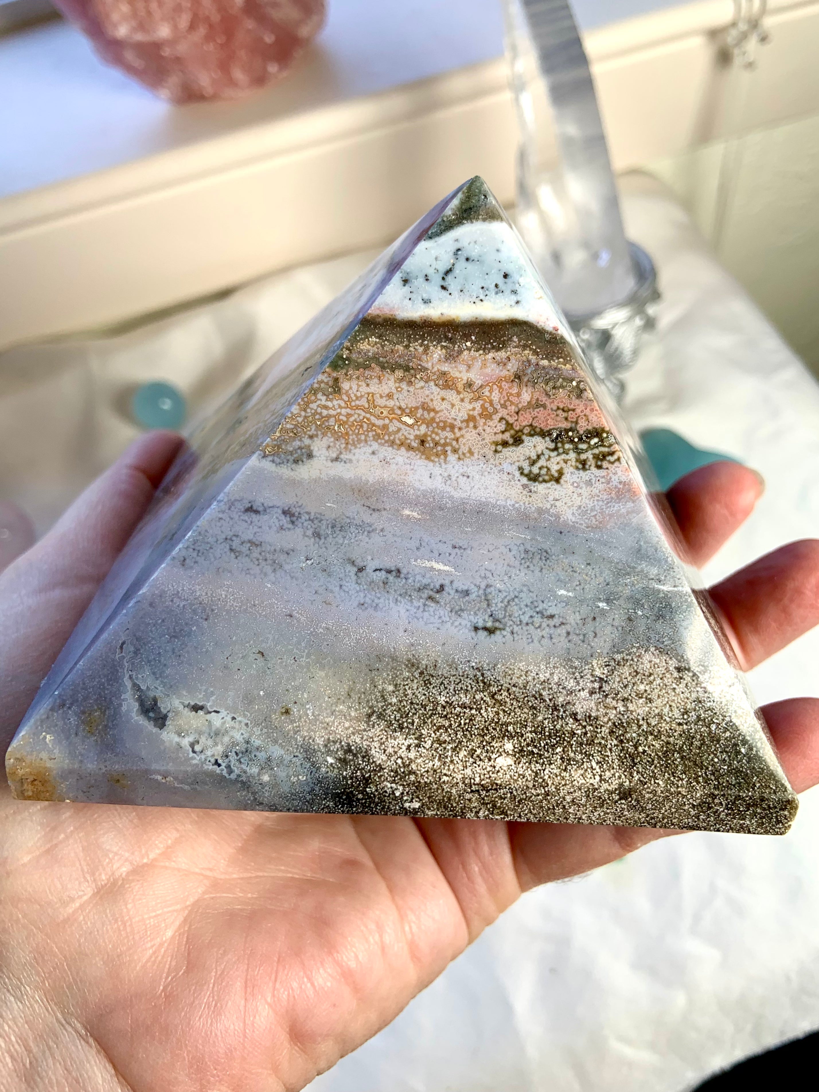 This large Ocean Jasper Pyramid is a rare collector's piece with a variety of beautiful colors + patterns in the stone on all 4 sides including pyrite flecks, loads of swirling orbs, sparkly quartz inclusions + a druzy cavern. This Crystal Pyramid is extra special with prominent swirls of the coveted color Blue Ocean Jasper running through the stone.