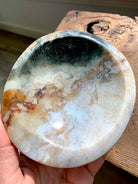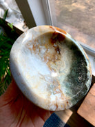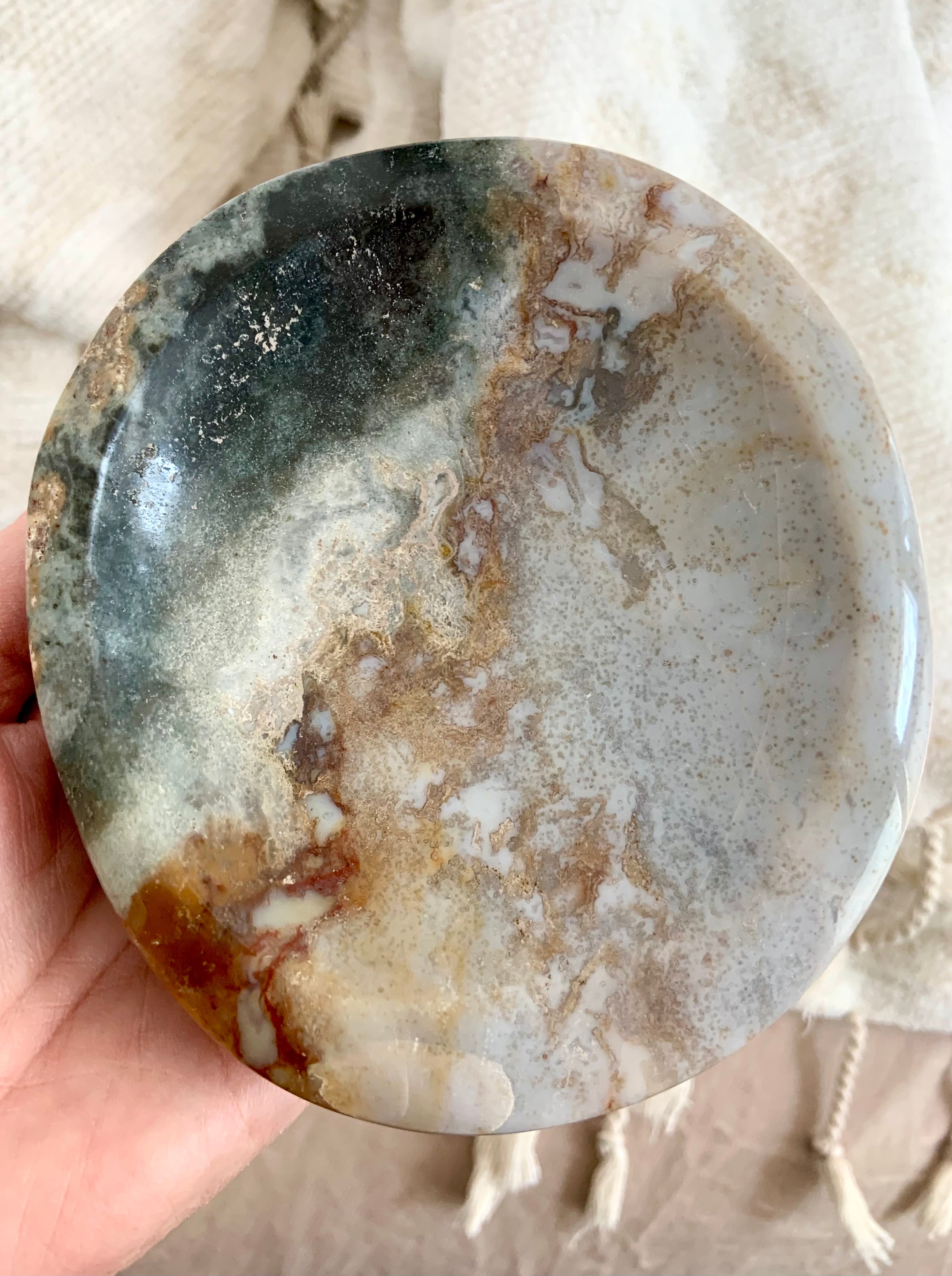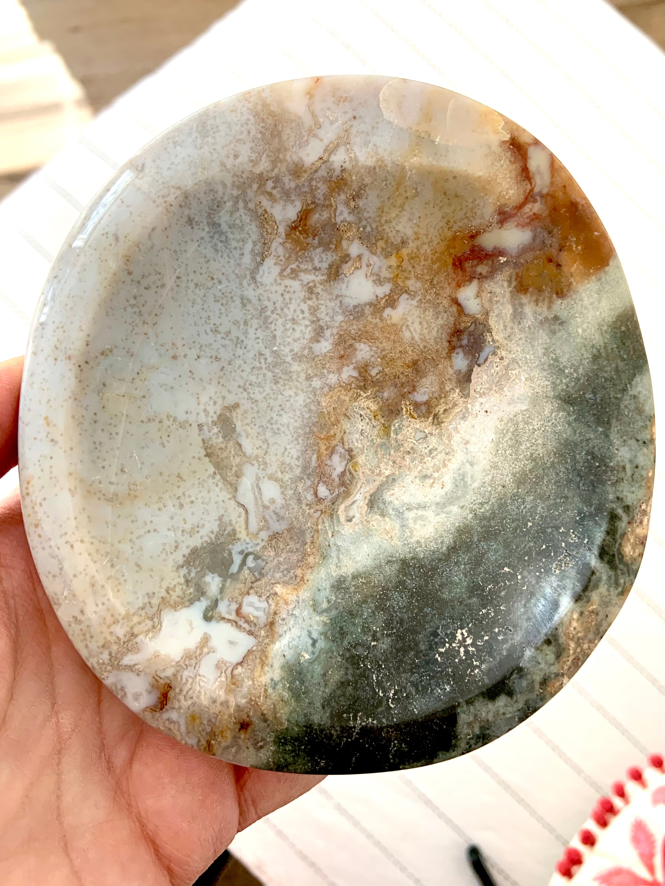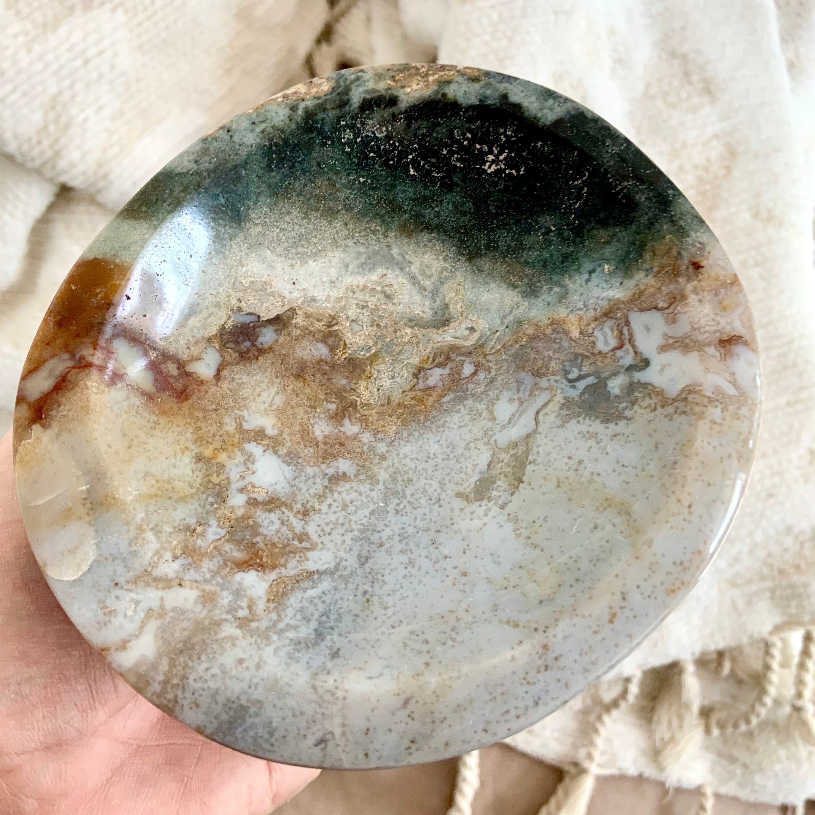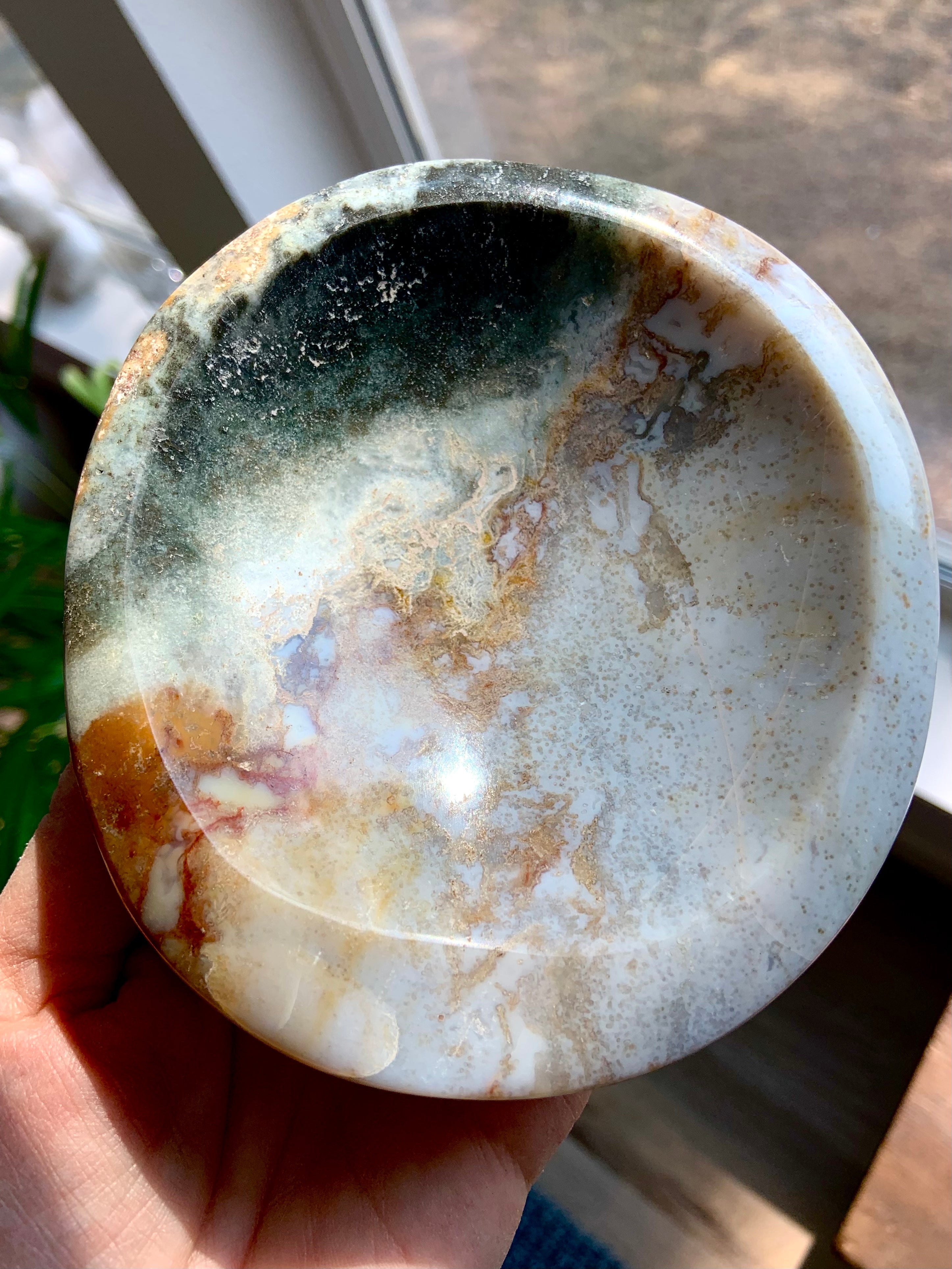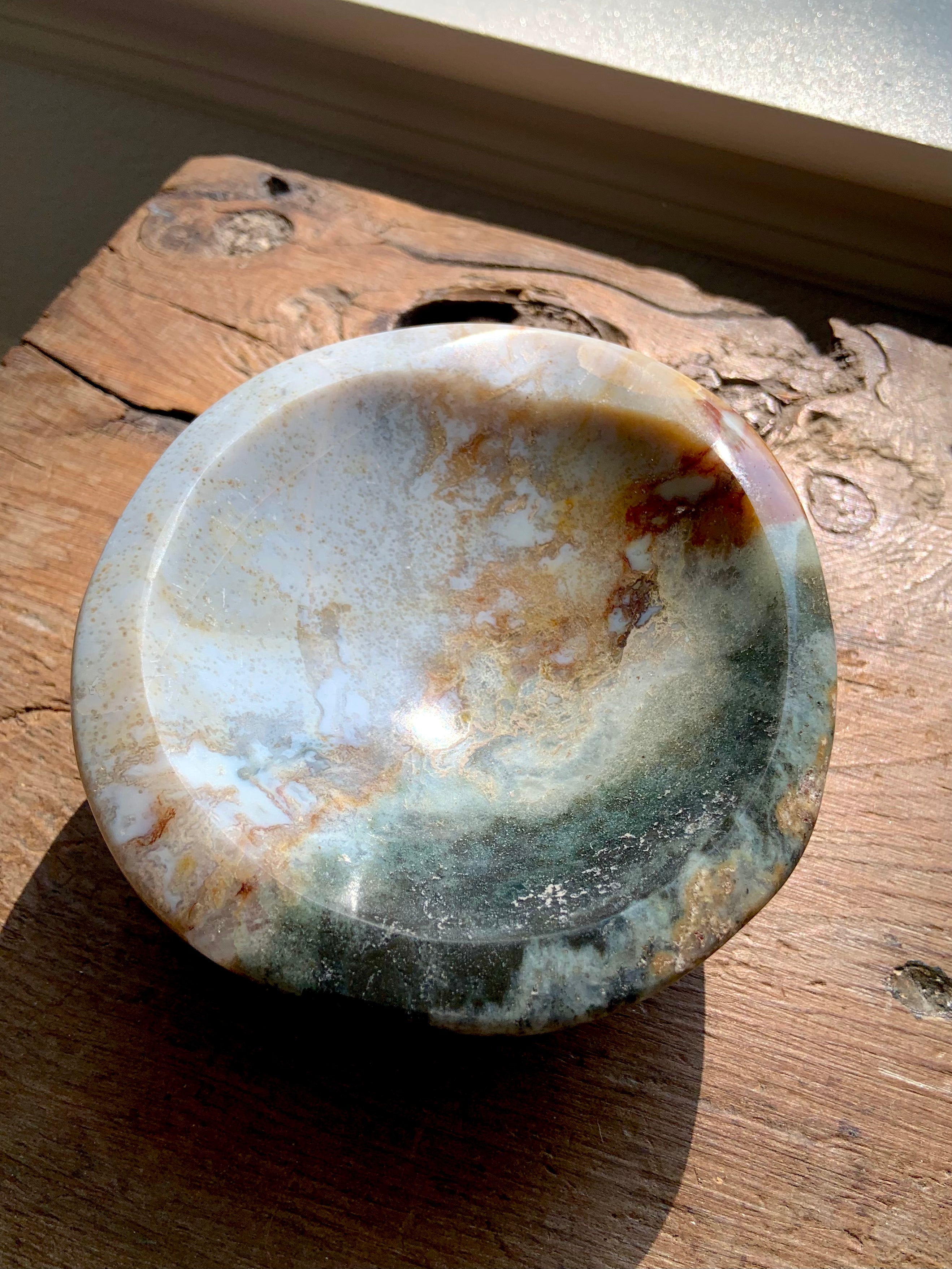 Decorate your sacred space with a beautiful, one of a kind Orbicular Ocean Jasper Bowl. Ocean Jasper brings a calm, uplifting energy to the room. This earthy, fall-colored piece of OJ is hand-carved + polished into a smooth stone vessel, a crystal bowl to hold your special things.