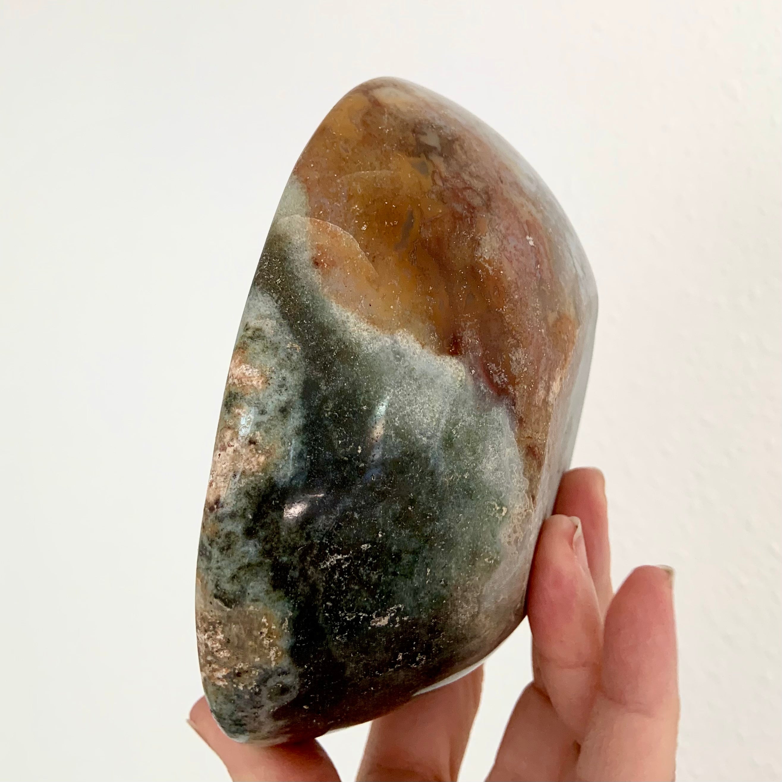 Ocean Jasper is highly beneficial for channeling spiritual wisdom + gaining insight into one’s past lives. It's helpful in meditation gently offering mental clarity + focus. This stone is grounding + centering. Orbicular Ocean Jasper is beneficial in your yoga + breathwork practice as it's a stone of continuity, facilitating deep + even circular breathing.