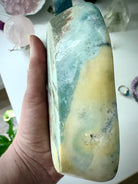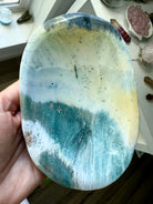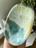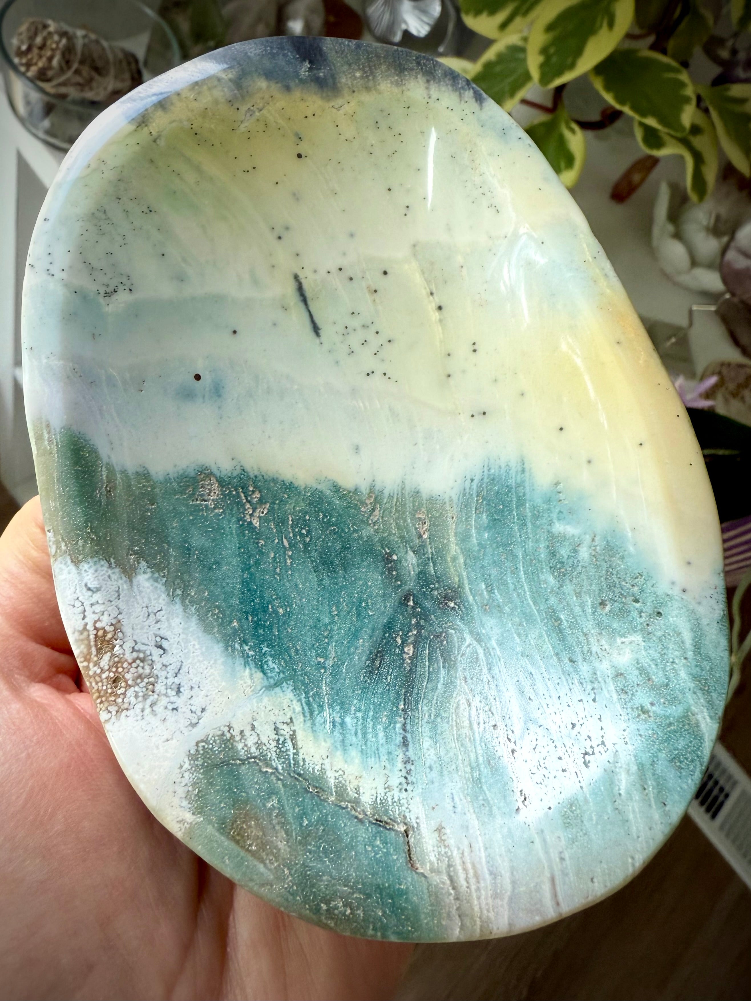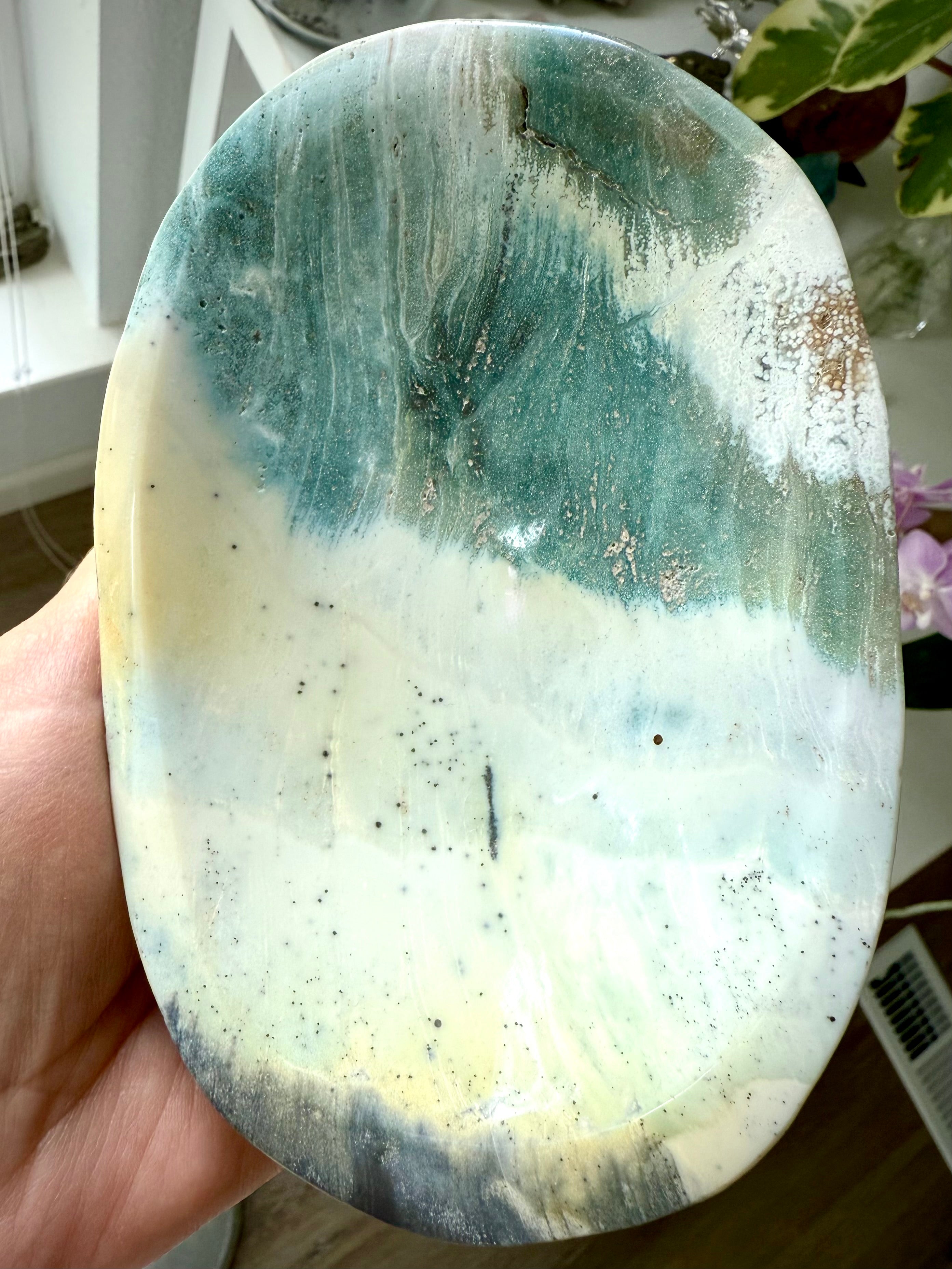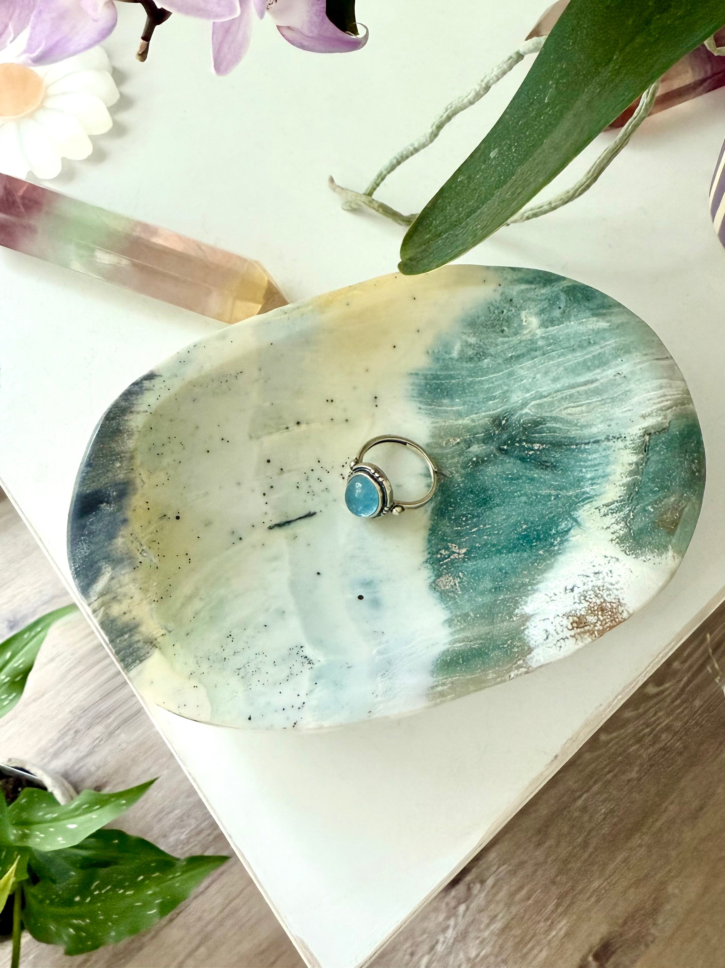 Decorate your sacred space with a beautiful, one of a kind yellow, green + blue Ocean Jasper Bowl. Ocean Jasper brings a calm, uplifting energy to the room. This multi-colored piece of Sea Jasper/ Ocean Jasper is hand-carved + polished into a stone vessel, a crystal bowl to organize + display your special things.