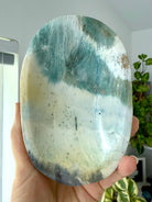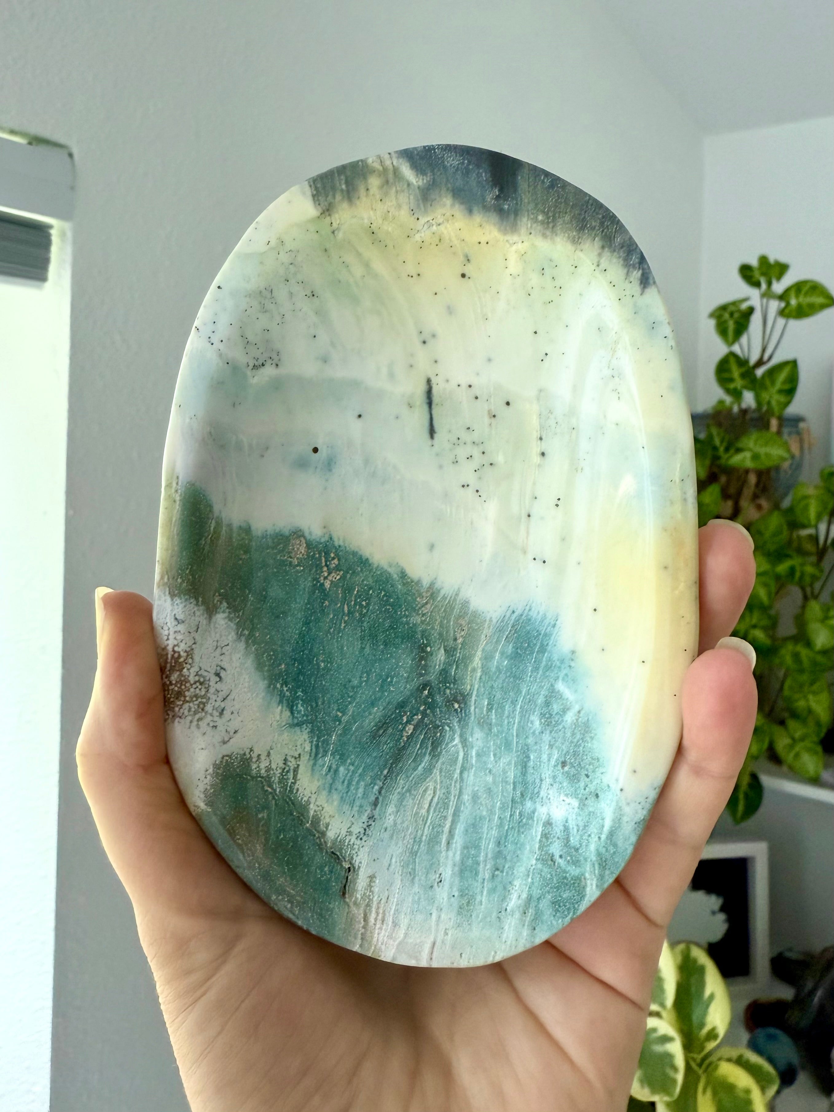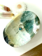 This pastel colored, oval shaped Jasper bowl has a painterly array of rare blue, green, yellow, gray + white. This lovely piece of jasper is filled with tiny orbs reminiscent of bubbles swirling up from the depths of the Sea floating in undulating oceanic colors + brush stroke patterns.