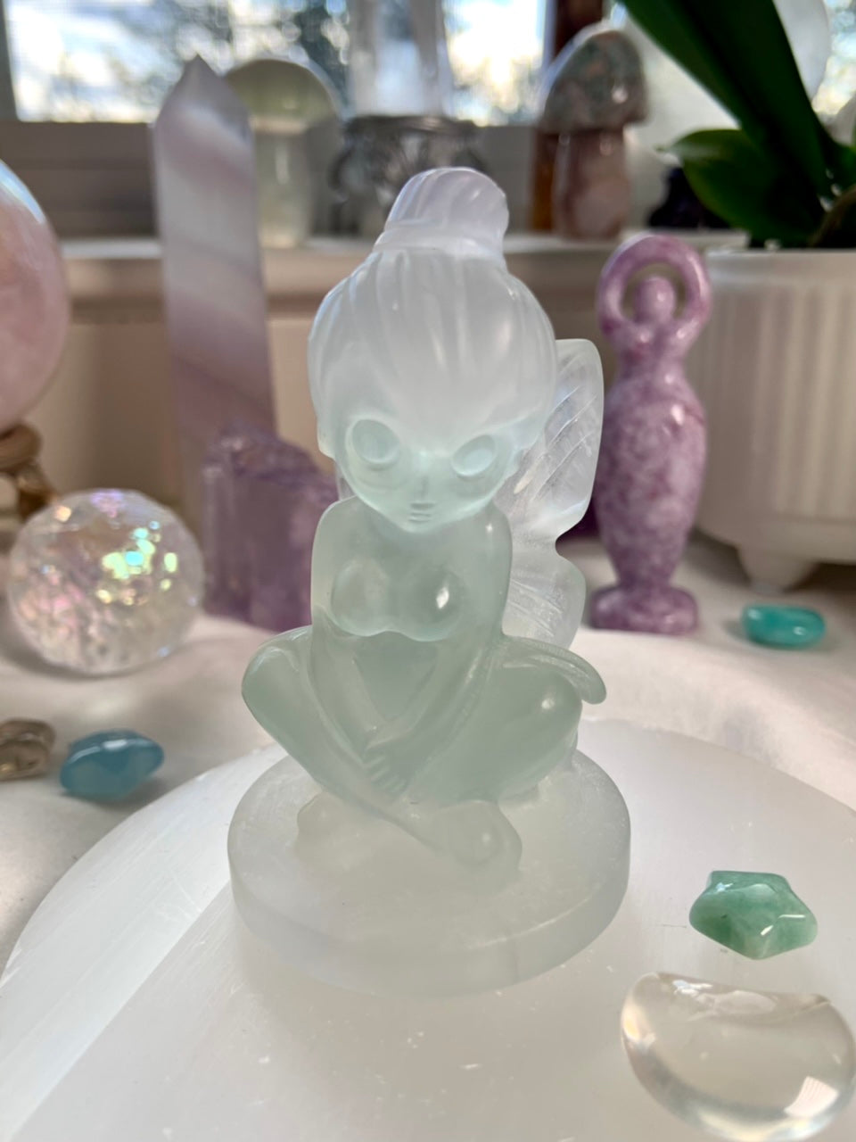 You will receive the exact pastel fluorite crystal fairy you choose from these pics. Each piece has slight variations in the stone + carving. Natural stones may have inherent marks, mineral inclusions, or slight imperfections. Weights + measures are approximate.
