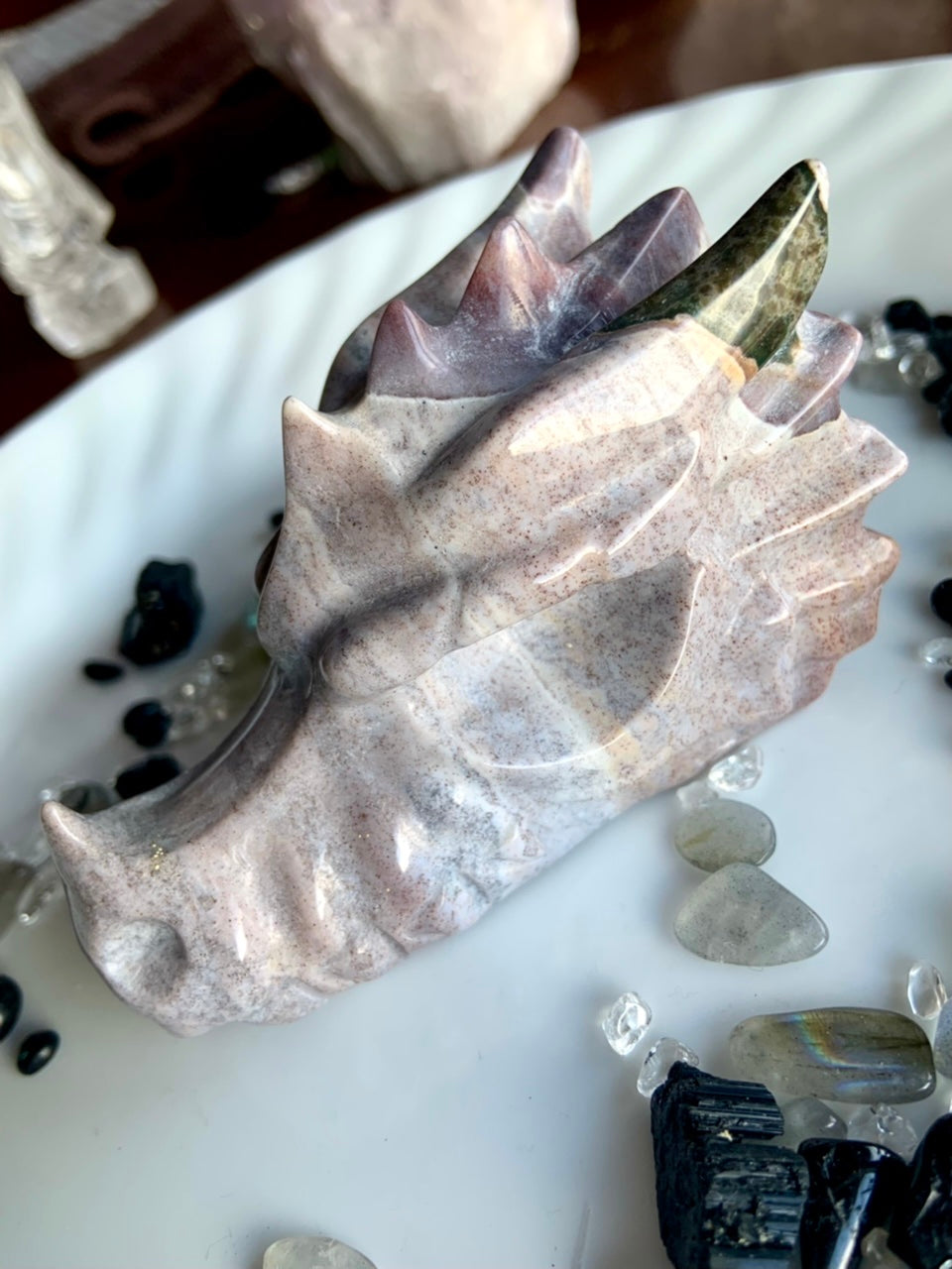 This Ocean Jasper Dragon is full of wisdom + personality. Your pastel Ocean Jasper Dragon is a unique combination of the Earth's minerals borne of primordial volcanoes + the Sea. Ocean Jasper works with your Heart Chakra + has both Fire + Water elemental energy with a touch of Earthy, grounding energy as well.