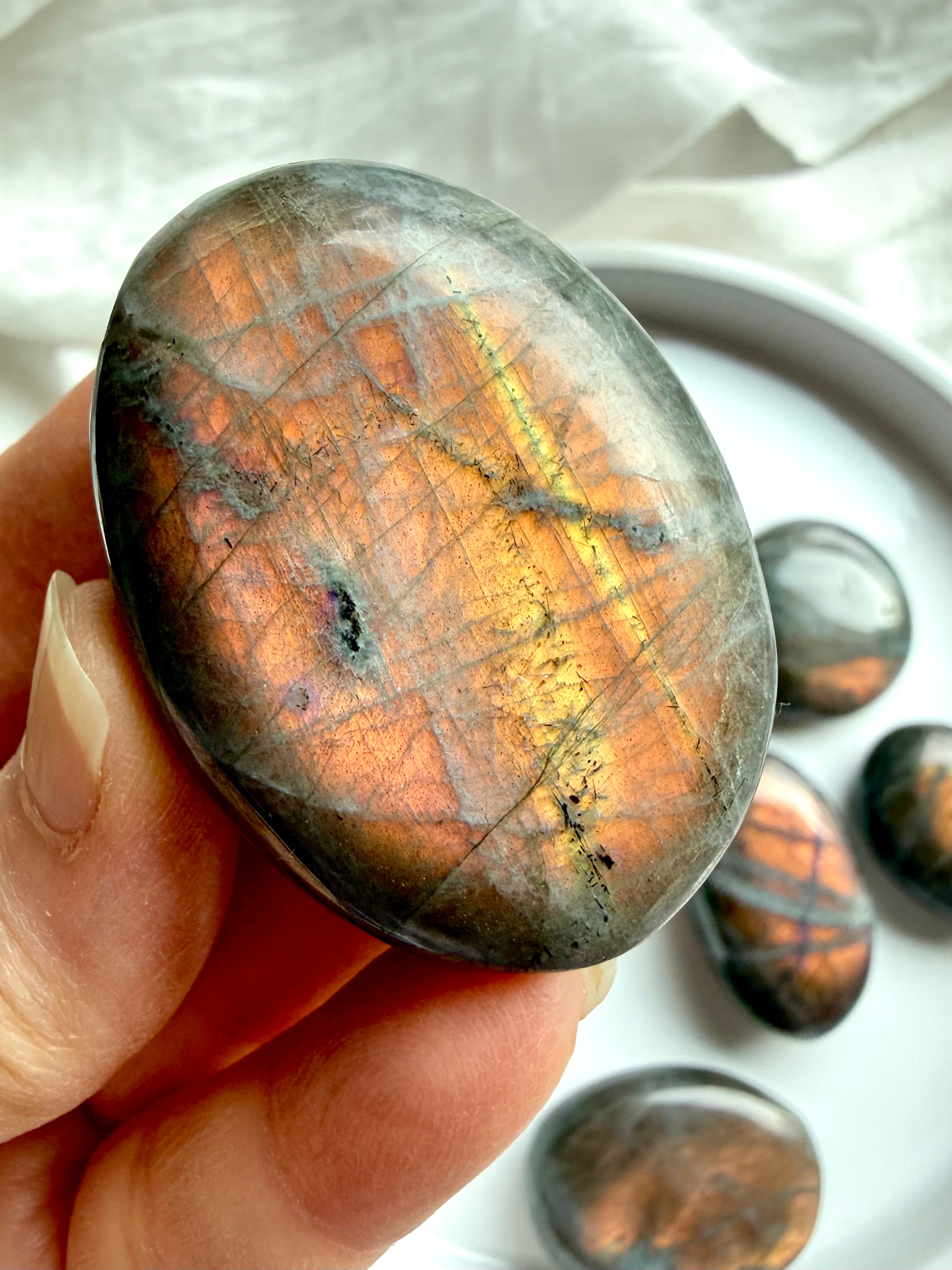 Photos show the range of Peachy Sunset Labradorite palm stones you may receive. Each piece is intuitively selected from the size you choose, with natural variation in shape, tone, surface pattern, and flash intensity. Flash coverage varies naturally β each stone will reveal strong copper-peach labradorescence on one side when moved in light, many stones also have some flash on the back side .