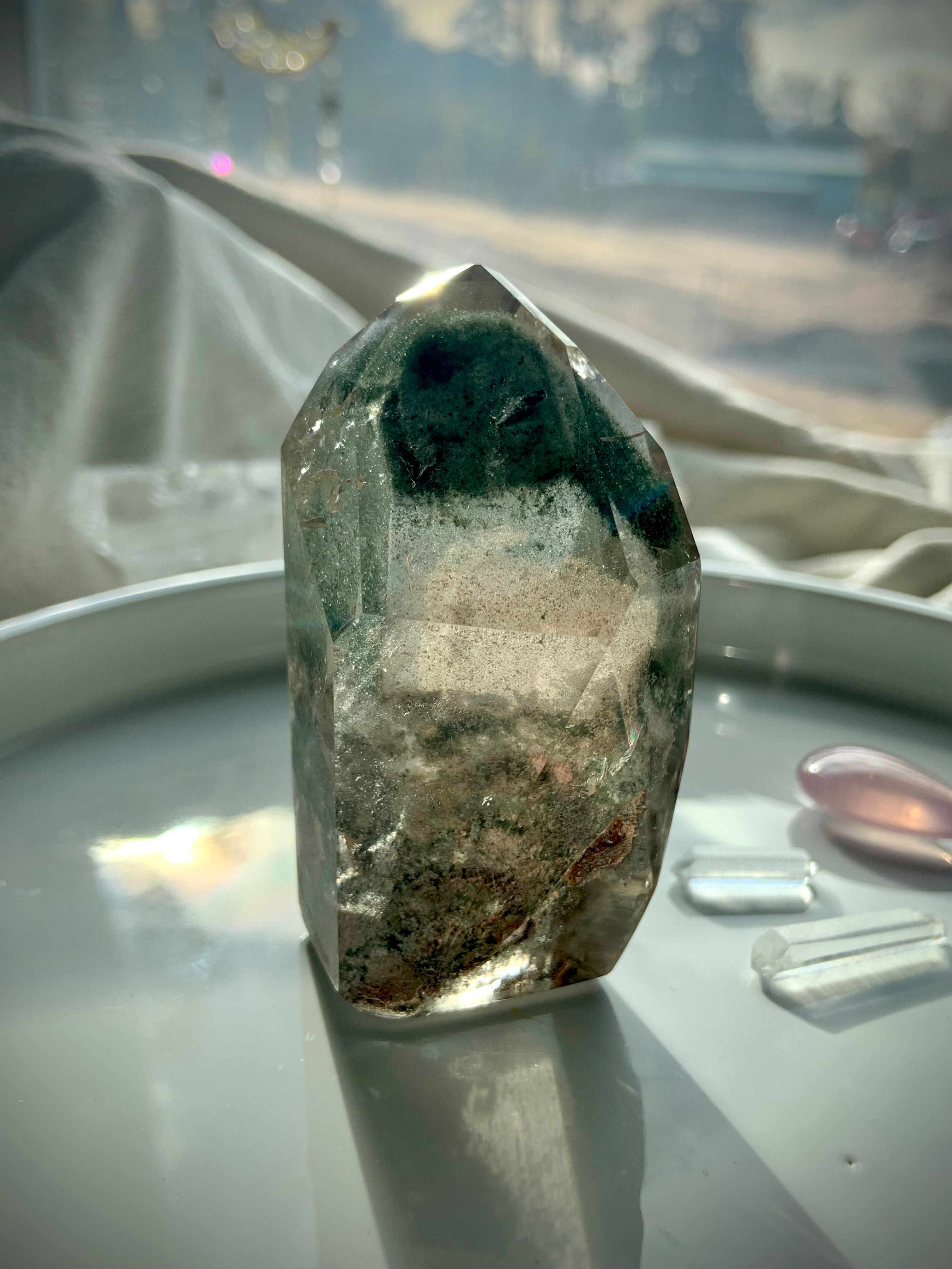 Chlorite included Quartz Crystals have a strong heart-centered energy + can help us mitigate some of the side effects of modern living. Rainbows in your crystals bring out hidden joy, optimism + understanding.