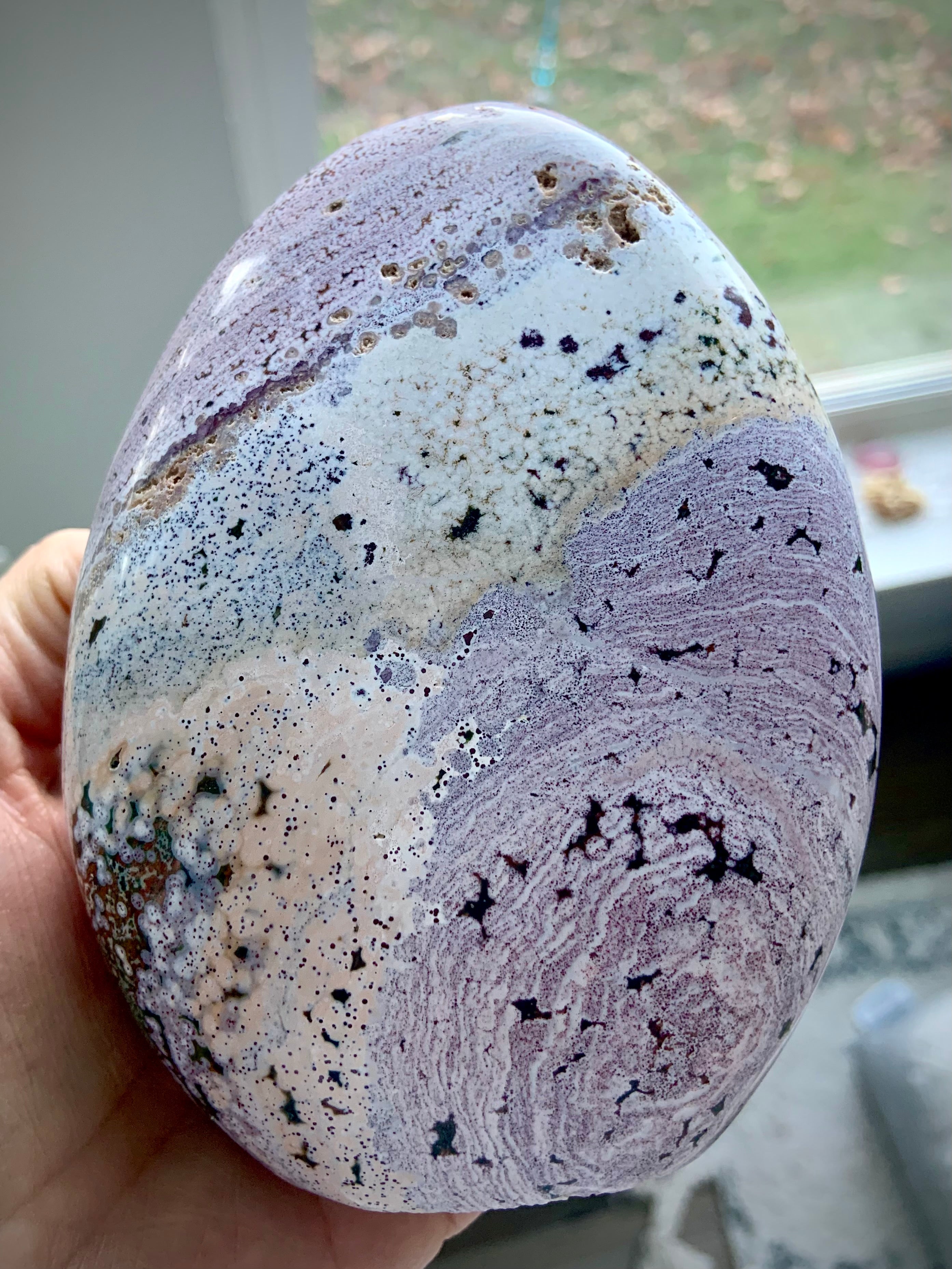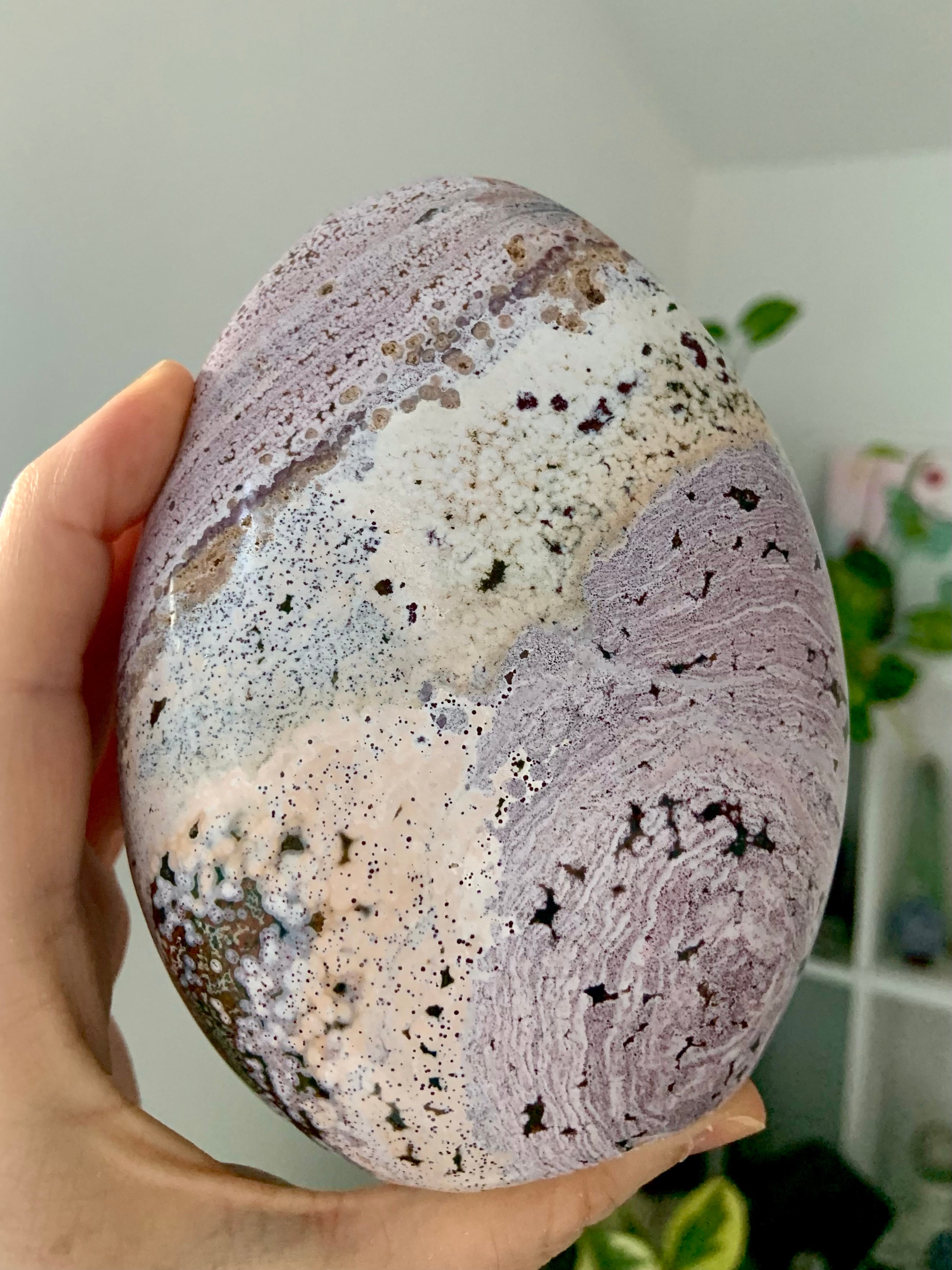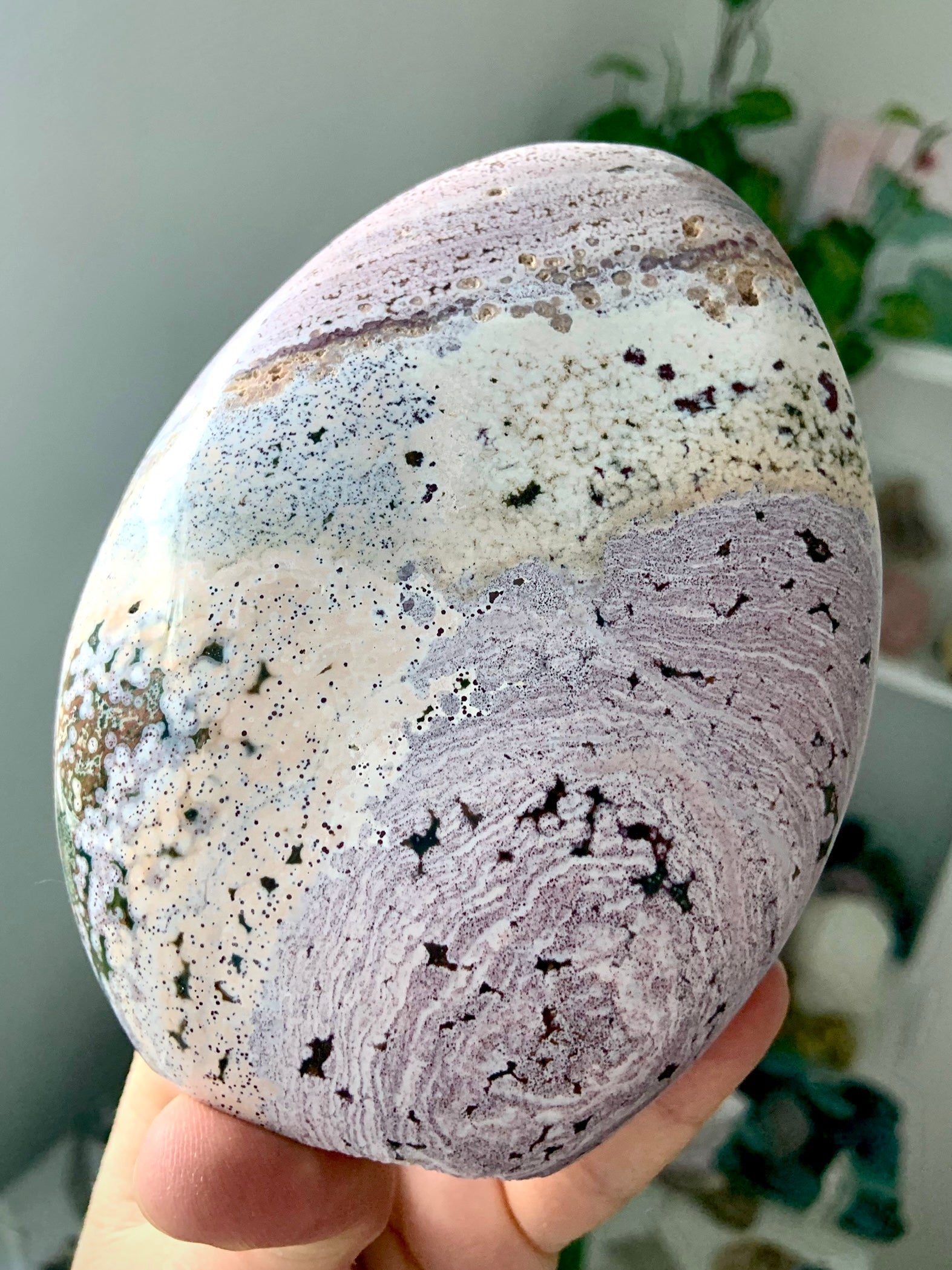 Ocean Jasper is also known as orbicular jasper due to it's swirling + orb-like inclusions of color. These round orbs associate with the circle + sphere, traditional symbols of wholeness.