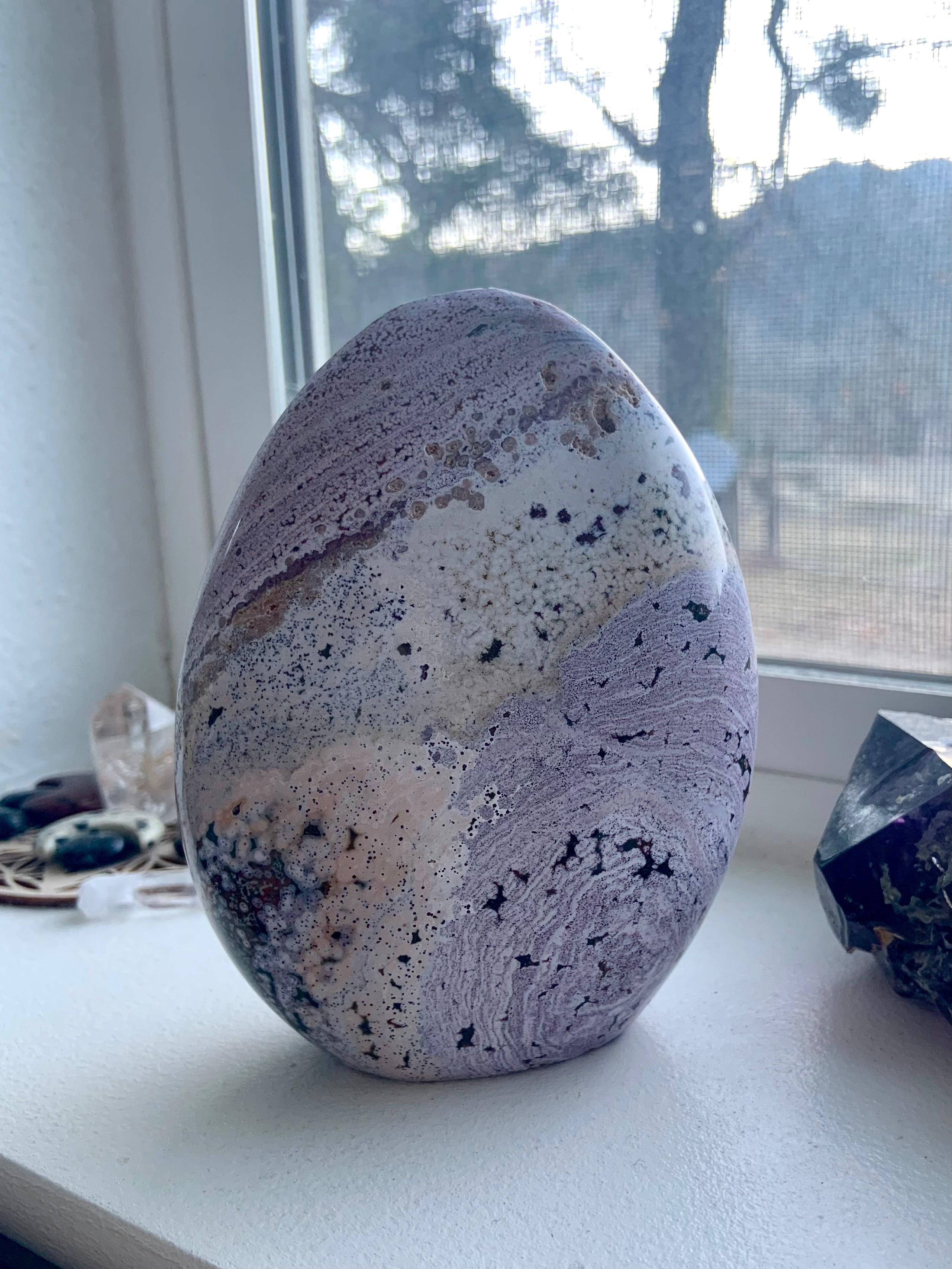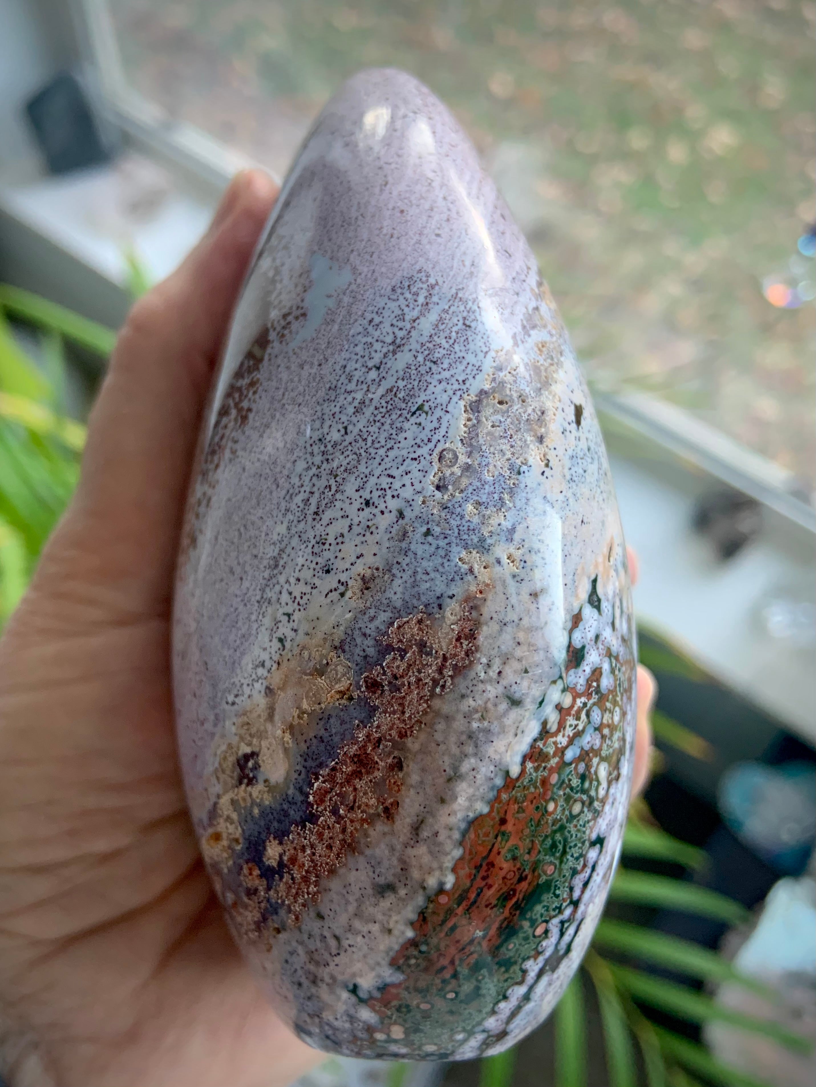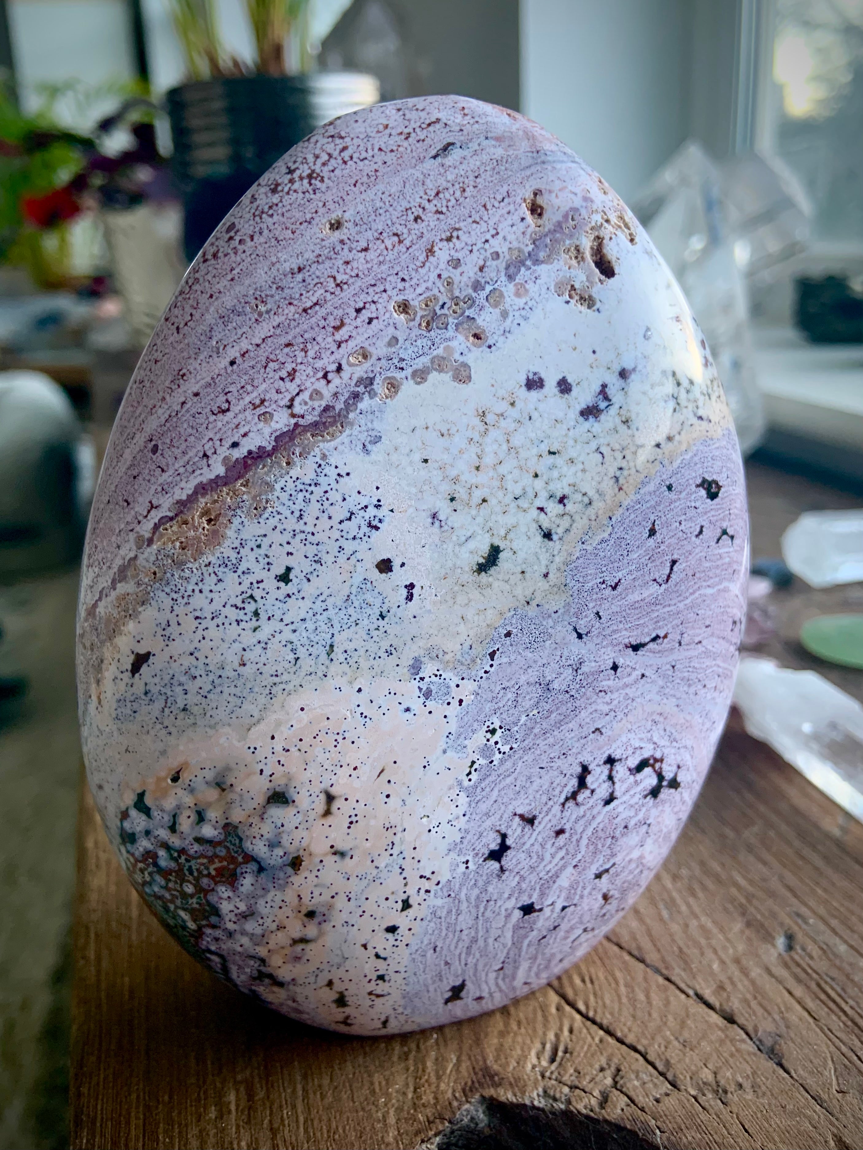 This very special piece of Ocean Jasper will make a prominent addition to your crystal display, radiating a soothing, gentle, heart-expanding energy.