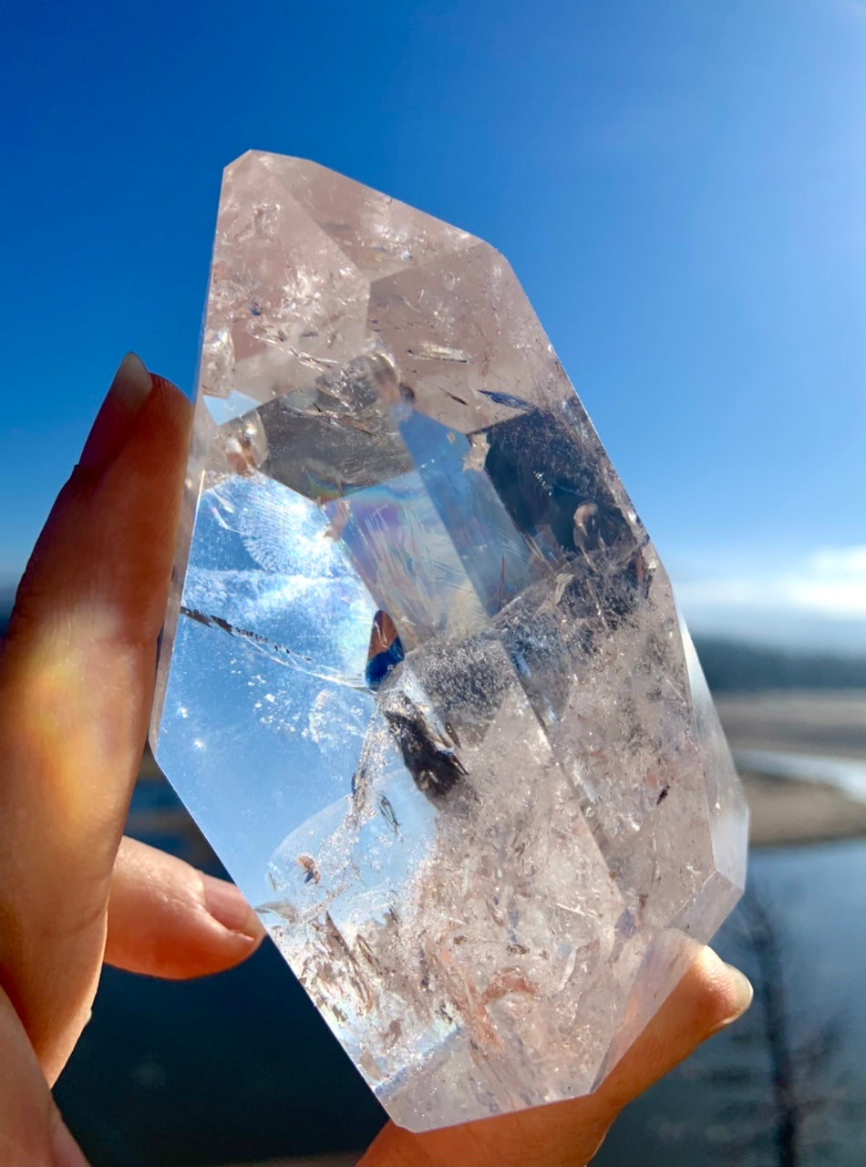 This gorgeous polished clear quartz crystal has loads of magical rainbows with some beautiful interior dimensions, including flashy silver crackle + bubbly galaxy patterns that are highlighted by cascading angles + prismatic facets on all sides of the point.