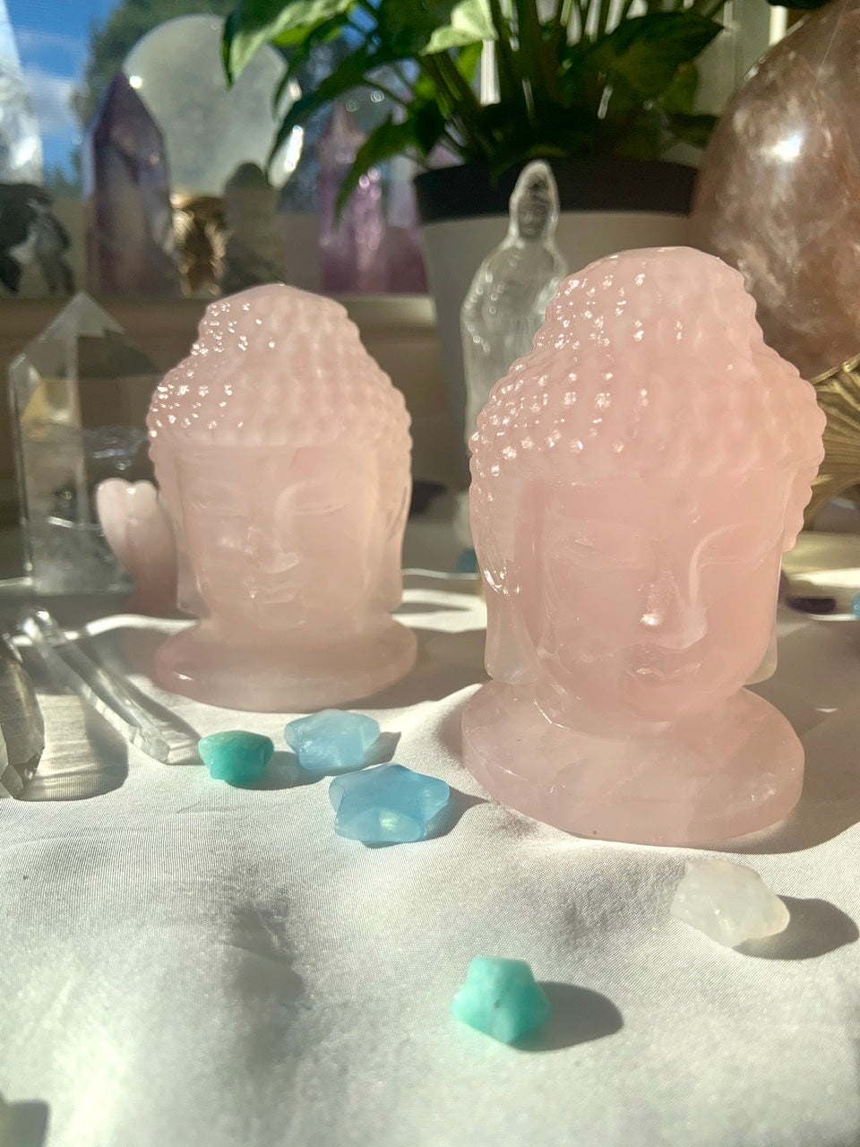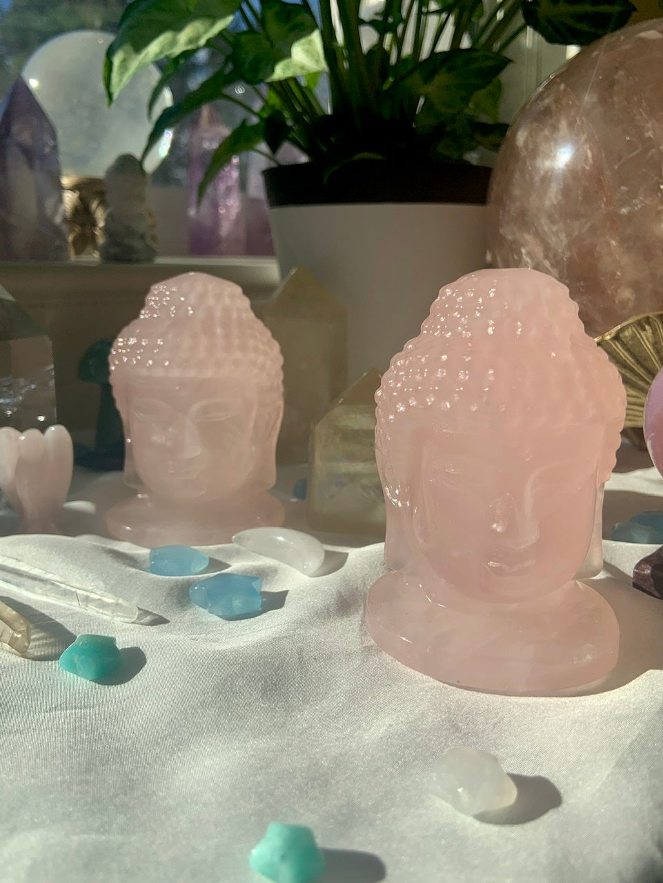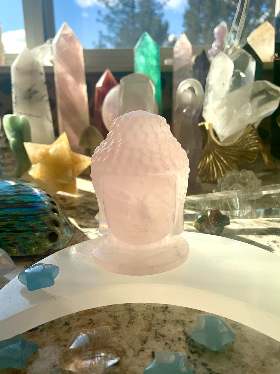 Place a luminous Rose Quartz Buddha Head in your sacred space + feel the profound shift energetic as calming energy permeates like water. A Buddha carving is addition to your Zen decor, meditation altar, treatment room, or yoga studio.