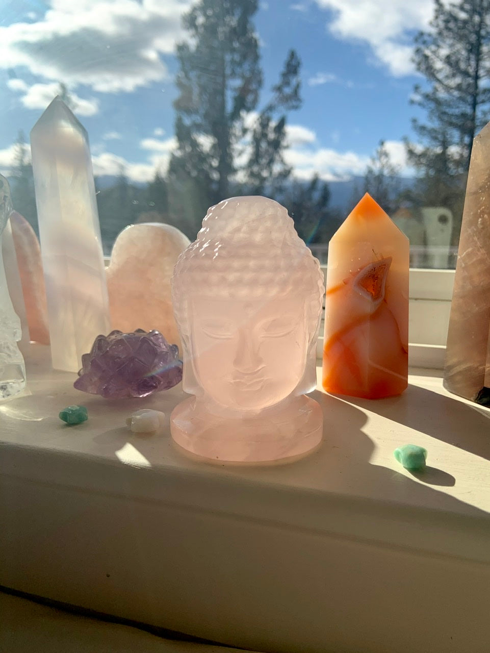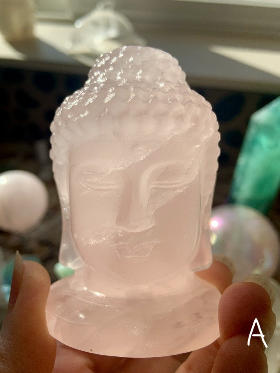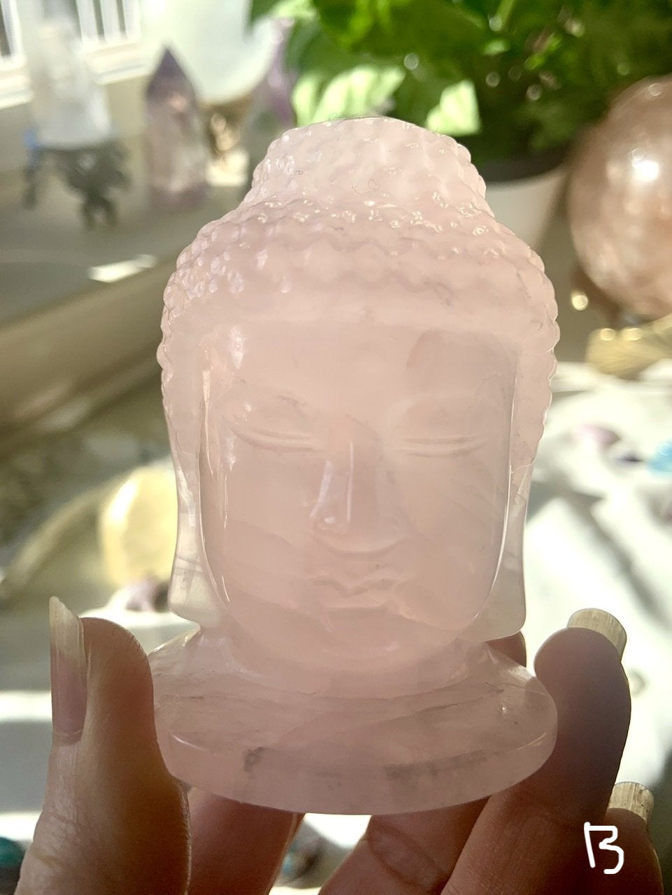 Place a luminous Rose Quartz Buddha Head in your sacred space + feel the profound shift energetic as calming energy permeates like water. A Buddha carving is addition to your Zen decor, meditation altar, treatment room, or yoga studio.