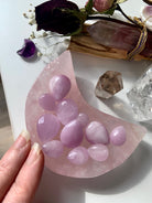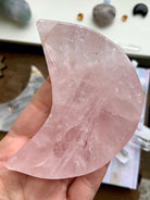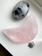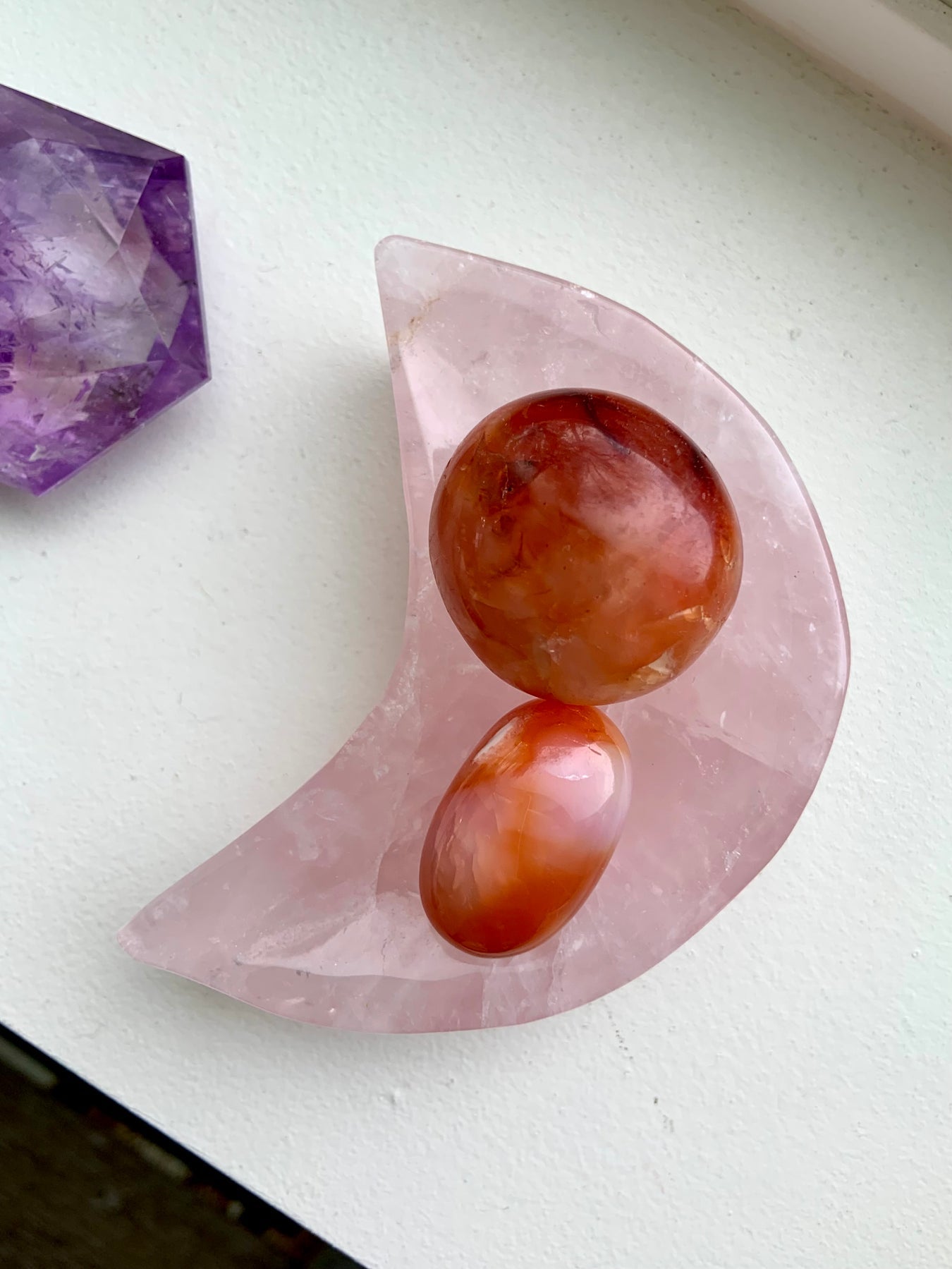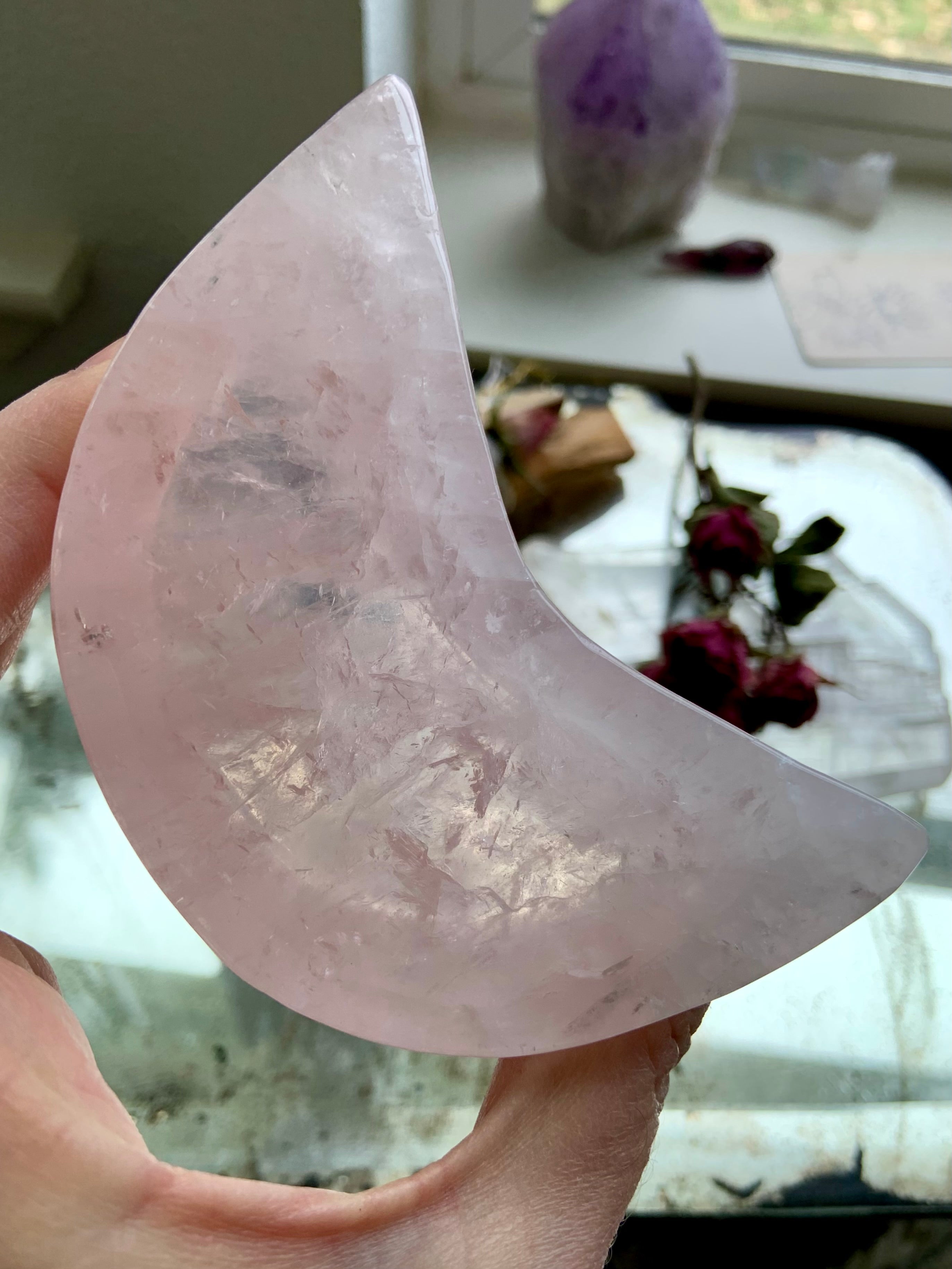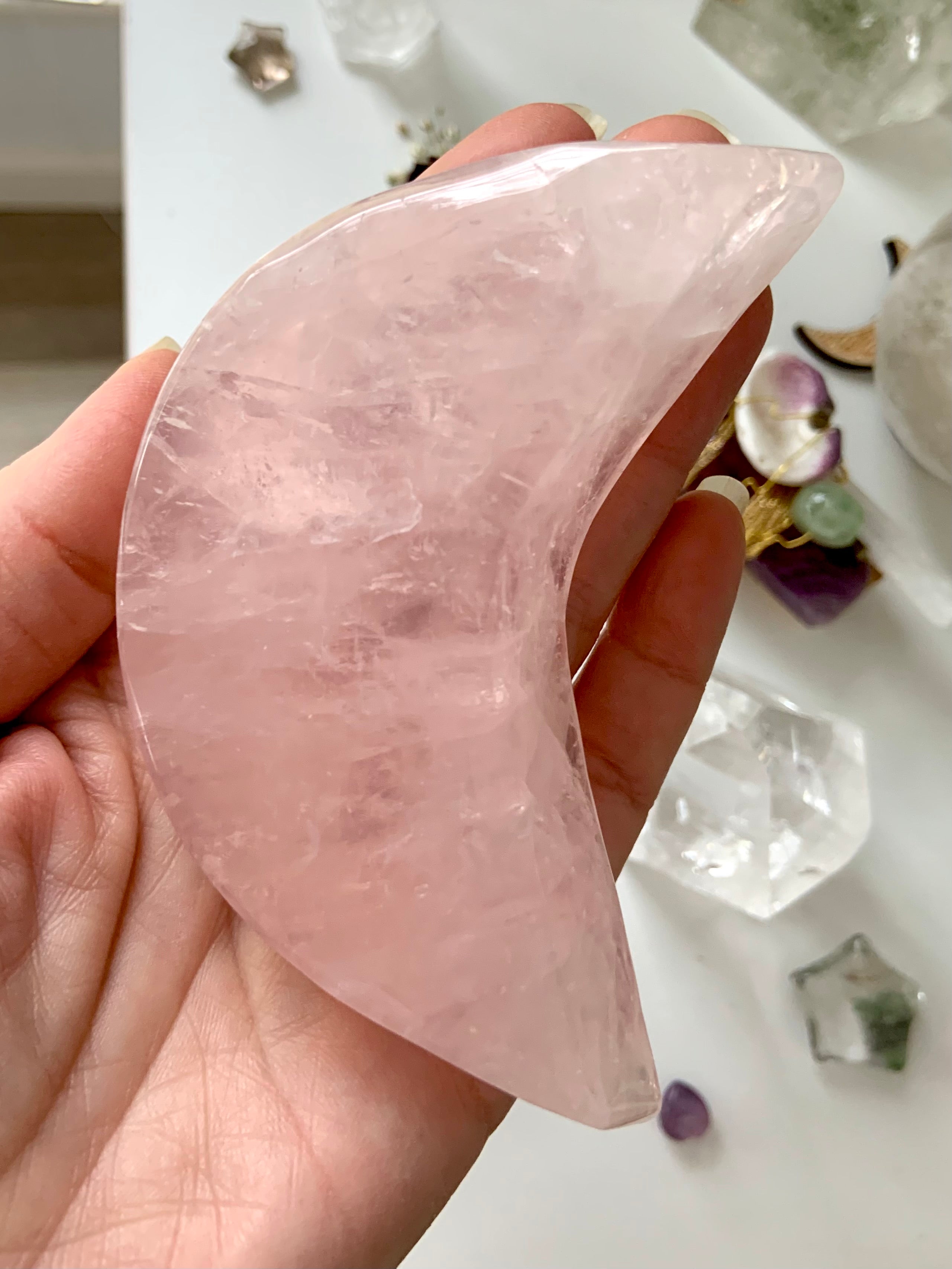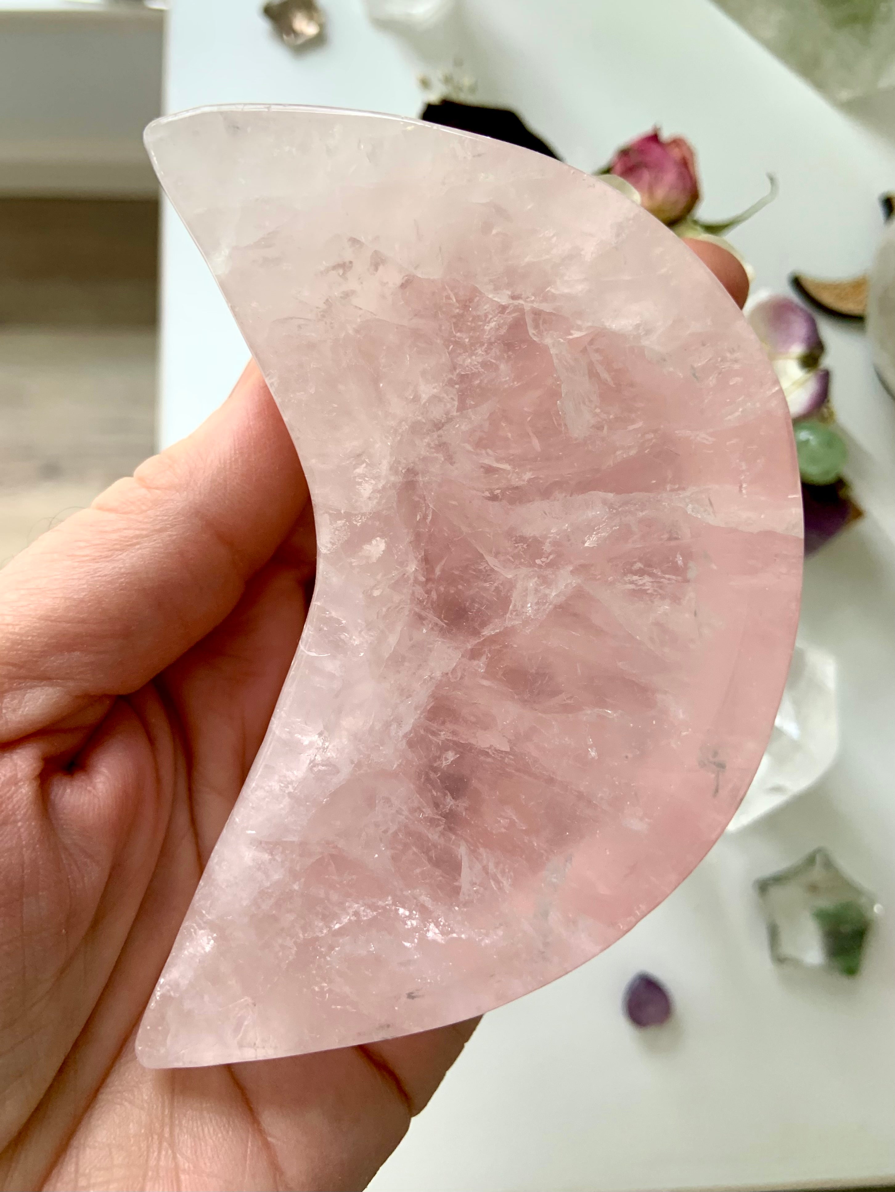 This crystalline hand carved Rose Quartz Crescent Moon Bowl is perfect for using in sacred ceremony + for holding your special things, jewelry + crystals. Peaceful pink Rose Quartz Crystal has a divine feminine energy that compliments your crystal decor, vanity or bedside table. Bringing some lunar love + divine feminine healing into your sacred space with this one of a kind crystal offering bowl.