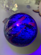 Comes with the simple wood stand in the pics. This piece has a high quality glossy smooth polish with a barely noticeable texture in the stone. The crystal sphere looks different from all sides, angles + in different lighting. Photos taken in indirect natural light, plus the one pic showing the UV reaction using a UV flashlight.
