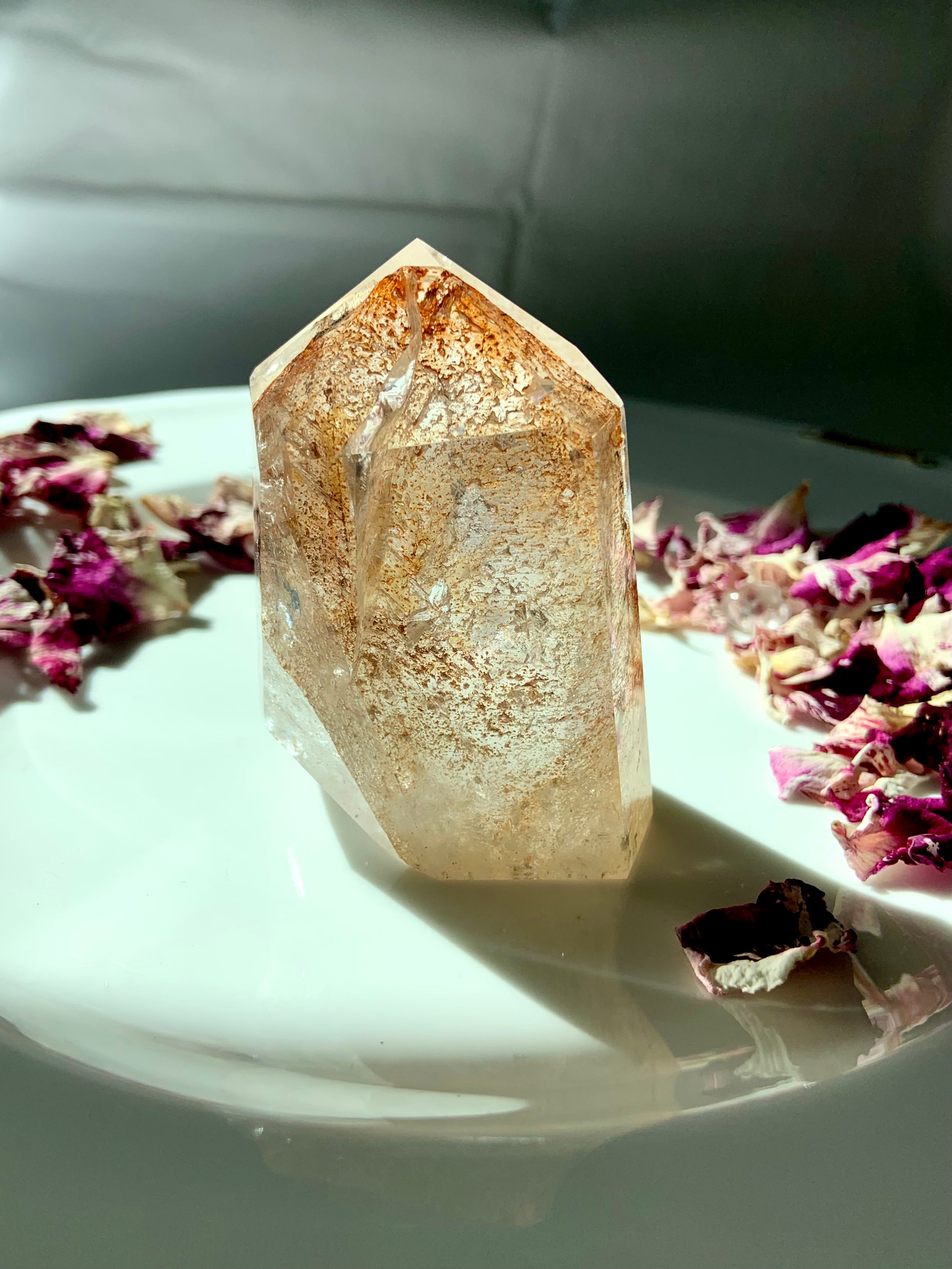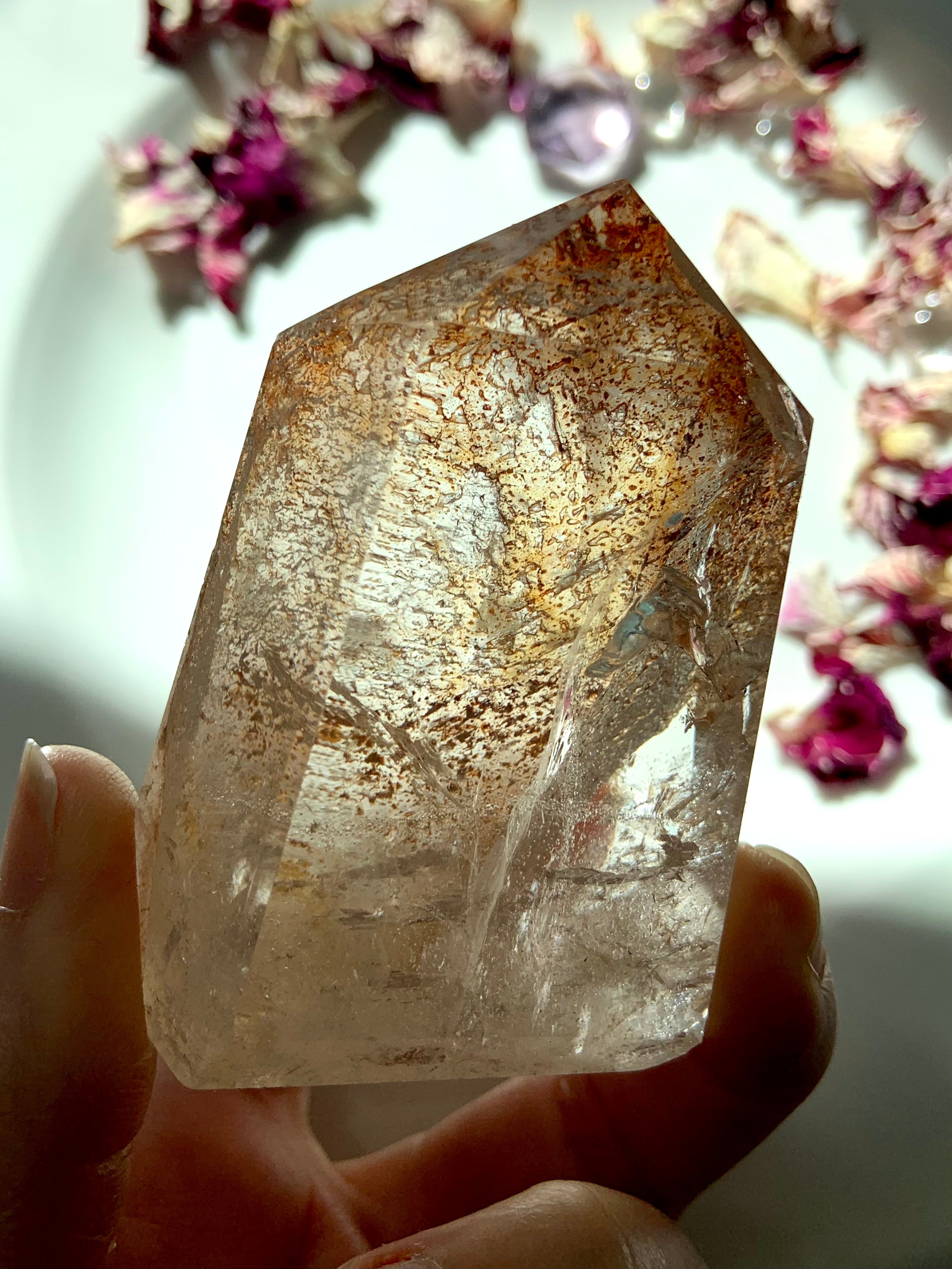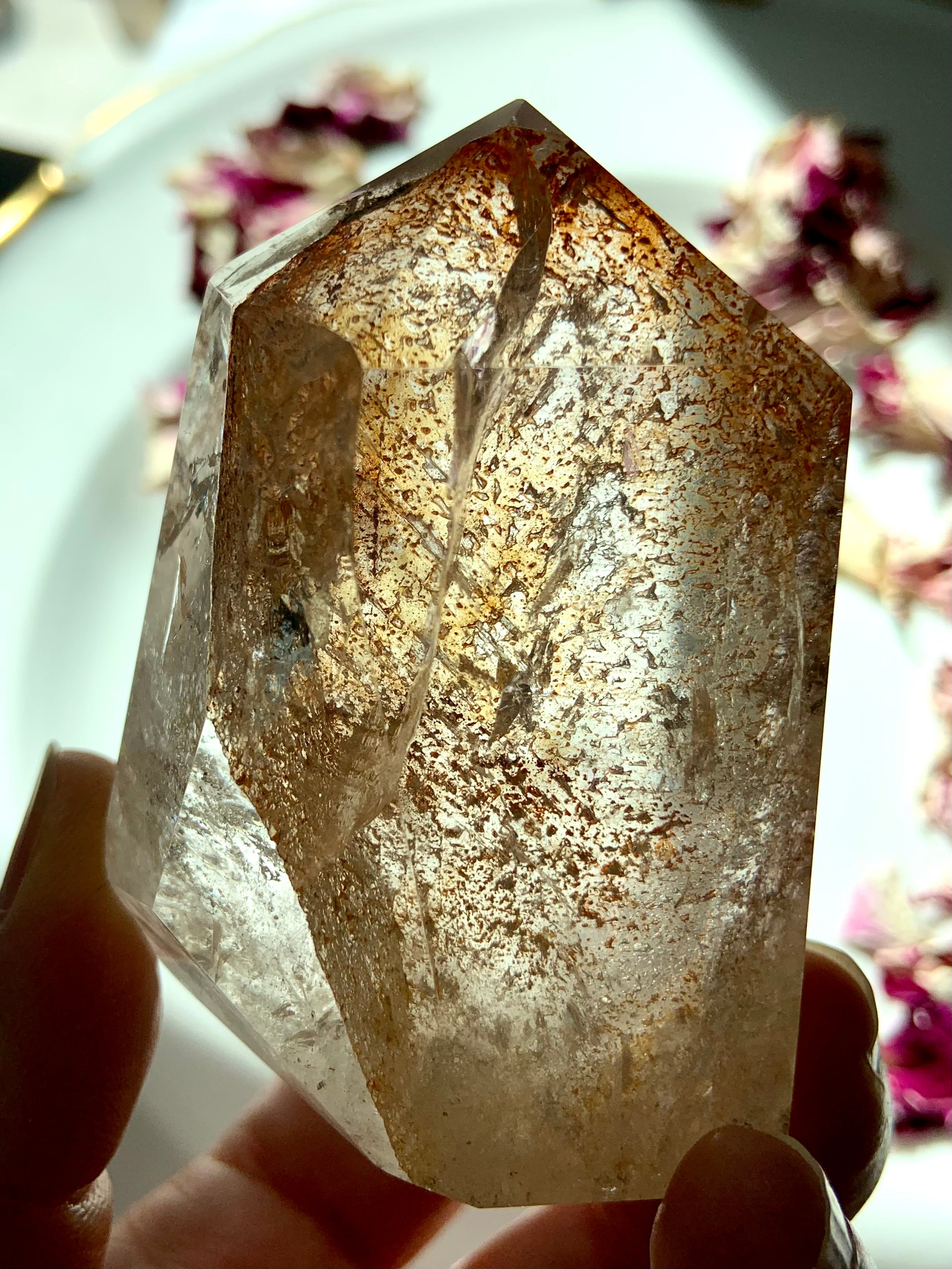 The sparkly hieroglyphs or circuit boards running through the crystal can awaken your akashic wisdom + dormant DNA. This stunning Hematoid Quartz Crystal is a powerful metaphysical healing tool, a sacred ally for meditation + expanded consciousness.