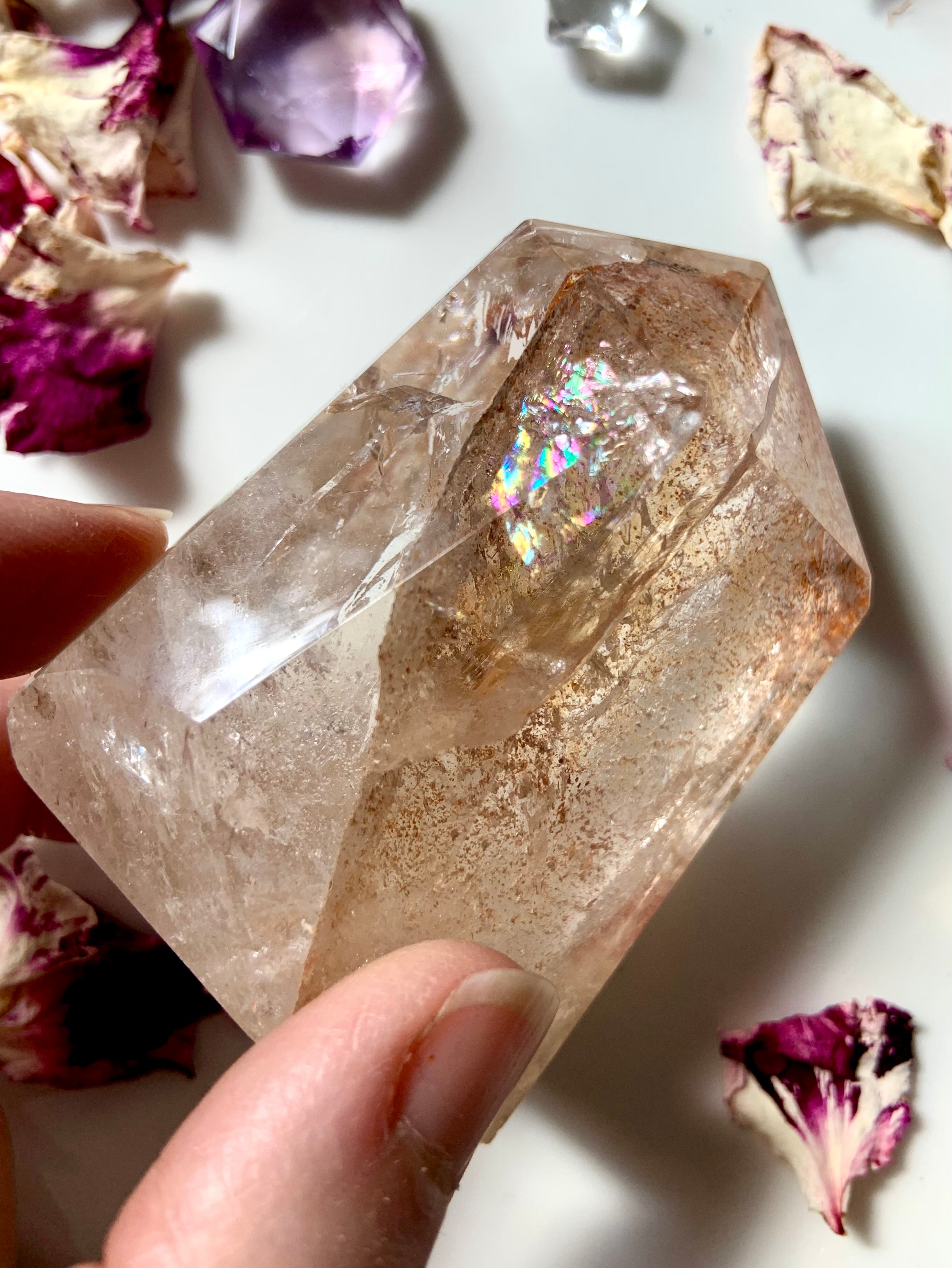 Fire Quartz + Golden Healer is also known as Ferruginous Quartz, Hematoid Quartz, or Hematite Included Quartz. These striking stones get their name from rich iron Hematite inclusions + are filled with beautiful streaks of water clear quartz + reds, reflected flashes of light + occasional rainbows too.
