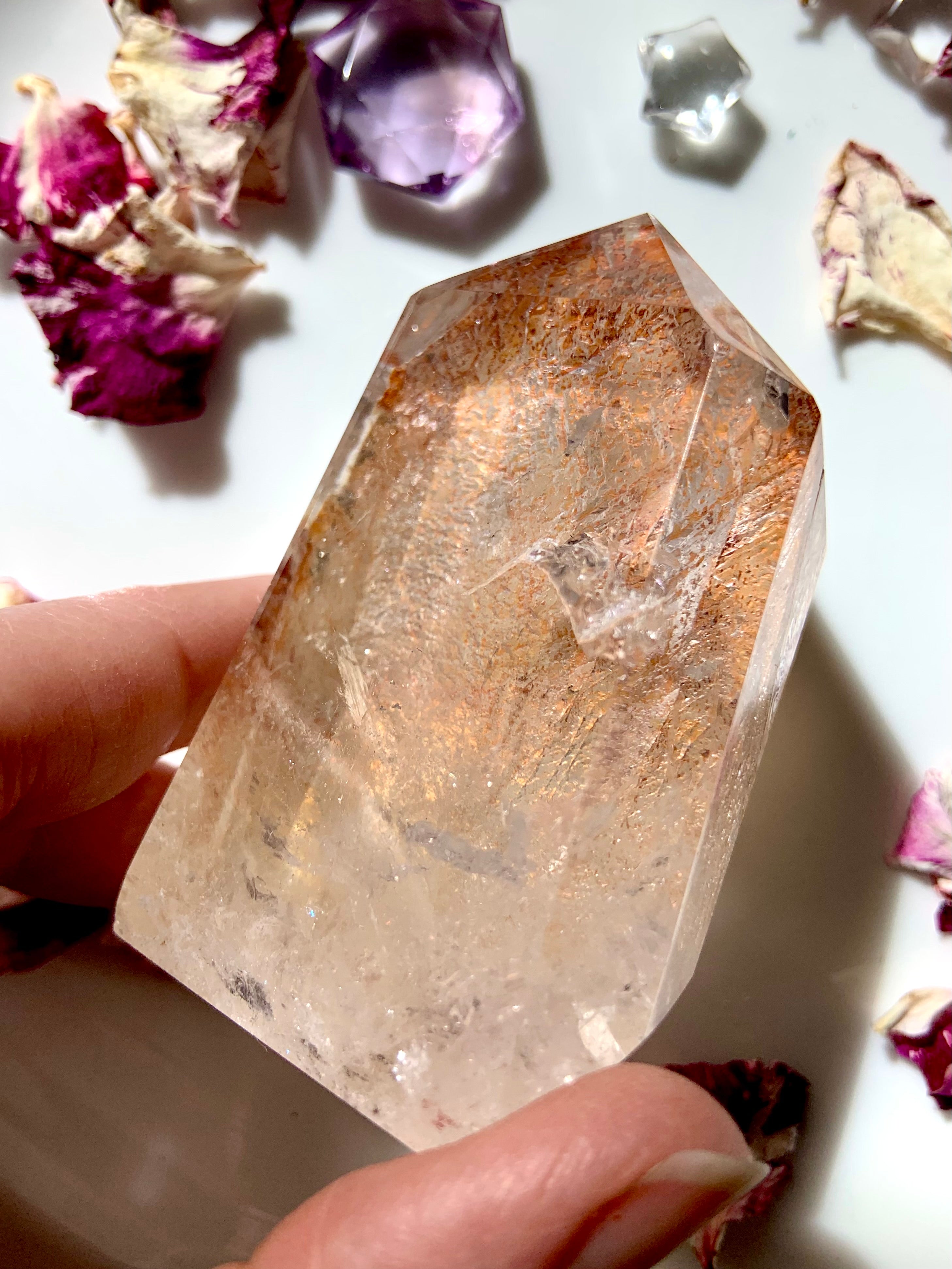 This polished point is small but powerful, big enough to make a beautiful centerpiece for your crystal grids, altar, or to hold in meditation. This magical crystal has a high energetic vibration that can assist in transforming + transmuting negativity into a more positive energetic state.