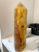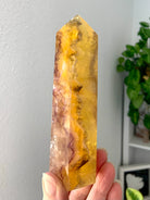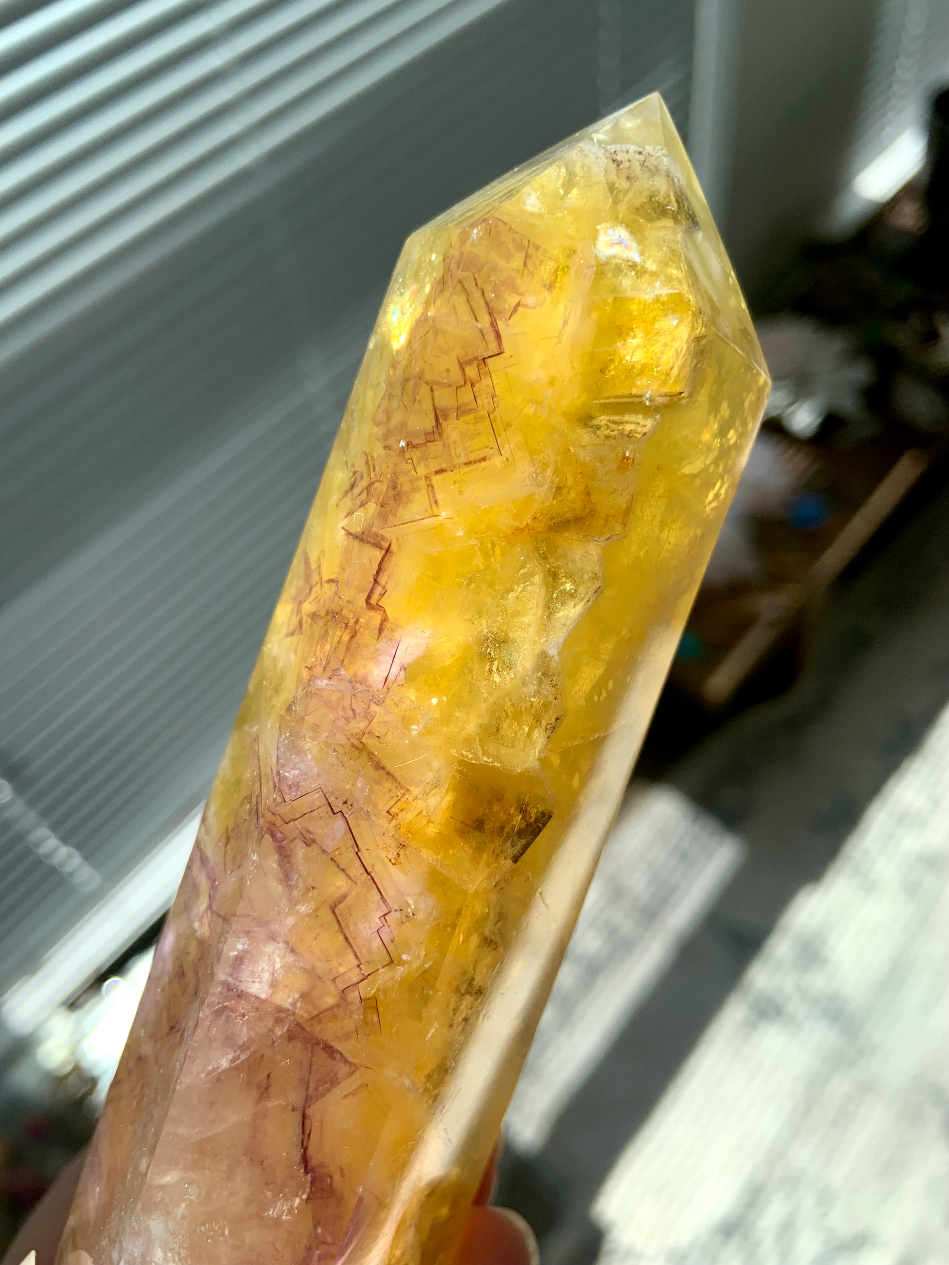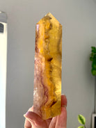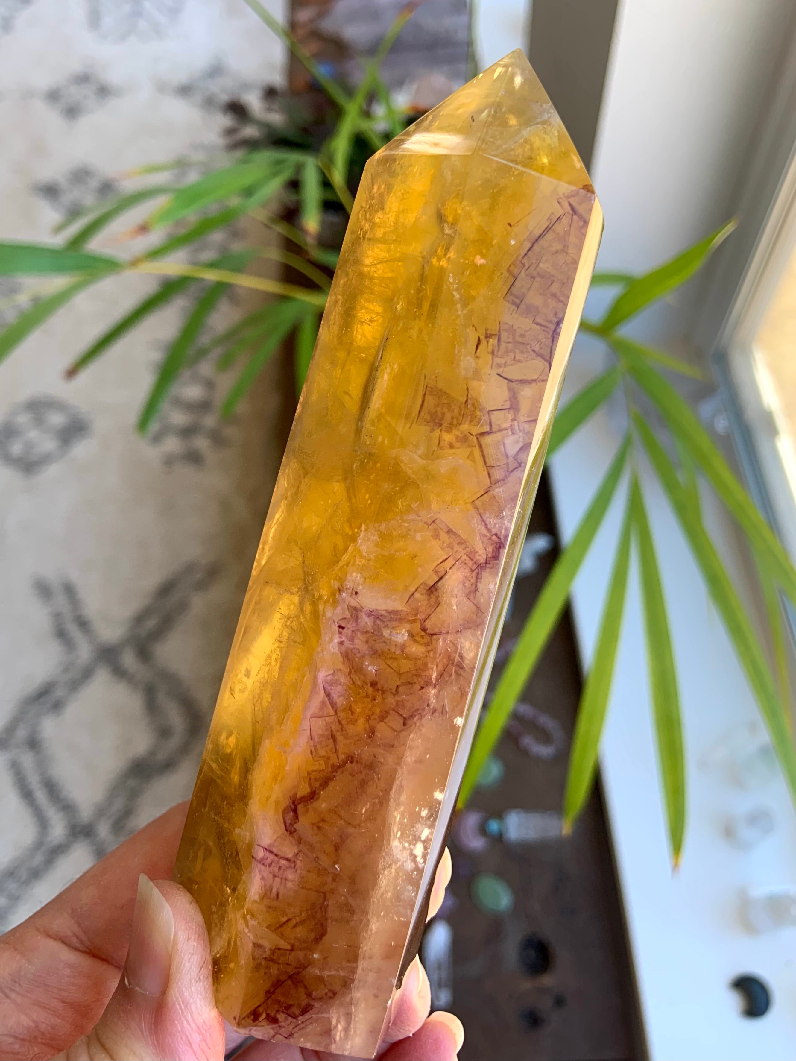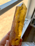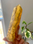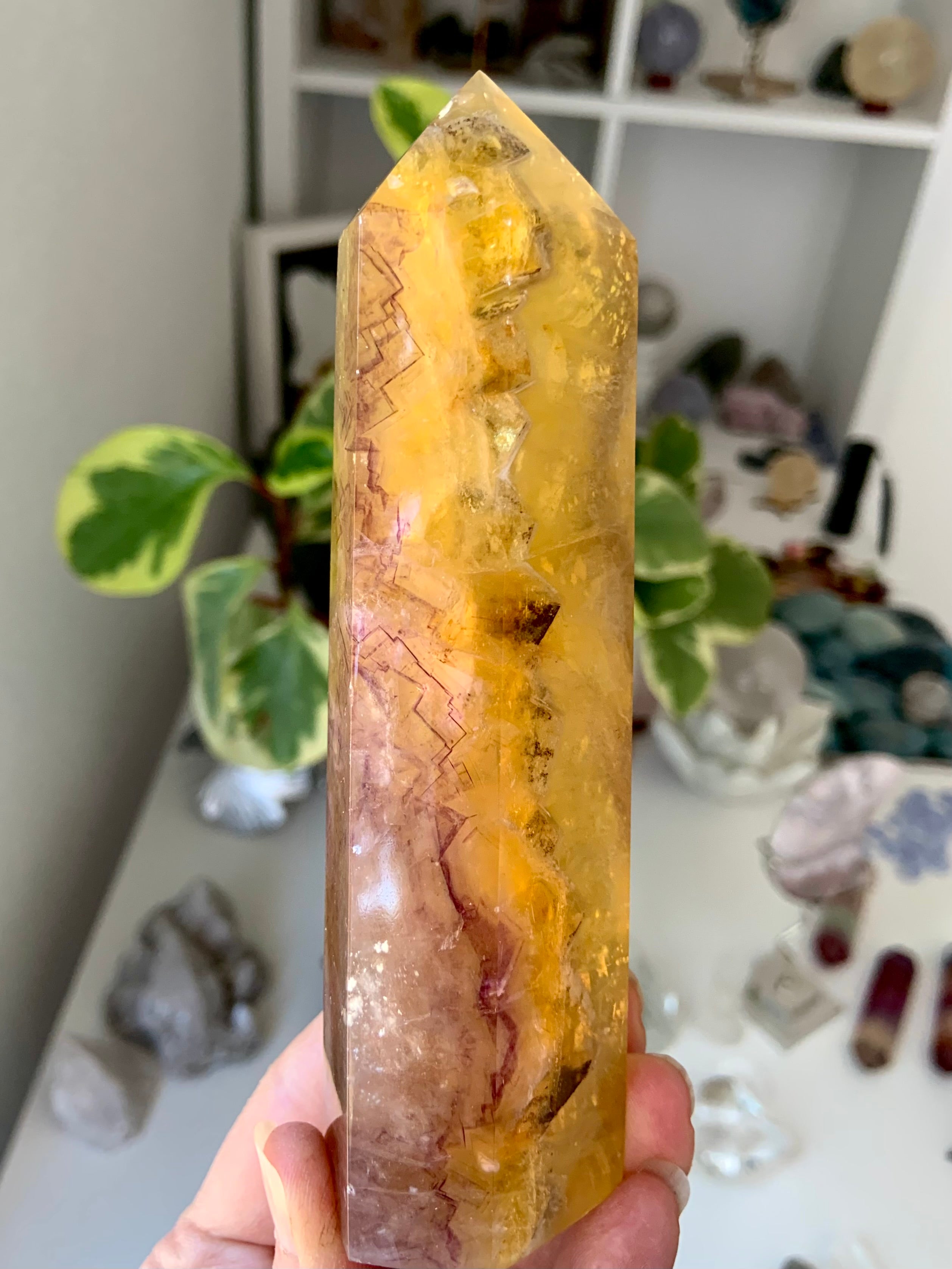 This richly saturated Yellow Fluorite Tower has a rare cubic phantom formations, plus sparkly flecks of mica inclusions + flashy rainbows throughout the polished crystal tower that shimmer in the light.